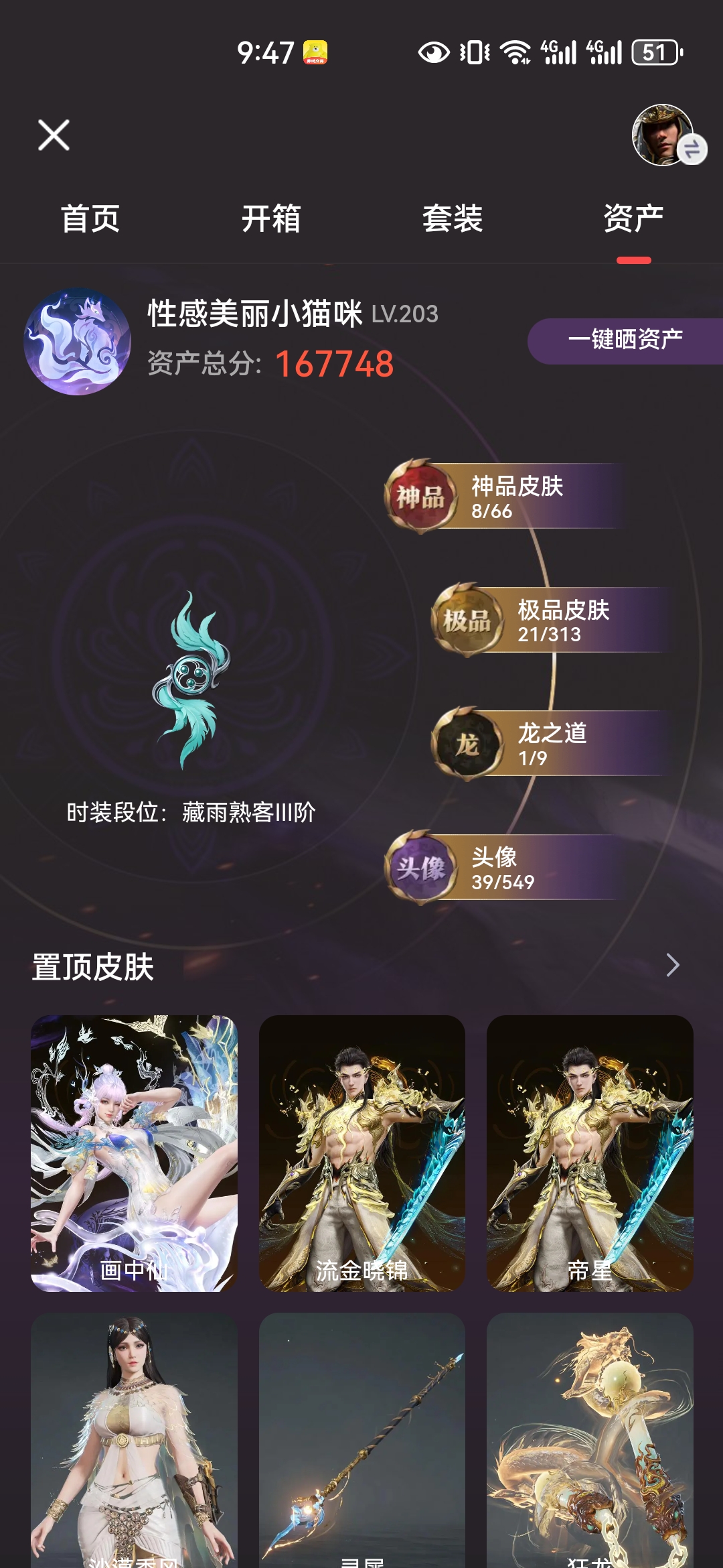 【游戏等级】203 8红 21金 1龙之道 画中仙 帝星【龙之道】龙之影·精武魂 【大区】国服 【排位】青铜ⅳ 【神品皮肤】画中仙 流金晓锦 帝星 沙漠香风 灵犀 狂龙 化生明王 天罚 【极品皮肤】祸津素盏 赤焰战灵 开辟鸿蒙·风雨谐 封神录·申公豹 浣烟纱 街头狂欢·涂鸦少女 街头狂欢·不败擂主 斗罗大陆·唐三 云溪仙子 游四海 新倩女幽魂·瑶光沐月 灵鹿巫者 麟鹿大铠 弘毅