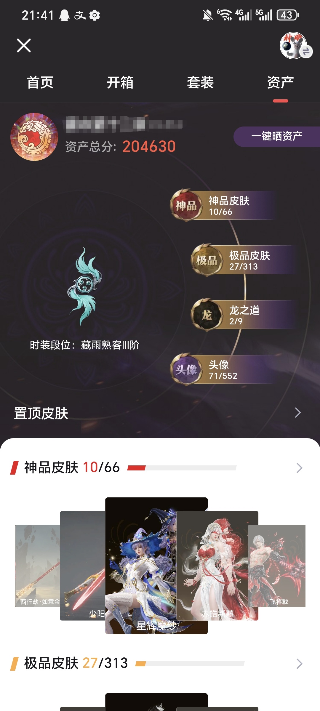 【游戏等级】316 10红 27金 2龙之道 飞将戟 金箍棒 【大区】国服【龙之道】龙之影·过江龙 龙之道·至纯 【排位】铂金ⅴ 【神品皮肤】星辉魔纱 赤皓新囍 飞将戟 西行劫·如意金箍棒 少阳剑 沙漠香风 凌霄之羽 狼主 狂龙 熛怒炼火 【极品皮肤】寿竹云春 开辟鸿蒙·风雨谐 开辟鸿蒙·金戈止 封神录·申公豹 封神录·姜子牙 楚韵九歌·山鬼 浣烟纱 天工奥妙 日影花阴 观山海