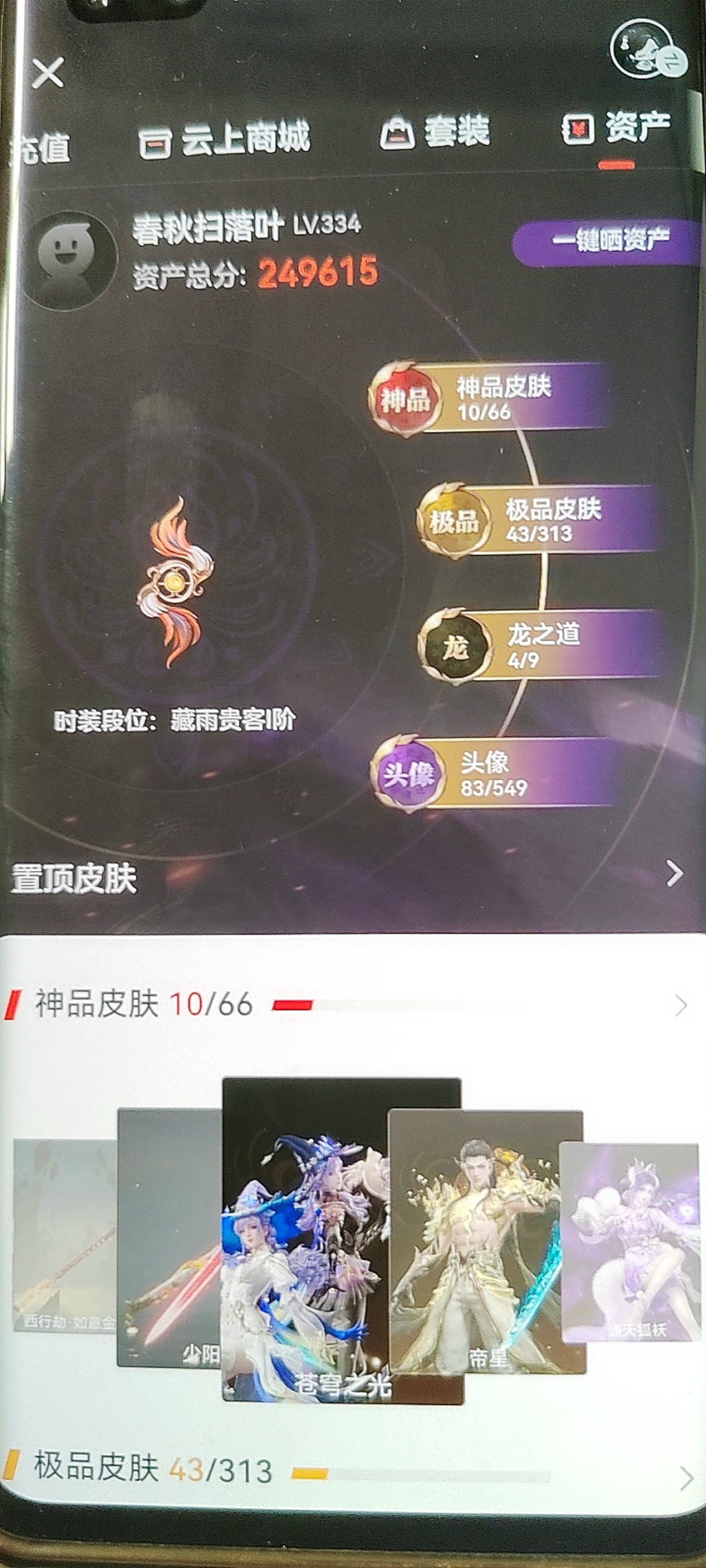 网易官服 已绑定手游 等级:334 10红皮43金皮 【红皮】 苍穹之光五眼铳皮肤 帝星横刀皮肤 通天狐袄玉玲珑皮肤 西行劫·金箍棒棍皮肤 少阳剑长剑皮肤 泣珠龙纱崔三娘皮肤 狼主阔刀皮肤 狂龙双节棍皮肤 化生明王天海皮肤 天罚火炮皮肤 【金皮】 斗罗大陆·唐三 夏日派对·高校水着 观山海·冬神玄冥 观山海·青鸟 绮云衫 观山海·秋神蓐收