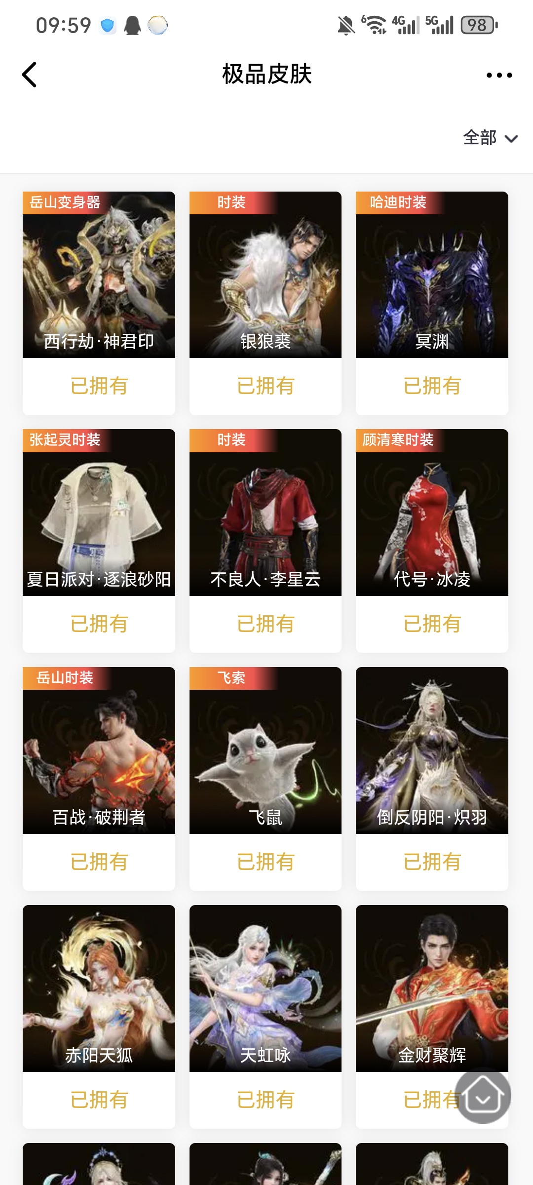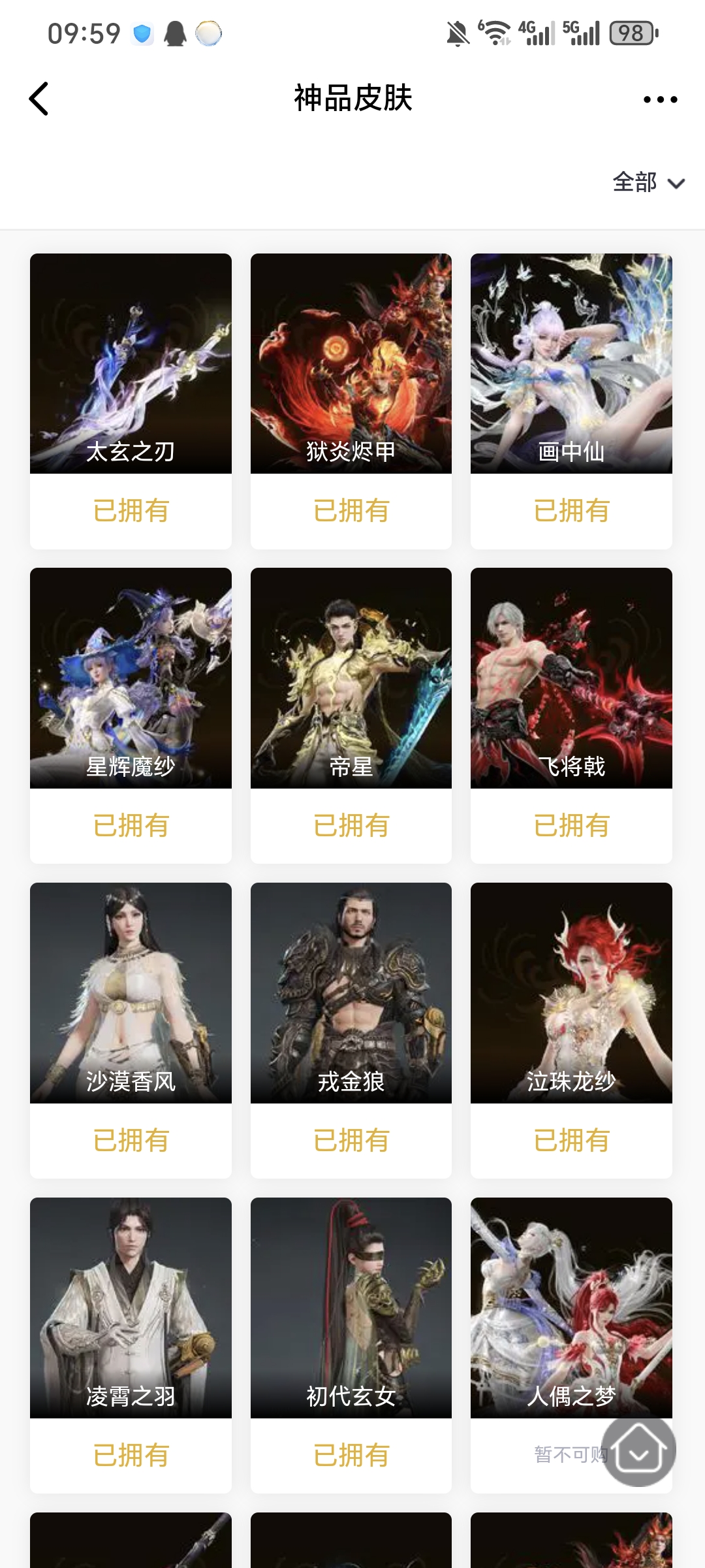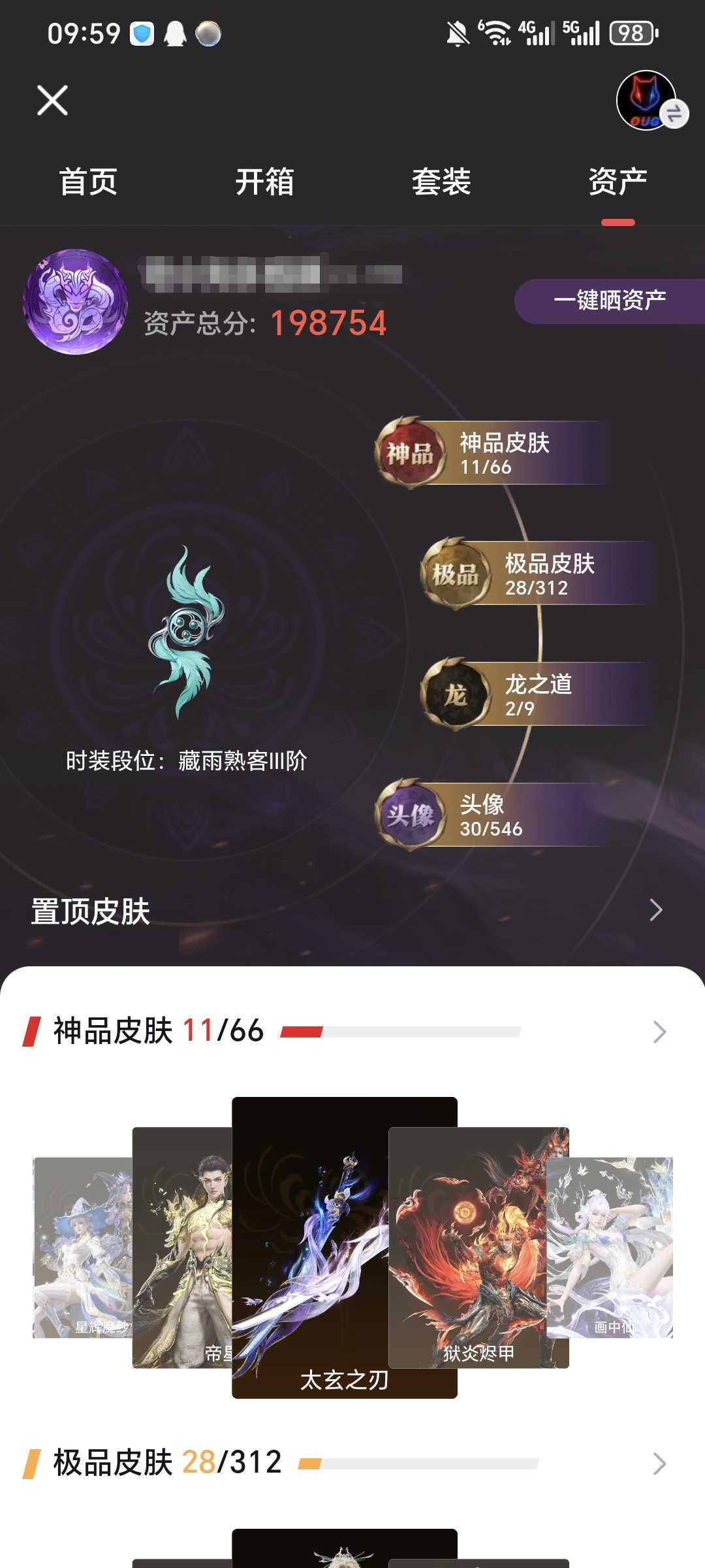 【游戏等级】198 11红 28金 2龙之道 太玄之刃 画中仙 帝星 飞将戟【龙之道】龙之影·过江龙 龙之影·龙虎斗 【大区】国服 【排位】黄金ⅱ 【神品皮肤】太玄之刃 狱炎烬甲 画中仙 星辉魔纱 帝星 飞将戟 沙漠香风 戎金狼 泣珠龙纱 凌霄之羽 初代玄女 【极品皮肤】倒反阴阳·炽羽 赤阳天狐 天虹咏 金财聚辉 开辟鸿蒙·风雨谐 开辟鸿蒙·日月明 开辟鸿蒙·金戈止 封神录·申