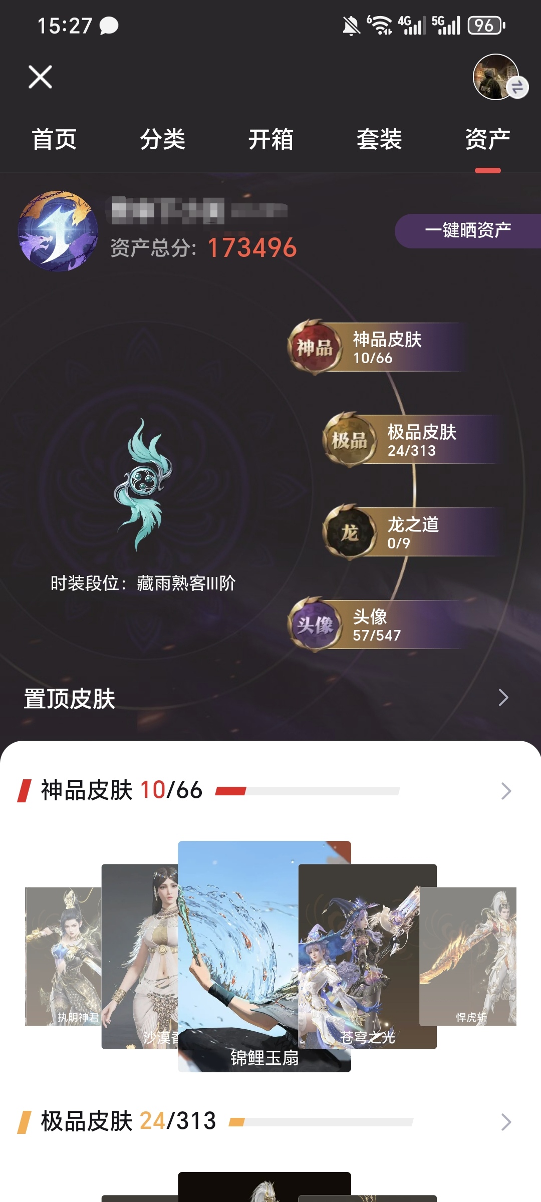 【游戏等级】229 10红 24金 锦鲤玉扇 悍虎斩 【大区】国服【排位】黄金ⅲ【神品皮肤】锦鲤玉扇 苍穹之光 悍虎斩 执明神君 沙漠香风 狂龙 天罚 初代玄女 熛怒炼火 毕方 【极品皮肤】开辟鸿蒙·金戈止 护世四法·持国天王 护世四法·多闻天王 封神录·申公豹 浣烟纱 街头狂欢·不败擂主 夏日派对·仲夏霜华 斗罗大陆·唐三 夏日派对·高校水着 观山海·冬神玄冥 观山海·秋神蓐