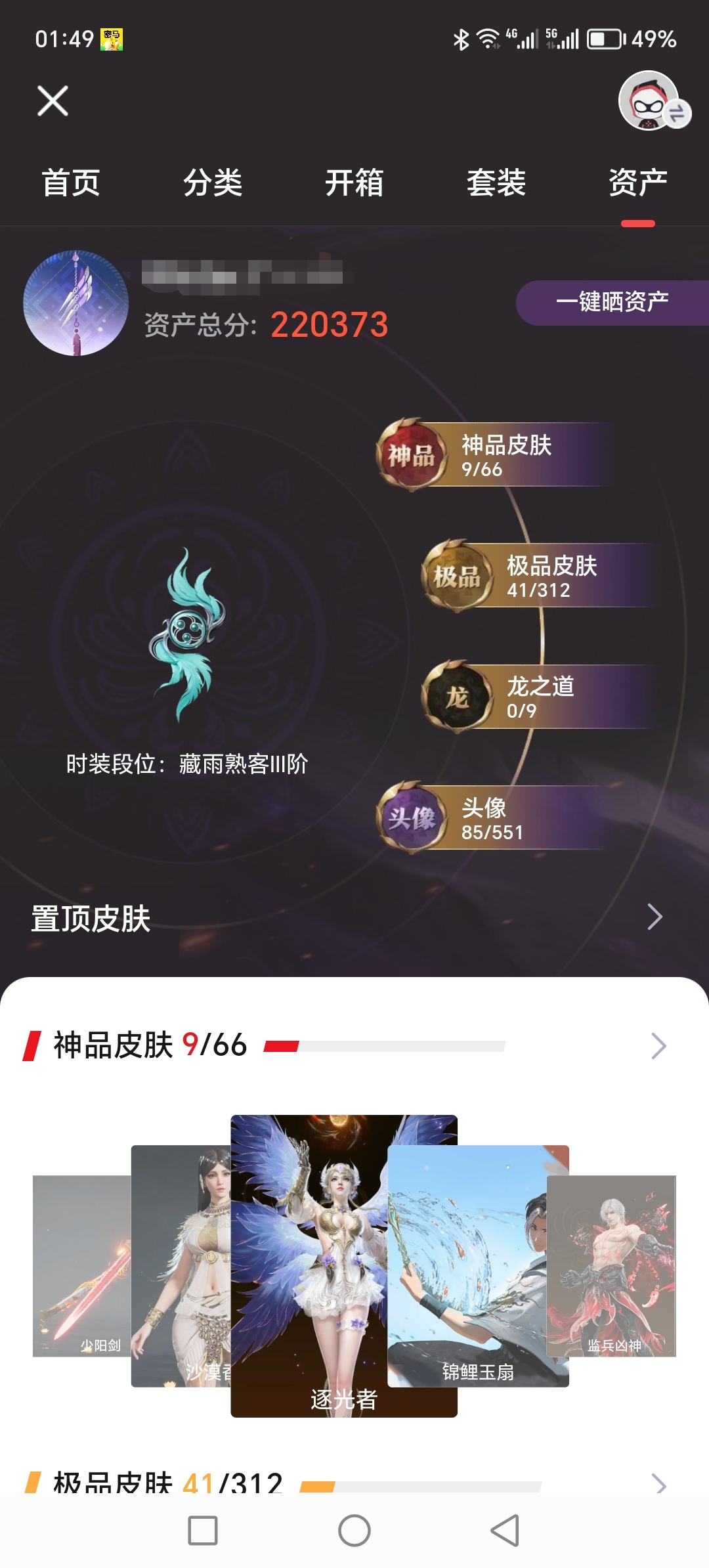 【9红 41金 锦鲤玉扇 监兵凶神】【游戏等级】405 【大区】国服 【排位】陨星ⅳ 【神品皮肤】逐光者 锦鲤玉扇 监兵凶神 少阳剑 沙漠香风 泣珠龙纱 化生明王 蝶梦 冰魄 【极品皮肤】开辟鸿蒙·风雨谐 护世四法·广目天王 封神录·申公豹 封神录·姜子牙 观山海·相柳 楚韵九歌·湘夫人 楚韵九歌·云中君 天工奥妙 斗罗大陆·唐三 观山海·冬神玄冥 观山海·青鸟 绮云衫 观山海
