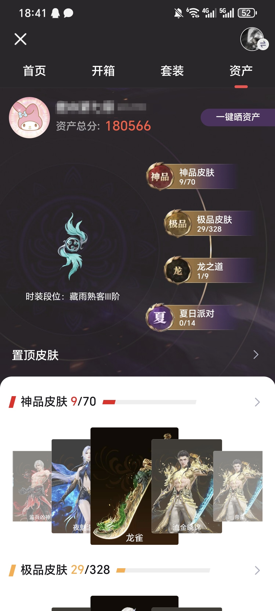 【9红 29金 1龙之道 监兵凶神 帝星 夜魅游莹】【游戏等级】218【大区】国服【排位】黄金ⅳ【龙之道】龙之影·过江龙 【神品皮肤】龙雀 流金晓锦 帝星 监兵凶神 夜魅游莹 沙漠香风 狼主 化生明王 海之奇 【极品皮肤】天虹咏 开辟鸿蒙·金戈止 封神录·申公豹 封神录·姜子牙 浣烟纱 街头狂欢·涂鸦少女 街头狂欢·不败擂主 日影花阴 紫微星命 九骊之君 击浪 御宅罗梦 游四海