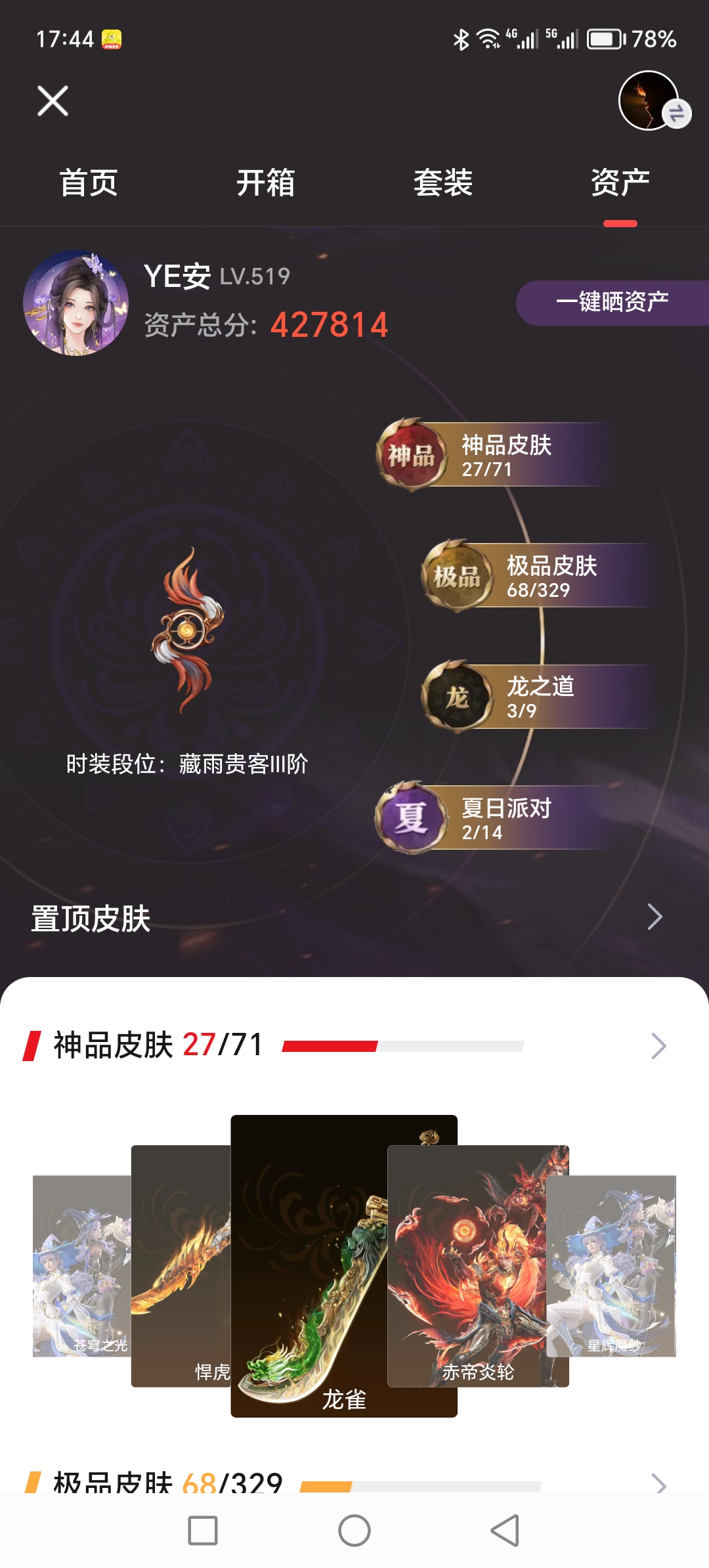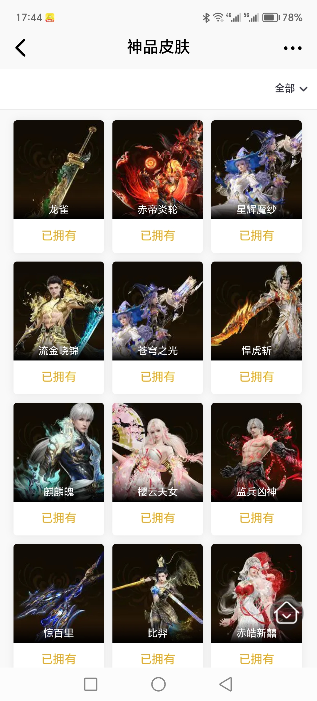【27红 68金 3龙之道 悍虎斩 麒麟魄 监兵凶神 惊白里 天琼 如意金箍棒 通天狐妖】 【神品皮肤】 天罚 初代玄女 嫖怒炼火 天琼 通天狐袄 西行劫·如意金箍棒 少阳剑 沙漠香风 戎金狼 灵犀 狂龙 绝代风华 化生明王 海之奇 蝶梦 龙雀 赤帝炎轮 星辉魔纱流金晓锦 苍穹之光 悍虎斩 麒麟魄 樱云天女 监兵凶神 惊百里 比羿 赤皓新囍