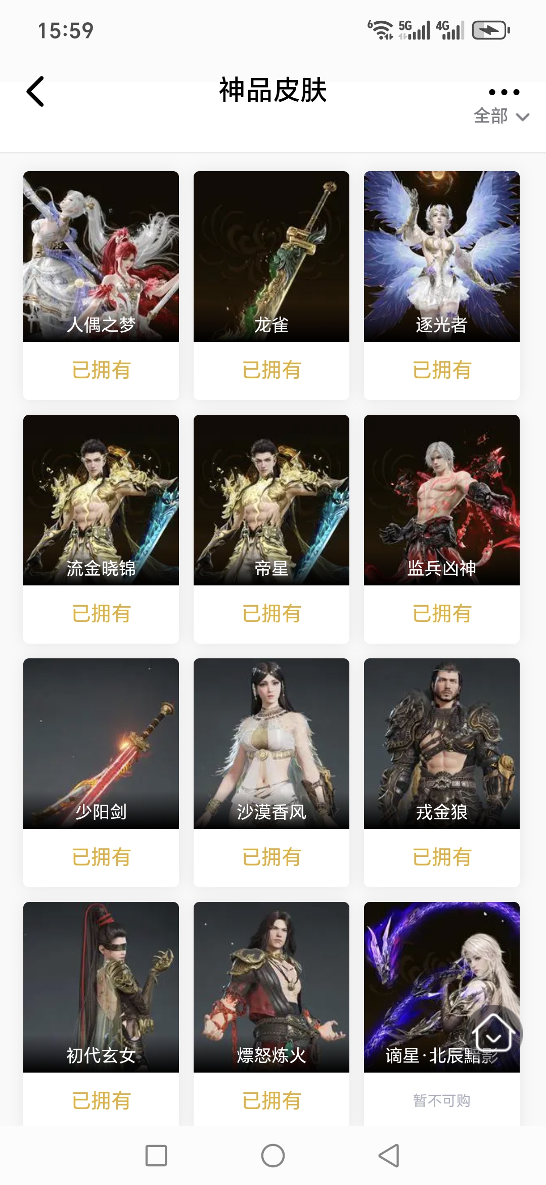 【11红 29金 人偶之梦 帝星 监兵凶神 流金晓锦 少阳剑 换绑时间12.27】【神品皮肤】人偶之梦 逐光者 龙雀 流金晓锦 戎金狼 少阳剑 帝星 监兵凶神 沙漠香风 初代玄女 【极品皮肤】嫖怒炼火 银狼裘 逆水寒·鸢纱 信手斩龙 赤阳天狐 秋藏桂 开辟鸿家·日月明 寿竹云春 炎烈珠 不良人·李星云 湛卢 寒烟素 护世四法·持国天王 街头狂欢·不败擂主 开辟鸿蒙·金戈止 封