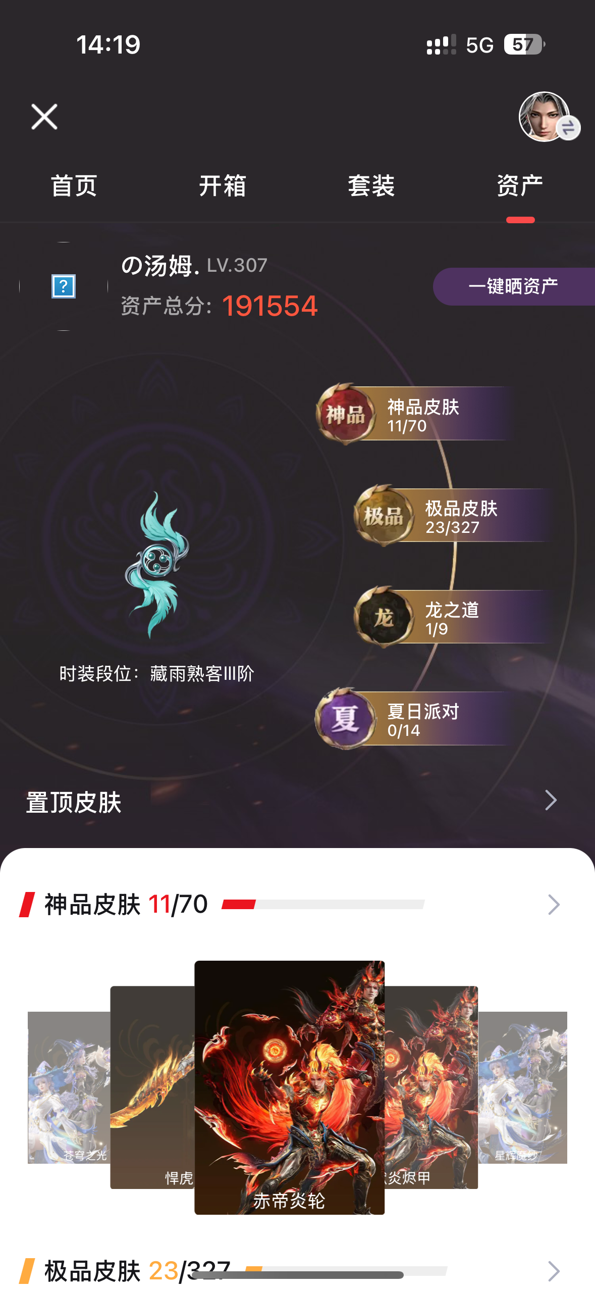 【11红 23金 1龙之道 帝星 苍穹之光 悍虎斩 换绑时间12.29】【游戏等级】307【大区】国服 【龙之道】龙之影·过江龙 【神品皮肤】狱炎烬甲 赤帝炎轮 星辉魔纱 苍穹之光 悍虎斩 帝星 守墨麒 赤皓新囍 少阳剑 泣珠龙纱 蝶梦 【极品皮肤】斗罗大陆·唐三 银狼裘 英雄袍 武道无穷·咏春 寒烟素 祸津素盏 金财聚辉 开辟鸿蒙·日月明 开辟鸿蒙·金戈止 封神录·申公豹