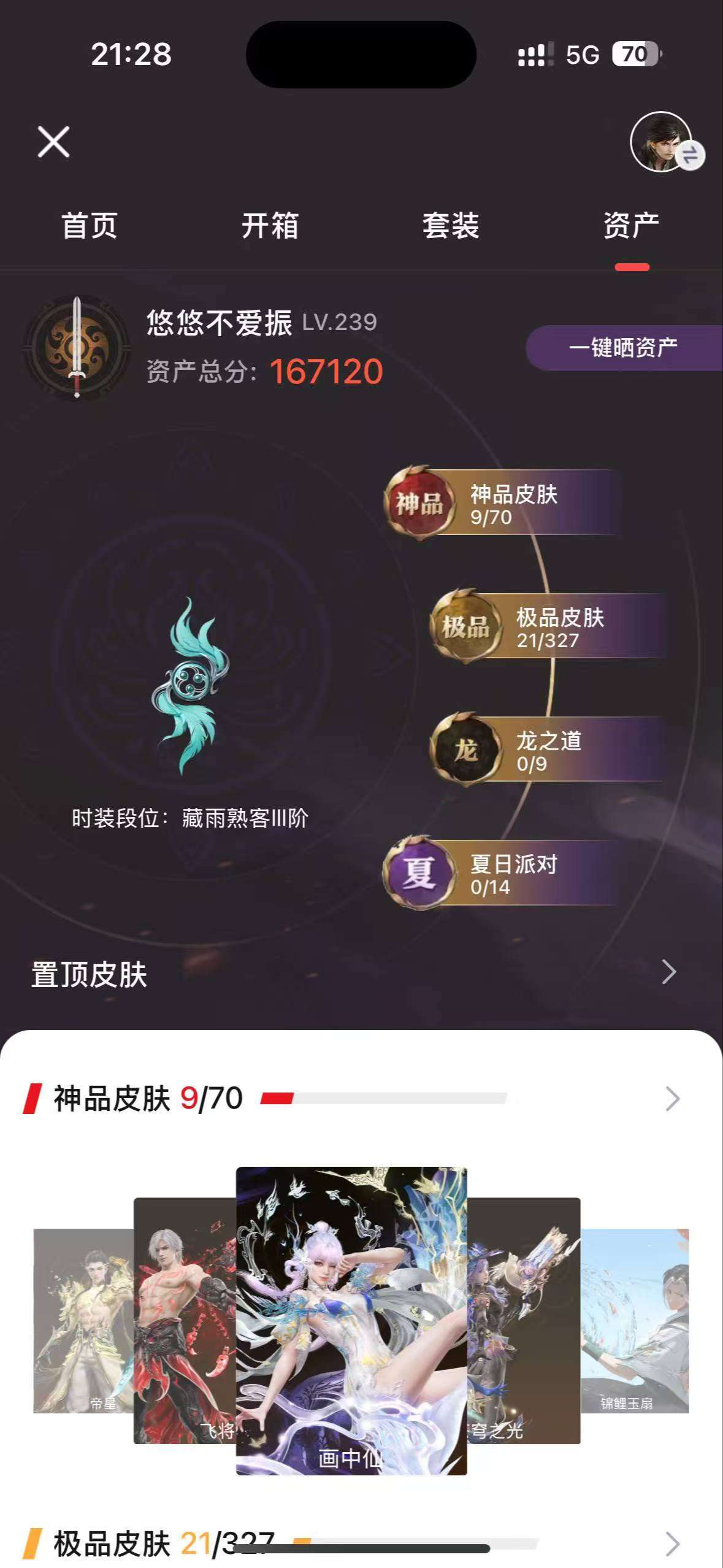 【游戏等级】26 【大区】正式服 【排位】lv.26 【神品皮肤】龙雀 星辉魔纱 帝星 赤皓新囍 夜魅游莹 沙漠香风 泣珠龙纱 【极品皮肤】暖冬茶馨 开辟鸿蒙·金戈止 护世四法·多闻天王 封神录·申公豹 日影花阴 斗罗大陆·唐三 碧水青天 西行劫·悟空 朝闻道 麟鹿大铠 玄青郁离 御宅罗梦 游四海 瀚海苍鹰 西行劫·紫衣仙子 龙之道·自知 寒烟素 【龙之道】龙之道·自知
