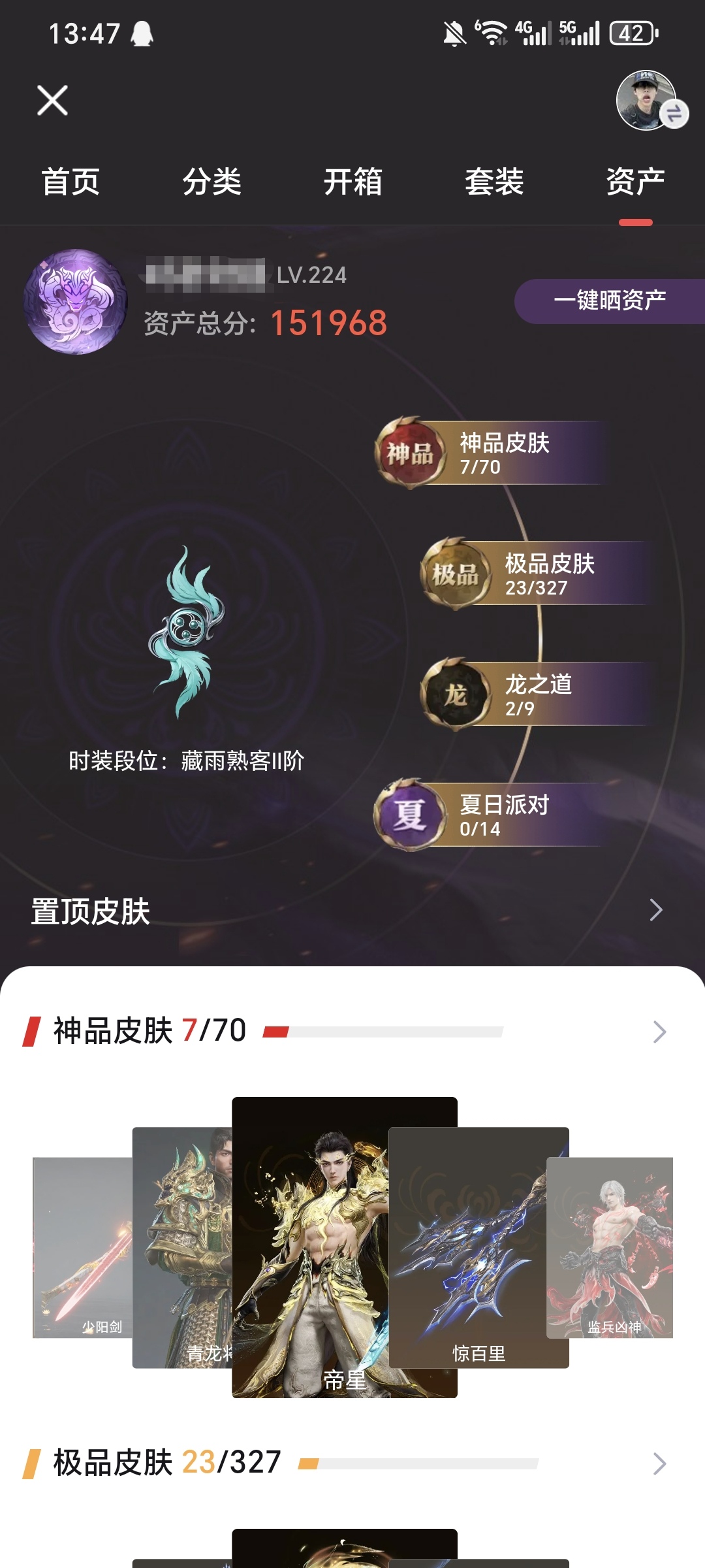 【7红 23金 2龙之道 帝星 惊百里 监兵凶神】【游戏等级】160【大区】国服【排位】白银ⅰ【神品皮肤】帝星 惊百里 监兵凶神 少阳剑 青龙将星 天罚 蝶梦【极品皮肤】赤阳天狐 祸津素盏 秋藏桂 开辟鸿蒙·风雨谐 开辟鸿蒙·日月明 赤焰战灵 开辟鸿蒙·金戈止 封神录·申公豹 封神录·姜子牙 楚韵九歌·山鬼 斗罗大陆·唐三 九骊之君 八宝龙王 狂猎 贵胄少女 新倩女幽魂·瑶光沐