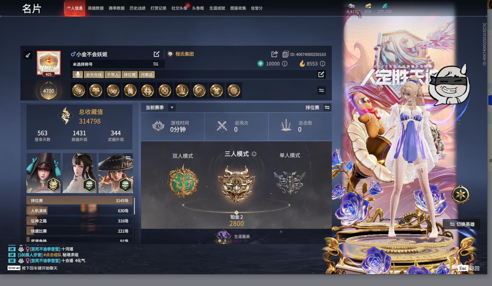 [15375390]yjj1217/2.5换绑/等级405/s19三人铂金2/19红473金收藏值314798/赤皓新囍/初代玄女/戎金狼/熛怒炼火/蝶梦/香雪水兰/绝代风华/沙漠香风/少阳剑/2674九阴/帝星/比羿/狼主/龙雀/飞将戟/如意金箍棒/锦鲤玉扇/狂龙/天罚/【技能奥义】/御祥云/荆魂 宁红夜:/赤皓新囍/初代玄女/昆仑之主/夜华朝/耀世魂花/碧水青天/簪缨发/双马尾女 沈妙:/悠竹萌客/絮云衣/腓腓/绮云衫/百灵发/娇憨发/韶光发/noir发型/双马尾女 天海:/觉明尊者/少林/八宝龙王 殷紫萍:/鹅黄纱梦/萍之缘/沐昭/瑶光沐月/紫芙发/暖绒发/双马尾女 特木尔:/戎金狼/唐三/追猎/沙狼之怒 季沧海:/熛怒炼火/街头烈火/鹧鸪天/夏神祝融/江海发/白狼发 胡桃:/蝶梦/小可/至纯/清雅少女/御宅罗梦/阴阳姬/月丹发/木棉发/月下香发/双马尾女 妖刀姬:/热海白珊/暗夜利刃/青枝瓷/神罚之光/纯真朋克/灼舞桃节 崔三娘:/巨鲸客/暗沼摩罗/汐泪/阿娜希塔/赤雾烟霞/探海裙/鲸海发/冷傲发/双马尾女 岳山:/弘毅袍/金戈止/铁面/过江龙/玄鳞发 无尘:/申公豹/幽篁山鬼/司天命/竹律发 顾清寒:/香雪水兰/紫微星命/禄运玉霄/赤丹朱湛/绯霜发/双马尾女 武田信中:/花之倾奇/烈武者 迦南:/绝代风华/沙漠香风/胡旋女/凛冬/蕾雅/观山海青鸟/瀚海苍鹰/浣烟纱/翔鸾发/青鸾发/双马尾女 胡为:/秋神蓐收/斑斓衣/行空裘/福瑞天泽/悟空/天刑发 季莹莹:/冬无归/冬神玄冥/炽火照夜/雾灼发/冥泉发/幽焰发/流萤发/双马尾女 玉玲珑:/丽娘/赤阳天狐/春不敛/广目天王/黄昏巫主/商月发/古溪发/惊雀发/双马尾女 哈迪:/天工奥妙/夜绸袍/秀逸发 魏轻:/念奴娇/獬豸/傲采发/双马尾女 张起灵:/山漠狞影/孤影戎装/云间影 席拉:/天虹咏/雪铃绮歌/蜜语发/双马尾女 蓝梦:/如梦令/牵云霞发/沉醉发/双马尾女 万钧:/雷行猎手/迅猛发/【挑染】雷霆客发/炽羽尘光发 拳刃:/毛乎乎/醒狮 长剑:/少阳剑/侠骨清光引/壶中日月/监星尺/赤霄/隐锋/2674超越型 太刀:/2674九阴/残阳/燎/金玉一文字 横刀:/帝星/比羿/尽春锋/烛泪/白鹿/雷厉 阔刀:/狼主/龙雀/听涛_/塑梦钥匙/山君怒/恶障/斩银河/朔方之刃/珊海之刃/紫色琴键/青石猊/魂梦残响/龙蟠 斩马刀:/飞将戟/
