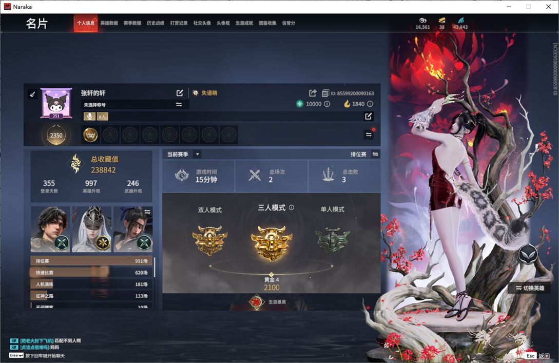 wj3875,网易有邮箱,2月10日可换绑,三人段位黄金4,11红,373金,声望9,夜蔷薇,少阳剑,太玄之刃,比羿,狂龙,苍穹之光,星辉魔纱,蝶梦,沙漠香风,监兵凶神,夜魅游莹,执明神君,自知,无拘,过江龙,午后瑰夏,仲夏霜华,盛夏白阳,赤夏悠漾,半夏晚风,绮夏幻梦,毛乎乎,紫金宝剑,湖女之剑,碧