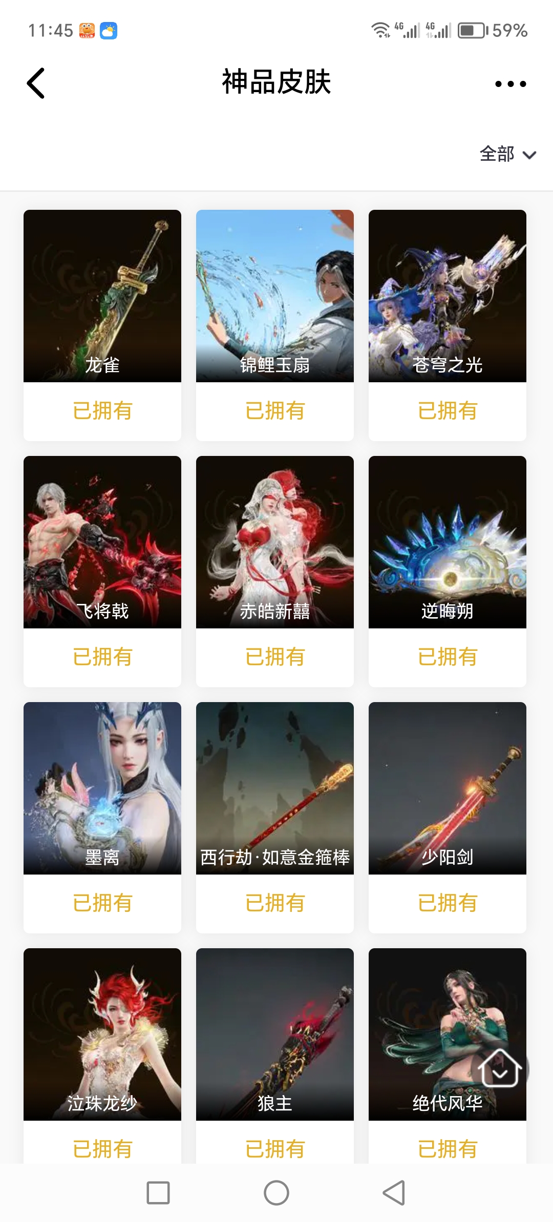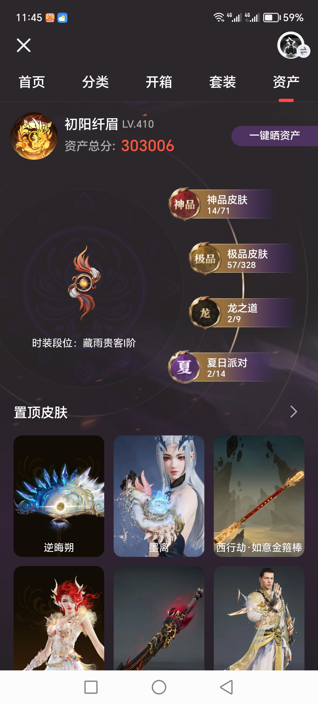 【14红 57金 2龙之道 锦鲤玉扇 如意金箍棒 飞将戟】【游戏等级】410【大区】国服【神品皮肤】龙雀 锦鲤玉扇 苍穹之光 飞将戟 赤皓新囍 墨离 西行劫·如意金箍棒 少阳剑 逆晦朔 泣珠龙纱 狼主 绝代风华 化生明王 熛怒炼火【极品皮肤】夏日派对·高校水着 斗罗大陆·唐三 藏雨阁主 观山海·冬神玄冥 夏日派·半夏晚风 观山海·青鸟 绮云衫 巨鲸客 观山海·秋神蓐收 司天命
