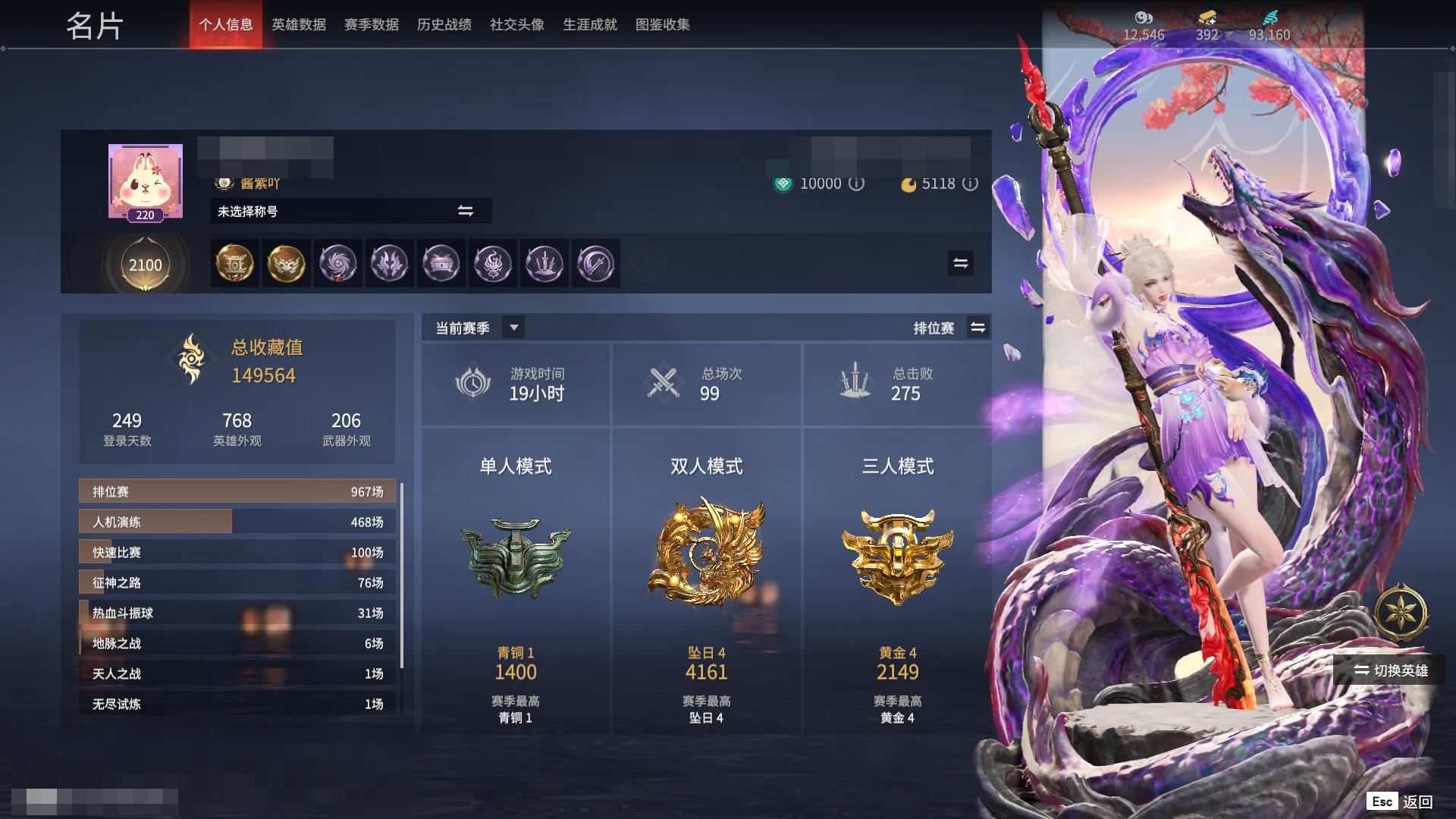 [3890096]【网易手机】收藏值:149564 红皮数: 6 金皮数量: 249 英雄外观数: 768 武器外观数: 206 等级: 220 幻丝数: 93160 红皮及战旗皮: 绝代风华迦南皮肤蝶梦胡桃皮肤狂龙双节棍皮肤化生明王天海皮肤通天狐袄玉玲珑皮肤监兵凶神胡为皮肤 季沧海金皮: 游四海巨阙 宁红叶金皮: 碧水青天九阴圣女夜华朝 天海金皮: 八宝龙王武道无穷·少林 妖刀姬金皮: 妖刀姬阴阳师·灼舞桃节千秋匠心·青枝瓷 长剑金皮: 含光承影赤霄西行劫·紫金宝剑复制体·月光与黑暗监星尺隐锋2674·原型亢龙 横刀金皮: 烛泪 太刀金皮: 雷赐数珠丸 扇金皮: 樱落耀夜流华