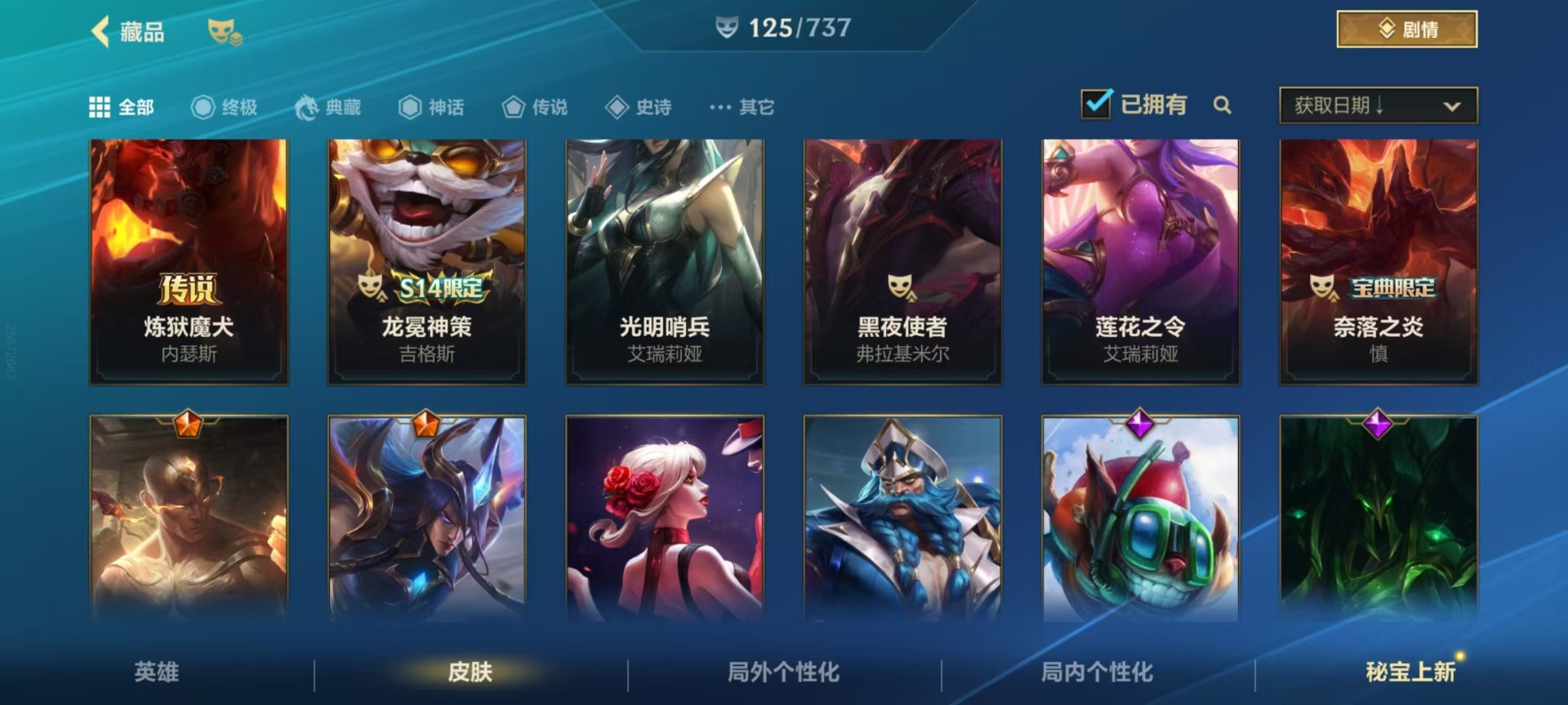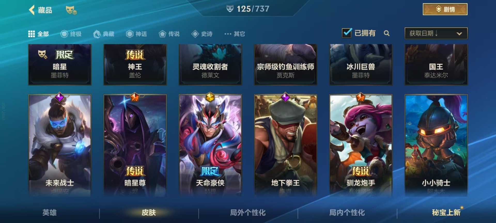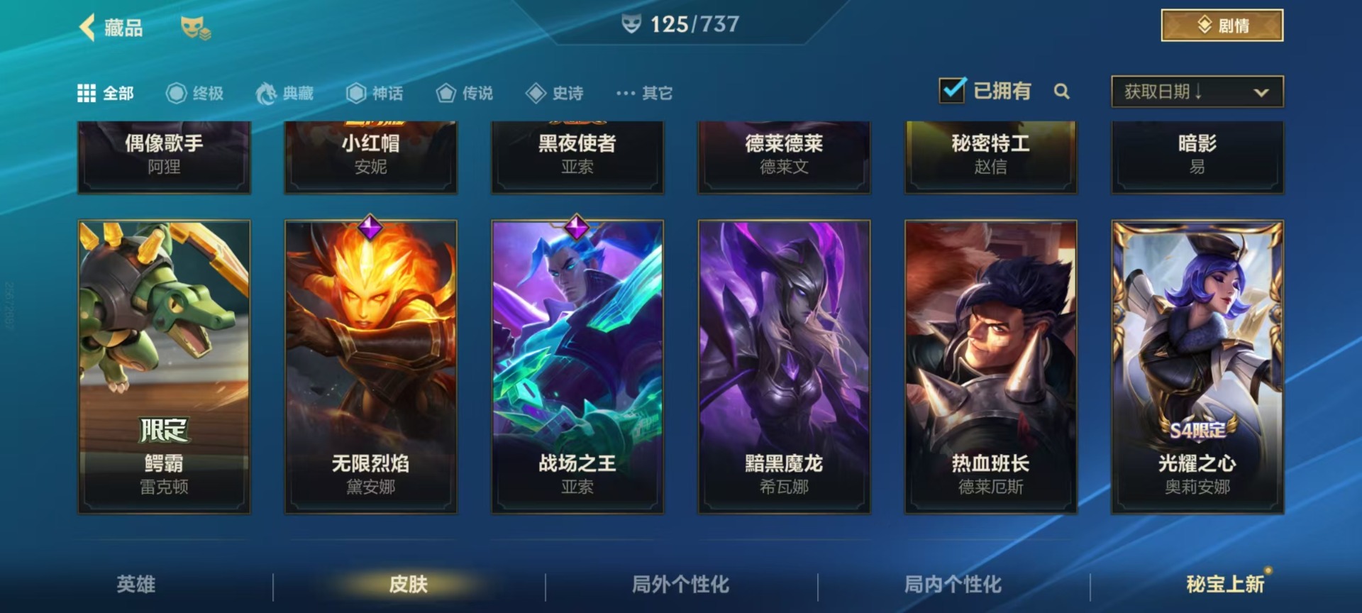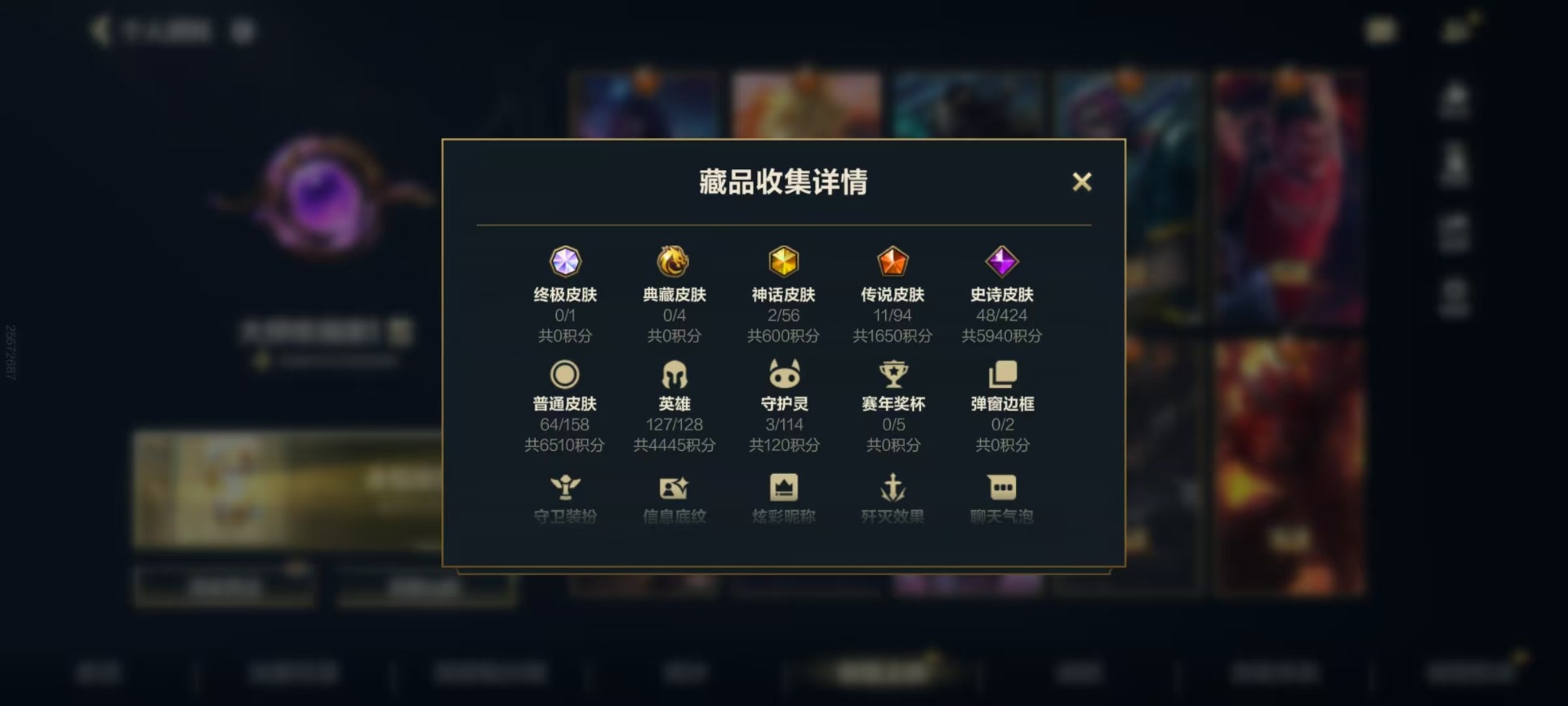 可二次 可修改实名 段位:黑铁 1神话 11传说 48史诗 125皮肤 127英雄 钻石 皮肤:盖伦-神王盖伦-海上霸主盖伦-死亡骑士盖伦-钢铁军团蔚-女警官蔚-双城之战蔚-燎原烈焰蔚-源计划:裁决易-灵魂莲华易-持胡萝卜的雪人易-灵能特工易-暗影内瑟斯-炼狱魔犬内瑟斯