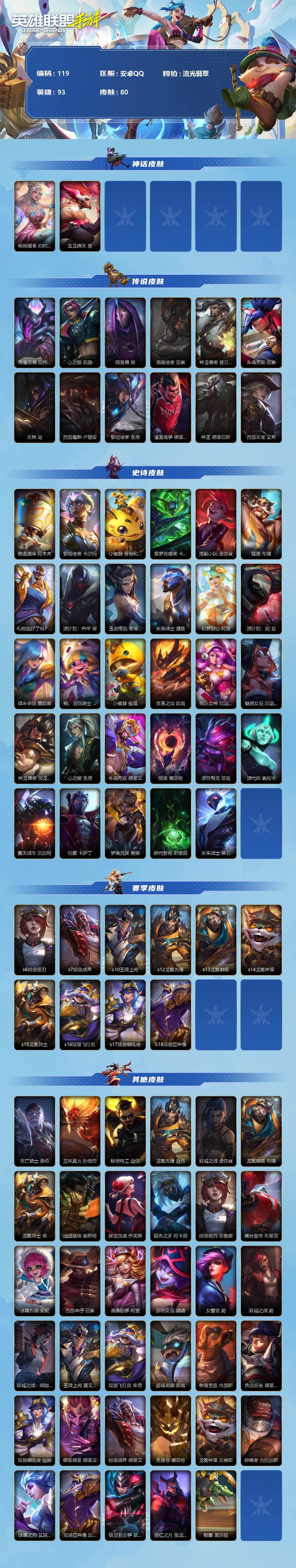【商品标题】:93英雄-80皮肤 【神话皮肤】:桃映暖春 灼灼芳菲 拉克丝,玄龙绛天 易 【传说皮肤】:海魔至尊 亚托克斯,心之钢 凯隐,暗星尊 烬,黑夜使者 亚索,神龙尊者 昼日真龙 亚索,斗魂无双 亚索,天煞 劫,西部魔影 卢锡安,黎明使者 永恩,灌篮高手 德莱厄斯,神王 德莱厄斯,西部天使 艾希 【史诗皮肤】:劲道美味 阿木木,黎明使者 卡尔玛,小蜜蜂 努努和威朗普,猎梦吞噬者 卡兹克,清剿小队 金克丝,猛虎 布隆,礼物选好了吗? 布隆,源计划:升华 烬,玉剑传说 苍鸾 莫甘娜,未来战士 潘森,幻梦甜心 阿狸,源计划:阴 劫,战斗学院 蕾欧娜,我,羽饰骑士 崔丝塔娜,小蜜蜂 提莫,奈落之炎 凯南,电玩女神 厄运小姐,魅惑女巫 厄运小姐,神龙尊者 炎龙 瑟提,心之钢 永恩,斗魂无双 德莱文,暗星 墨菲特,虚空海灵 菲兹,源代码 索拉卡,霸天战车 厄加特,伯爵 卡萨丁,梦境灵探 赛娜,绝代智将 斯维因,未来战士 锤石 【赛季皮肤】:s6绯金丽刃,s7绯金战斧,s10王牌上将,s12龙冕先锋,s13龙冕御盾,s14龙冕神策,s15龙冕异士,s16冠翎飞行员,s17冠翎御风使,s18冠翎巨神像 【其他皮肤】:死亡骑士 盖伦,三昧真火 孙悟空,秘密特工 赵信,龙冕先锋 赵信,双城之战 金克丝,龙冕御盾 布隆,龙冕异士 烬,赌侠 崔斯特,探戈灵魂 伊芙琳,银色之牙 阿卡丽,绯金丽刃 菲奥娜,擂台皇帝 布里茨,冰霜烈焰 安妮,西部牛仔 亚索,偶像歌手 阿狸,邪恶女巫 璐璐,女警官 蔚,双城之战 蔚,双城之战:破枷 蔚,王牌上将 嘉文四世,冠翎飞行员 库奇,超级英雄 凯南,单身贵族 内瑟斯,热血班长 德莱厄斯,冠翎御风使 迦娜,德莱德莱 德莱文,绯金战斧 德莱文,无畏号 墨菲特,龙冕神策 吉格斯,碎桶者 古拉加斯,冰霜之刃 艾瑞莉娅,冠翎巨神像 加里奥,铁血狙击手 凯特琳,腥红之月 鬼武者 慎,鳄霸 雷克顿
