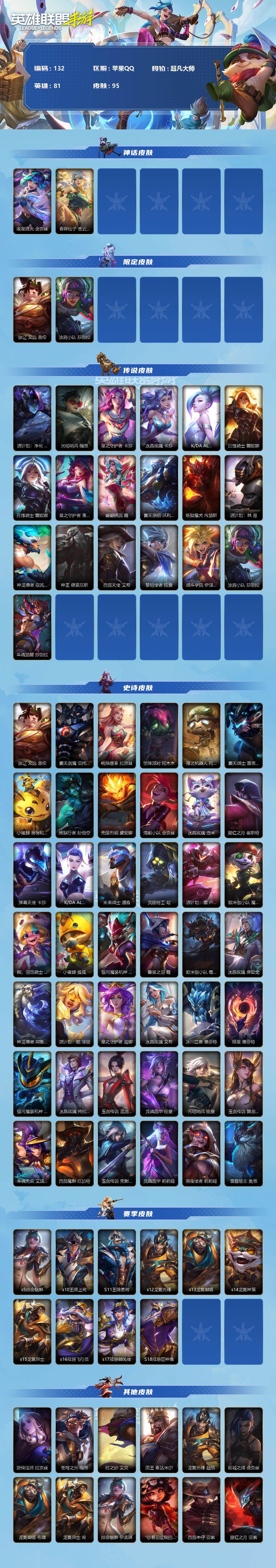 【商品标题】:81英雄-95皮肤 【神话皮肤】:夜星流火 金克丝,春晖仙子 苍云缥缈 卡莎 【限定皮肤】:张辽 文远 盖伦,涂鸦小队 莎弥拉 【传说皮肤】:源计划:净化 薇恩,光明哨兵 薇恩,星之守护者 卡莎,水晶玫瑰 卡莎,k/da all out 萨勒芬妮,日蚀骑士 蕾欧娜,月蚀骑士 蕾欧娜,星之守护者 落 霞,翩翩绣蕊 霞,霸天原祖 沃利贝尔,炼狱魔犬 内瑟斯,源计划:林 易,神龙尊者 驭风啸龙 易,神王 德莱厄斯,西部天使 艾希,黎明使者 锐雯,战斗学院 伊泽瑞尔,涂鸦小队 莎弥拉,斗魂觉醒 莎弥拉 【史诗皮肤】:张辽 文远 盖伦,霸天剑魔 亚托克斯,桃映暖春 拉克丝,惊悚派对 阿木木,殇之机器人 阿木木,霸天战士 雷恩加尔,小蜜蜂 努努和威朗普,地狱行者 孙悟空,无限烈焰 黛安娜,清剿小队 金克丝,水晶玫瑰 悠米,腥红之月 崔斯特,弹幕天使 卡莎,k/da all out 卡莎,未来战士 潘森,灵能特工 劫,源计划:雷 卢锡安,欧米伽小队 魔鬼伞兵 崔丝塔娜,我,羽饰骑士 崔丝塔娜,小蜜蜂 提莫,银河魔装机神 希瓦娜,暮星之羽 霞,欧米伽小队 毒针狙击手 图奇,水晶玫瑰 佛耶戈,神龙尊者 均衡之龙 沃利贝尔,源计划:燃 泽丽,星之守护者 迦娜,水晶玫瑰 艾希,冰川巨兽 墨菲特,暗星 墨菲特,银河魔装机神 菲兹,水晶玫瑰 弗拉基米尔,玉剑传说 武剑仙 锐雯,灵魂莲华 锐雯,光明哨兵 锐雯,玉剑传说 舞剑仙 艾瑞莉娅,斗魂无双 艾瑞莉娅,西部魔影 厄加特,玉剑传说 无影 泰隆,灵魂莲华 莉莉娅,黑夜使者 莉莉娅,雷霆领主 奥恩 【赛季皮肤】:s5绯金魅影,s10王牌上将,s11王牌勇将,s12龙冕先锋,s13龙冕御盾,s14龙冕神策,s15龙冕异士,s16冠翎飞行员,s17冠翎御风使,s18冠翎巨神像 【其他皮肤】:游侠法师 拉克丝,苍穹之光 薇恩,时之砂 艾克,国王 泰达米尔,龙冕先锋 赵信,双城之战 金克丝,龙冕御盾 布隆,龙冕异士 烬,绯金魅影 伊芙琳,“你看见过我的熊猫吗?” 安妮,西部牛仔 亚索,腥红之月 亚索,游击队员 崔丝塔娜,铁拳执事 蔚,女警官 蔚,双城之战 蔚,王牌上将 嘉文四世,海牛骑手 库奇,冠翎飞行员 库奇,超武乾坤:电弧 凯南,西部牛仔 厄运小姐,女帝 厄运小姐,冠翎御风使 迦娜,极地女神 艾希,黑暗骑士 艾希,无畏号 墨菲特,龙冕神策 吉格斯,冰霜之刃 艾瑞莉娅,风执事 加里奥,冠翎巨神像 加里奥,王牌勇将 奥拉夫