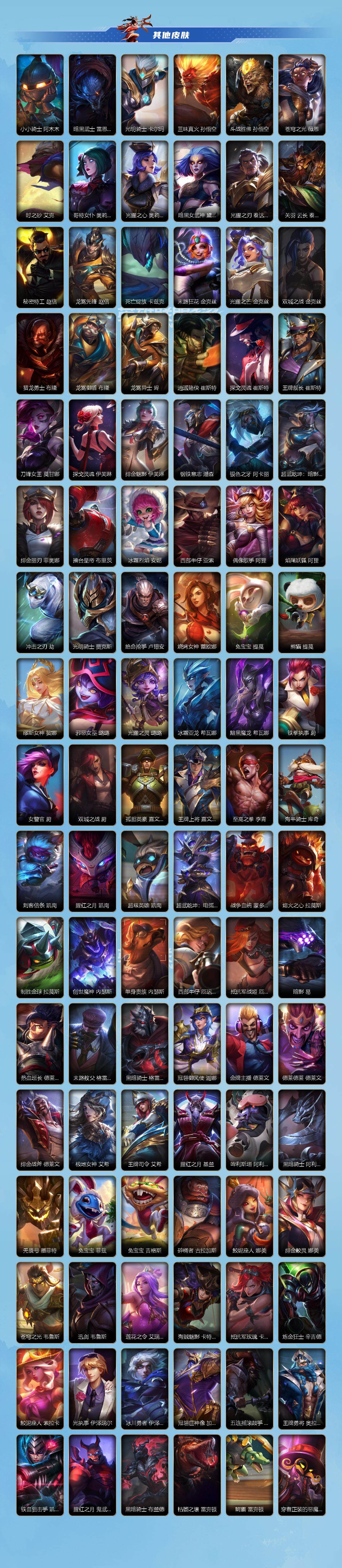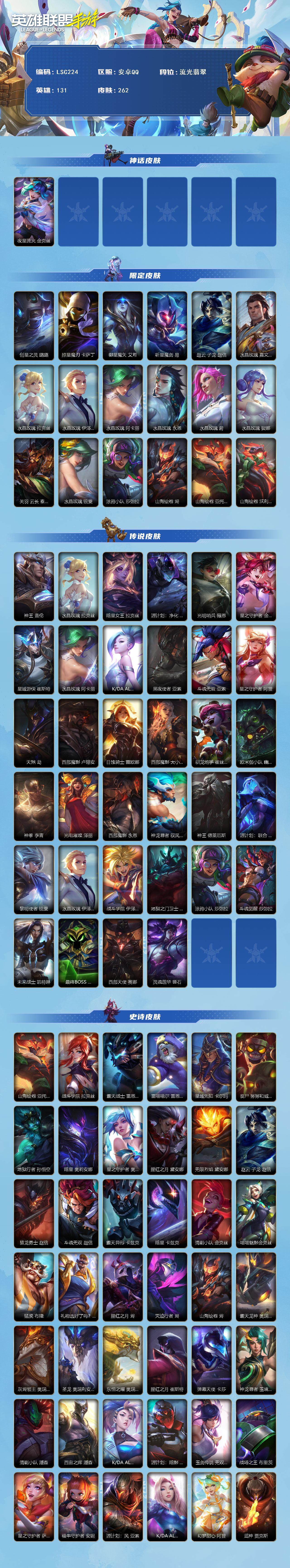 【lsc224】131英雄/262皮肤/流光翡翠/夜星流火 金克丝/创星之灵 璐璐/掠星魔刃 卡萨丁/御星魔矢 艾希/斩星魔剑 易/赵云 子龙 赵信/水晶玫瑰 嘉文四世/水晶玫瑰 拉克丝/水晶玫瑰 伊泽瑞尔/水晶玫瑰 阿卡丽/水晶玫瑰 永恩/水晶玫瑰 蔚/水晶玫瑰 娑娜/关羽 云长 泰达米尔/水晶玫瑰 锐雯/涂鸦小队 莎弥拉/山海绘卷 烬/山海绘卷 亚托克斯/山海绘卷 沃利贝尔/神王 盖伦/暗星女王 拉克丝/源计划:净化 薇恩/光明哨兵 薇恩/星之守护者 金克丝/星域游侠 崔斯特/k/da all out 萨勒芬妮/黑夜使者 亚索/斗魂无双 亚索/星之守护者 阿狸/天煞 劫/西部魔影 卢锡安/日蚀骑士 蕾欧娜/西部魔影 大小姐 蕾欧娜/驯龙炮手 崔丝塔娜/欧米伽小队 幽灵特工 提莫/神拳 李青/光电璀璨 泽丽/西部魔影 永恩/神龙尊者 驭风啸龙 易/神王 德莱厄斯/源计划:联合 艾希/黎明使者 锐雯/战斗学院 伊泽瑞尔/地狱之门卫士 加里奥/斗魂觉醒 莎弥拉/未来战士 凯特琳/最终boss 维迦/西部天使 赛娜/灵魂莲华 锤石/战斗学院 拉克丝/霸天战士 雷恩加尔/雷喵喵尔 雷恩加尔/星域先知 卡尔玛/丧尸 努努和威朗普/地狱行者 孙悟空/暗星 奥莉安娜/星之守护者 奥莉安娜/腥红之月 黛安娜/无限烈焰 黛安娜/猎龙勇士 赵信/斗魂无双 赵信/霸天异形 卡兹克/暗星 卡兹克/清剿小队 金克丝/喵喵魅影金克丝/猛虎 布隆/礼物选好了吗? 布隆/腥红之月 烬/灭迹行者 烬/霸天龙神 奥瑞利安·索尔/灰烬领主 奥瑞利安·索尔/圣龙 奥瑞利安·索尔/东恒之曜 奥瑞利安·索尔/腥红之月 崔斯特/弹幕天使 卡莎/神龙尊者 玉境灵龙 卡莎/清剿小队 潘森/西宙之晖 潘森/k/da all out 阿卡丽/源计划:暗影 阿卡丽/玉剑传说 无双 菲奥娜/战场之王 布里茨/星之守护者 萨勒芬妮/福牛守护者 安妮/源计划:风 亚索/k/da all out 阿狸/幻梦甜心 阿狸/武神 贾克斯/灵能特工 凯尔/源计划:雷 卢锡安/源计划:山 蕾欧娜/小恶魔 崔丝塔娜/娜就去看看 崔丝塔娜/大魔王 提莫/小蜜蜂 提莫/世界那莫大 提莫/驯龙女巫 璐璐/星之守护者 璐璐/太空律动 “节奏幻师” 璐璐/甜心之羽 霞/晨星之翎 洛/欧米伽小队 毒针狙击手 图奇/斗魂觉醒 格温/源代码 卡蜜尔/暗星 嘉文四世/福牛守护者 嘉文四世/柯基 库奇/冰封王子 蒙多医生/战地机甲 内瑟斯/太空律动 “狗头” 内瑟斯/电玩女神 厄运小姐/破败军团 厄运小姐/海之歌 泽丽/西部魔影 德莱厄斯/福牛守护者 德莱厄斯/禁卫机甲 格雷福斯/绝命机甲 格雷福斯/光焰澎湃 格雷福斯/星之守护者 迦娜/破败军团 德莱文/斗魂无双 德莱文/神龙尊者 苍龙 艾希/福牛守护者 阿利斯塔/霸天巨兽 墨菲特/冰川巨兽 墨菲特/银河魔装机神 菲兹/虚空海灵 菲兹/绒毛 菲兹/欧米伽小队 鬼影蛙人 菲兹/电玩勇者 锐雯/白色死神 韦鲁斯/暗星 韦鲁斯/玉剑传说 舞剑仙 艾瑞莉娅/西部天使 艾瑞莉娅/光明哨兵 艾瑞莉娅/源计划:雄心 卡特琳娜/死亡誓约 卡特琳娜/战斗学院 卡特琳娜/冬境仙灵 索拉卡/源代码 索拉卡/睡衣守护者 伊泽瑞尔/地狱火 加里奥/神龙守卫 加里奥/战斗学院 阿克尚/神奇先驱 杰斯/灵能特工 莎弥拉/泳池派对 凯特琳/踏春来 凯特琳/灵魂烈焰 布兰德/神龙尊者 魔龙 布兰德/泳池派对 雷克顿/我,怒角 维迦/冰糖葫芦 维迦/怨之砂 派克/西部魔影 锤石/盗梦暗影 锤石/光灵永燃 锤石/宇航员 诺提勒斯/黑夜使者 莉莉娅/魅惑女巫 薇古丝/s1光耀之刃/s2光耀之芒/s3光耀之灵/s4光耀之心/s5绯金魅影/s6绯金丽刃/s7绯金战斧/s8绯金鮫灵/s9王牌舰长/s10王牌上将/s11王牌勇将/s11王牌司令/s12龙冕先锋/s13龙冕御盾/s15龙冕异士/s17冠翎御风使/s18冠翎巨神像/小小骑士 阿木木/暗黑武士 雷恩加尔/光明骑士 卡尔玛/三昧真火 孙悟空/斗战胜佛 孙悟空/苍穹之光 薇恩/时之砂 艾克/哥特女仆 奥莉安娜/光耀之心 奥莉安娜/暗黑女武神 黛安娜/光耀之刃 泰达米尔/秘密特工 赵信/龙冕先锋 赵信/死亡绽放 卡兹克/末路狂花 金克丝/光耀之芒 金克丝/双城之战 金克丝/猎龙勇士 布隆/龙冕御盾 布隆/龙冕异士 烬/赌侠 崔斯特/探戈灵魂 崔斯特/王牌舰长 崔斯特/刀锋女王 莫甘娜/探戈灵魂 伊芙琳/绯金魅影 伊芙琳/钢铁意志 潘森/银色之牙 阿卡丽/超武乾坤:暗影 阿卡丽/绯金丽刃 菲奥娜/擂台皇帝 布里茨/冰霜烈焰 安妮/西部牛仔 亚索/偶像歌手 阿狸/焰尾妖狐 阿狸/冲击之刃 劫/光明骑士 贾克斯/绝命呛手 卢锡安/烧烤女神 蕾欧娜/兔宝宝 提莫/熊猫 提莫/缪斯女神 娑娜/邪恶女巫 璐璐/光耀之灵 璐璐/冰霜亚龙 希瓦娜/黯黑魔龙 希瓦娜/铁拳执事 蔚/女警官 蔚/双城之战 蔚/孤胆英豪 嘉文四世/王牌上将 嘉文四世/至高之拳 李青/海牛骑手 库奇/刺客信条 凯南/腥红之月 凯南/超级英雄 凯南/超武乾坤:电弧 凯南/战争血统 蒙多医生/熔火之心 拉莫斯/制胜金球 拉莫斯/创世魔神 内瑟斯/单身贵族 内瑟斯/西部牛仔 厄运小姐/抵抗军战姬 厄运小姐/暗影 易/热血班长 德莱厄斯/末路教父 格雷福斯/黑暗骑士 格雷福斯/冠翎御风使 迦娜/金牌主播 德莱文/德莱德莱 德莱文/绯金战斧 德莱文/极地女神 艾希/王牌司令 艾希/腥红之月 基兰/哞利斯塔 阿利斯塔/黑暗骑士 阿利斯塔/无畏号 墨菲特/兔宝宝 菲兹/兔宝宝 吉格斯/碎桶者 古拉加斯/鲛妮座人 娜美/绯金鲛灵 娜美/苍穹之光 韦鲁斯/迅箭 韦鲁斯/莲花之令 艾瑞莉娅/海贼魅影 卡特琳娜/抵抗军玫瑰 卡特琳娜/炼金狂士 辛吉德/蕉泥