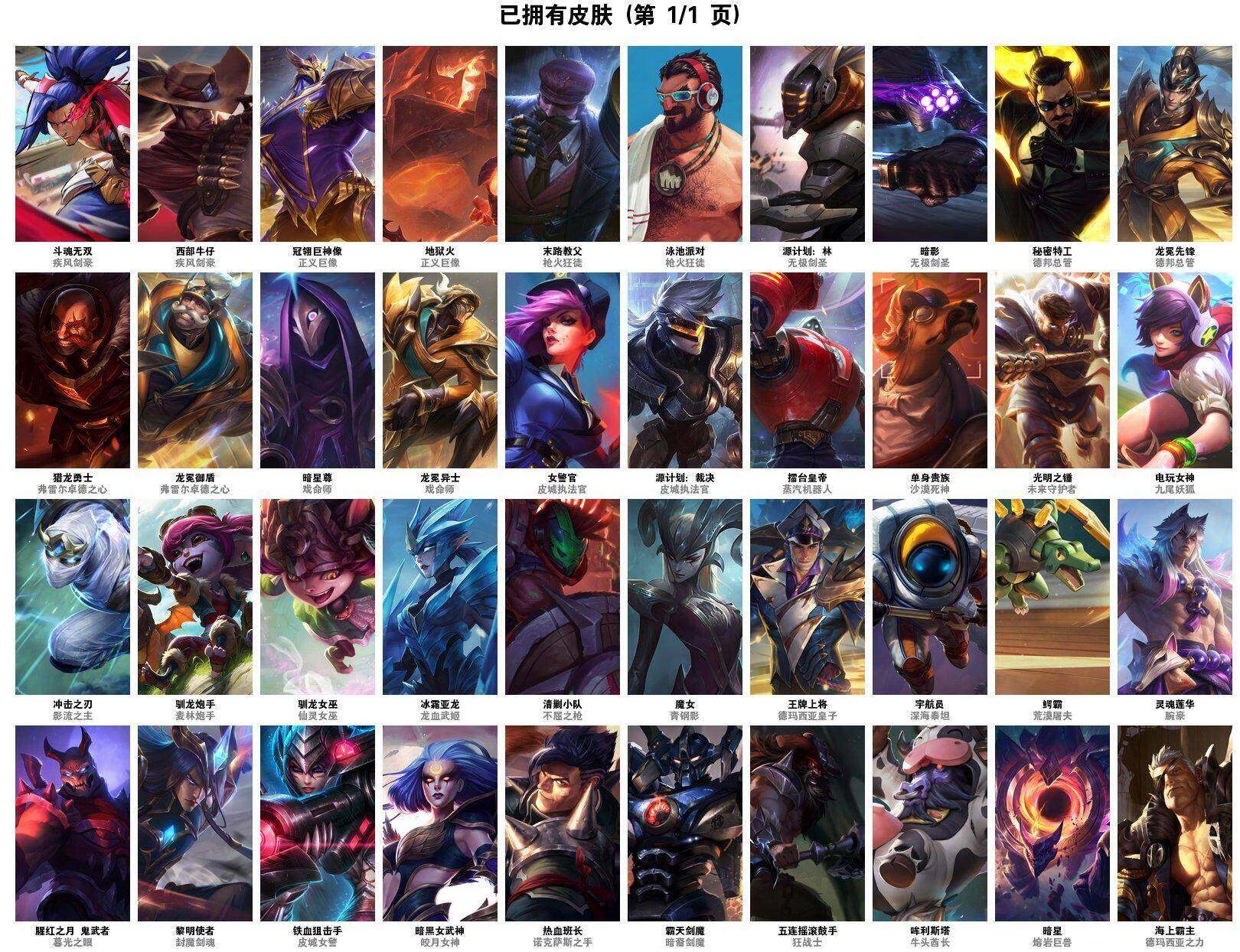 [14224699]42英雄-40皮肤-0典藏-0神话-6传说-10史诗 【传说皮肤】:暗星尊 烬,斗魂无双 亚索,灵魂莲华 瑟提,黎明使者 永恩,驯龙炮手 崔丝塔娜,源计划:林 易 【史诗皮肤】:暗星 墨菲特,霸天剑魔 亚托克斯,电玩女神 阿狸,地狱火 加里奥,魔女 卡蜜尔,清剿小队 潘森,驯龙女巫 璐璐,源计划:裁决 蔚,泳池派对 格雷福斯,宇航员 诺提勒斯 【赛季皮肤】:s10王牌上将,s12龙冕先锋,s13龙冕御盾,s15龙冕异士,s18冠翎巨神像 【其他皮肤】:暗黑女武神 黛安娜,暗影 易,冰霜亚龙 希瓦娜,冲击之刃 劫,单身贵族 内瑟斯,鳄霸 雷克顿,光明之锤 杰斯,海上霸主 盖伦,龙冕先锋 赵信,猎龙勇士 布隆,龙冕御盾 布隆,擂台皇帝 布里茨,秘密特工 赵信,末路教父 格雷福斯,哞利斯塔 阿利斯塔,女警官 蔚,热血班长 德莱厄斯,铁血狙击手 凯特琳,王牌上将 嘉文四世,西部牛仔 亚索,腥红之月 鬼武者 慎,龙冕异士 烬,冠翎巨神像 加里奥,五连摇滚鼓手 奥拉夫