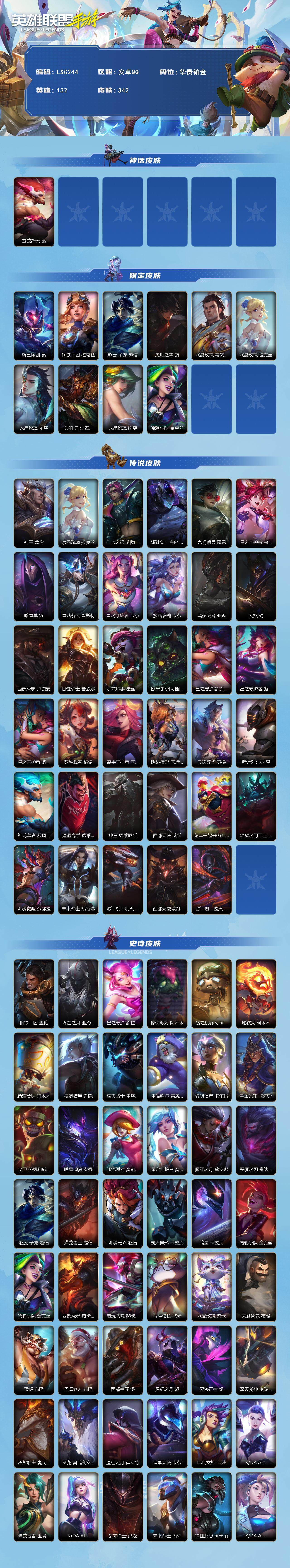 【lsc244】132英雄/342皮肤/1神话/35传说/178史诗/华贵铂金/玄龙绛天易/斩星魔剑/钢铁军团拉克丝/赵云 子龙/虎痴之拳/水晶玫瑰皇子/水晶玫瑰拉克丝/水晶玫瑰永恩/关羽云长/水晶玫瑰锐雯/涂鸦小队金克丝/神王盖伦/心之钢凯隐/源计划:净化薇恩/光明哨兵薇恩/星之守护者金克丝/暗星尊烬/星域游侠崔斯特/星之守护者卡莎/水晶玫瑰 卡莎/黑夜使者亚索/天煞劫/西部魔影卢锡安/日蚀