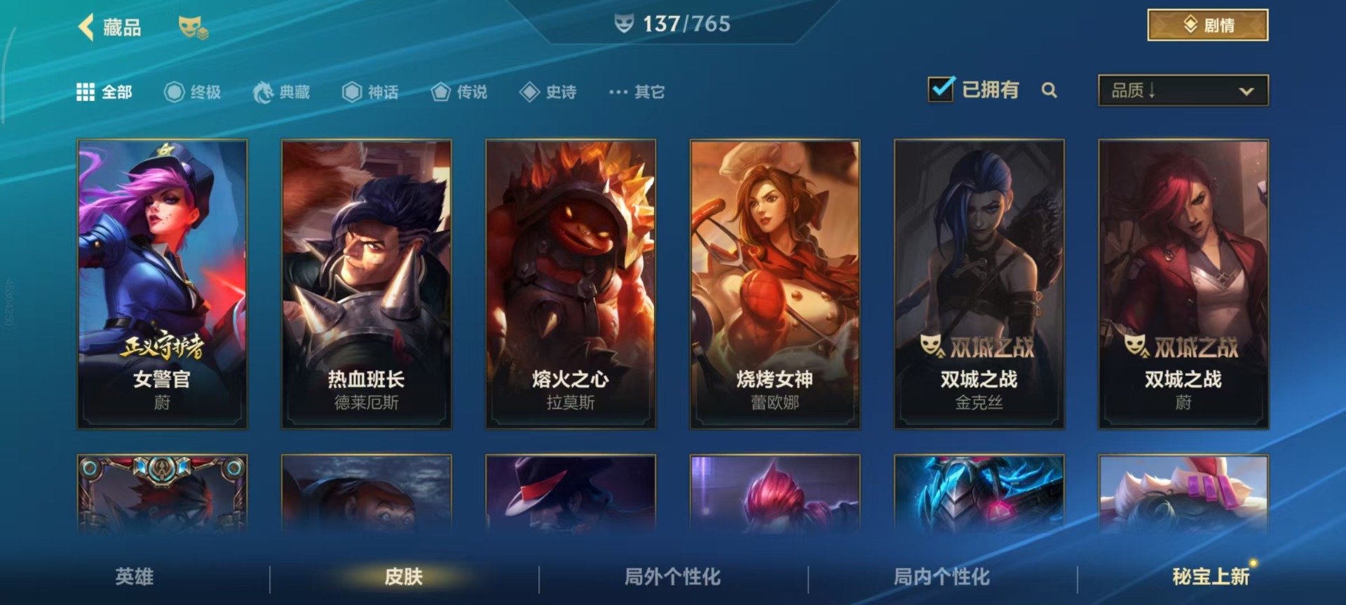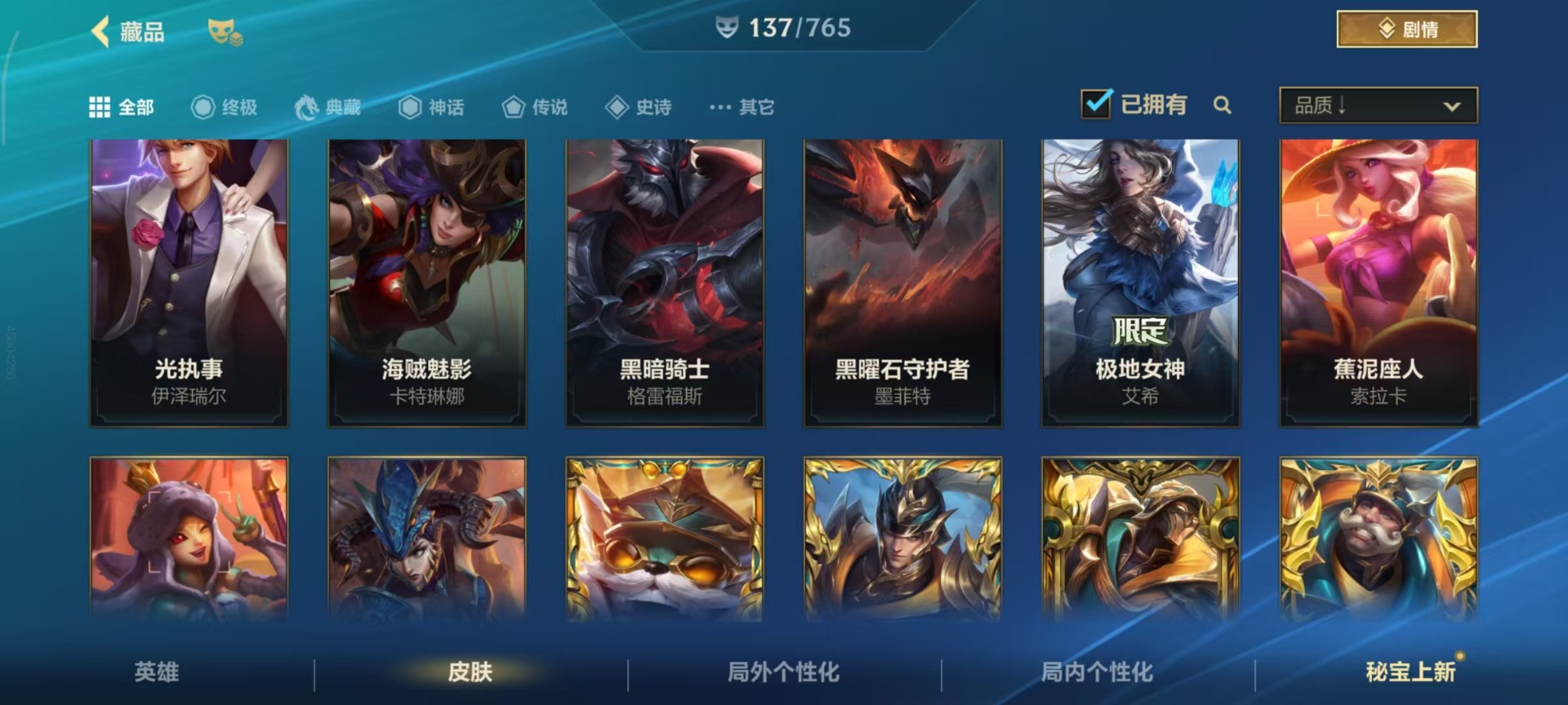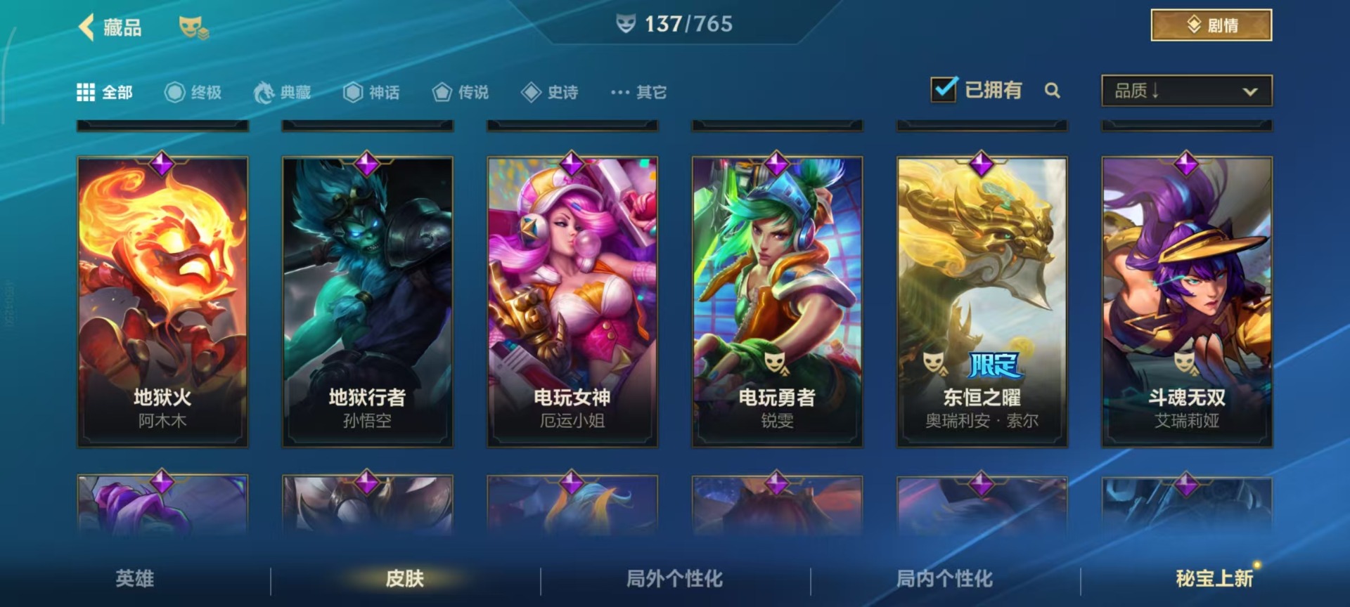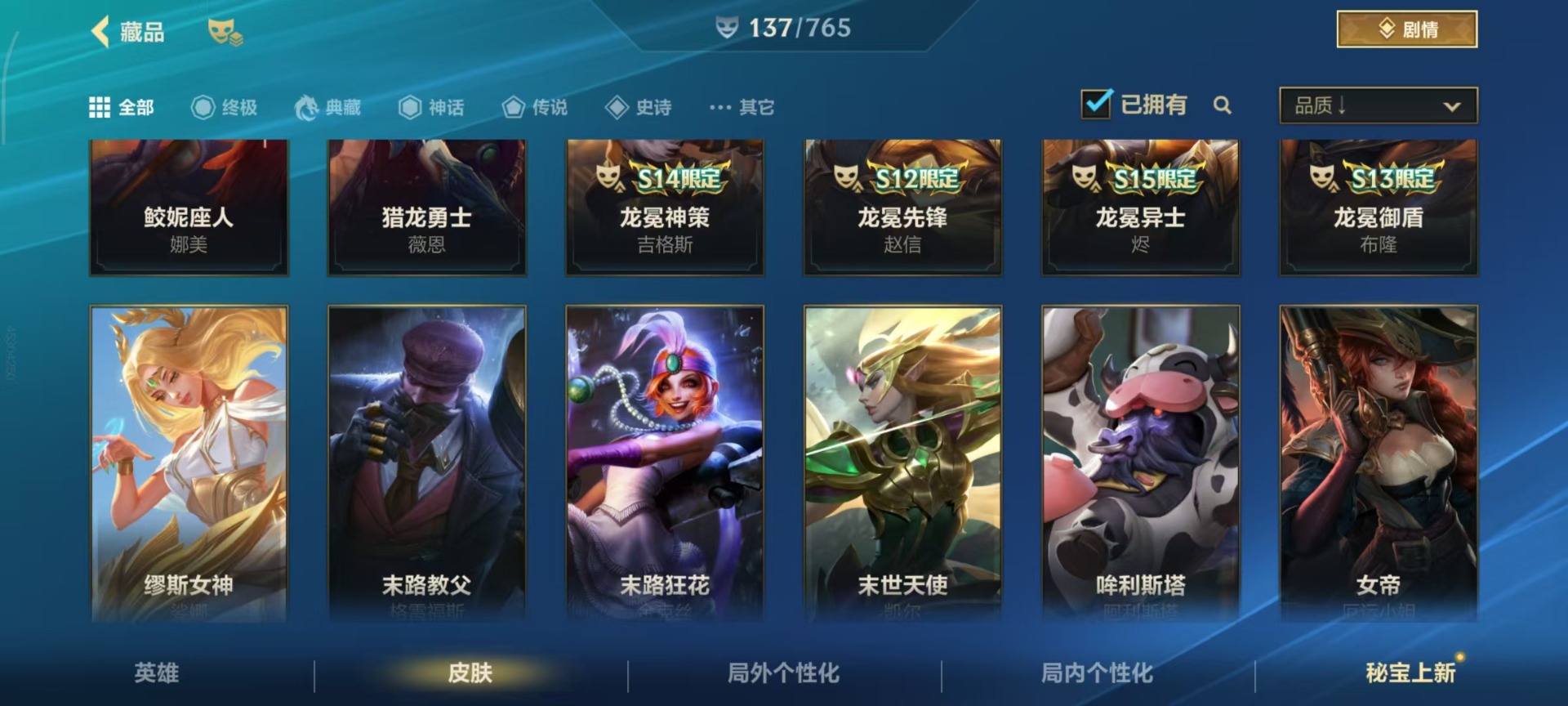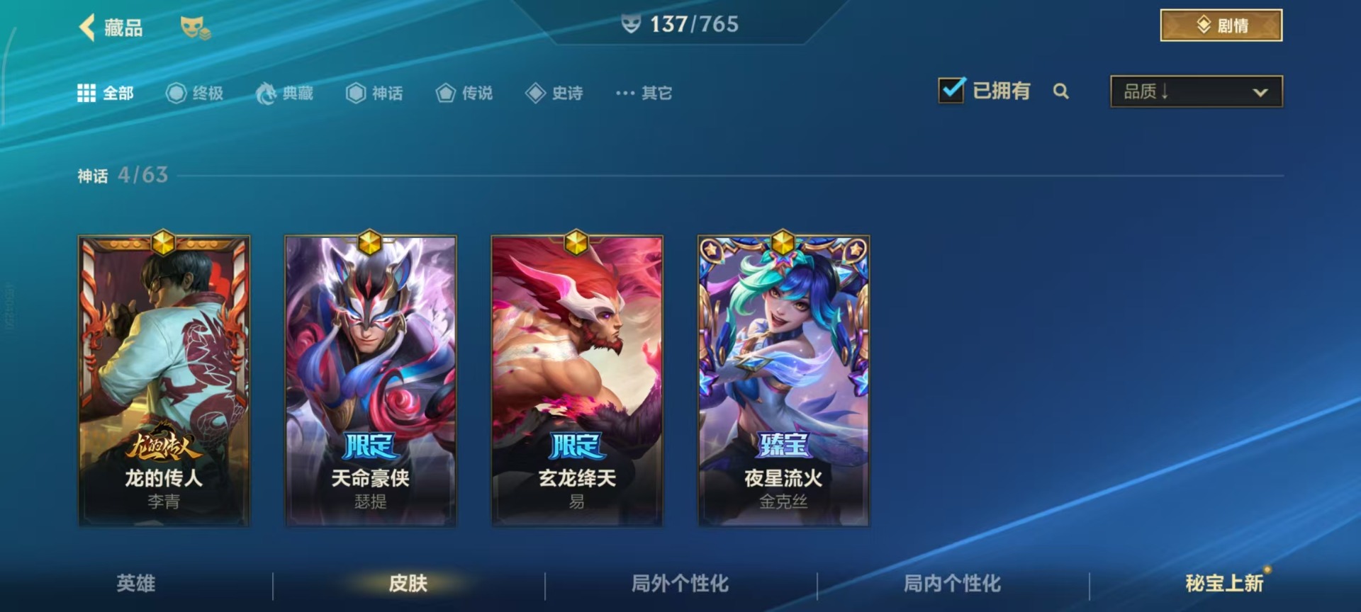 4神话 1限定 3传说 48史诗 137皮肤 可二次 可修改实名 【段位】:翡翠 【神话皮】:夜星流火 金克丝天命豪侠 瑟提玄龙绛天 易龙的传人 【限定皮肤】:龙的传人 【传说皮】:神龙尊者 驭风啸龙黑夜使者亚索驯龙炮手 【亮点】:【优质装备】:黑夜使者亚索神龙尊者 驭风啸龙驯龙炮手