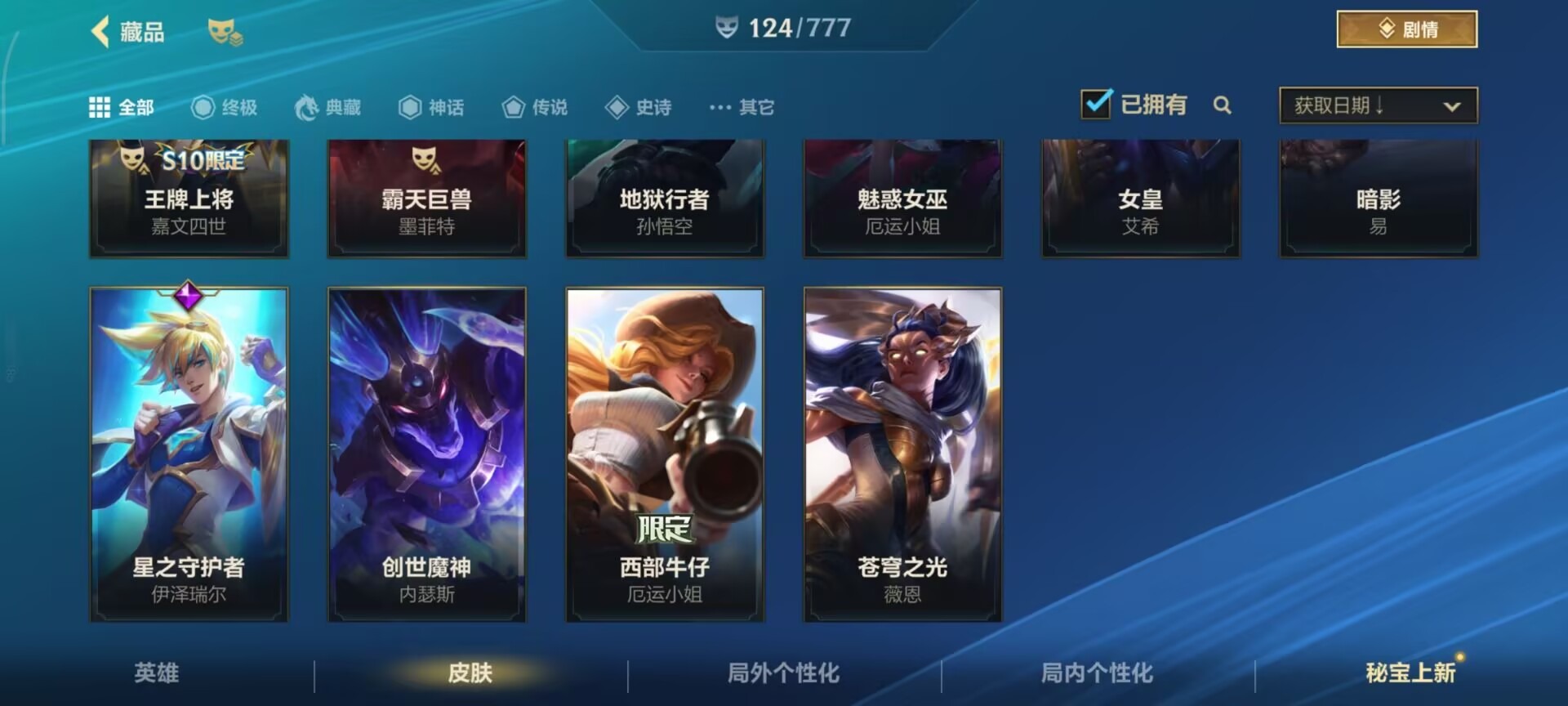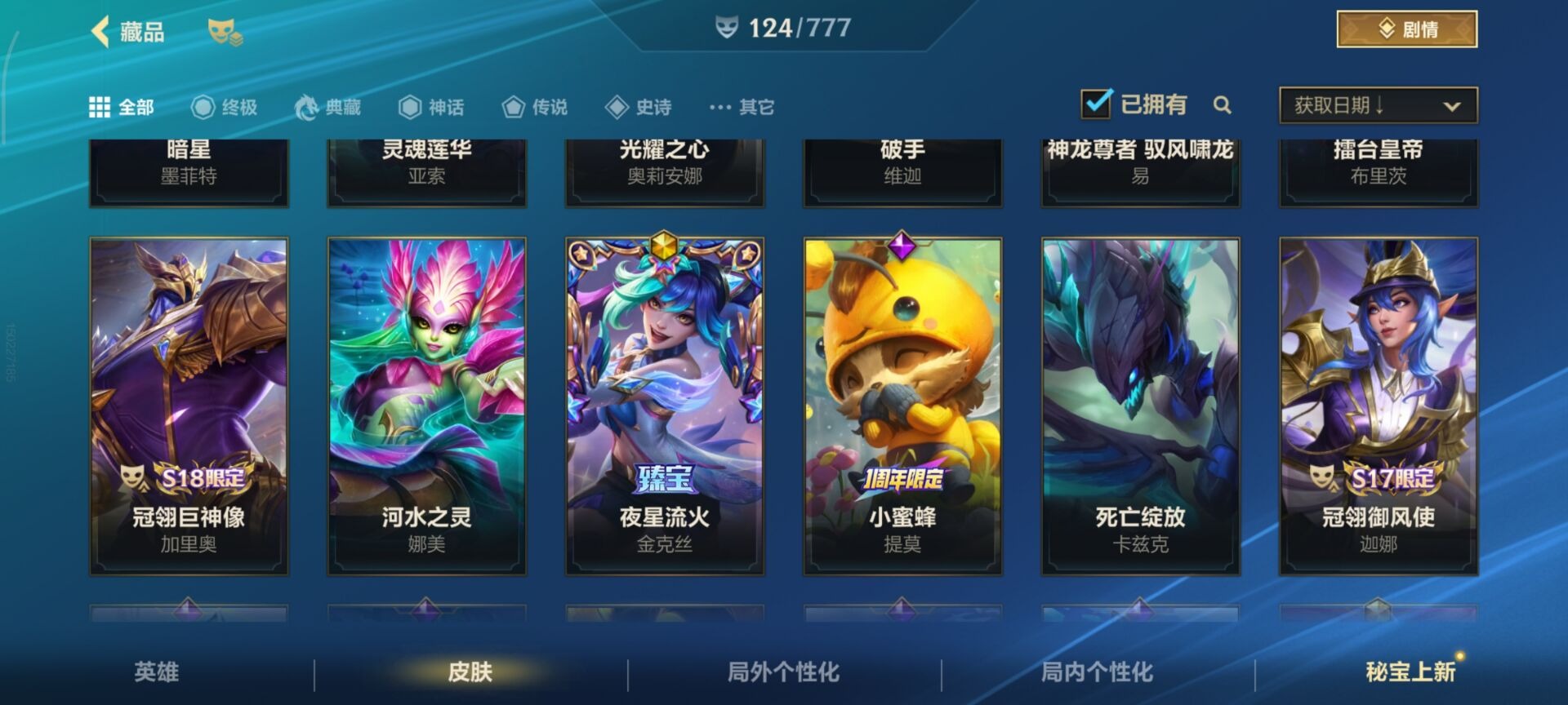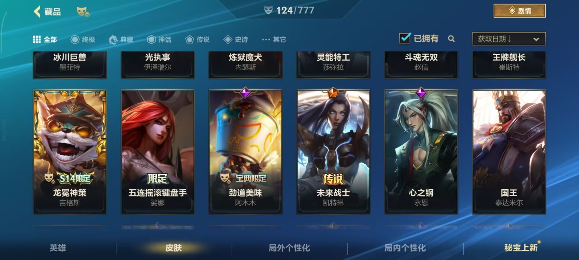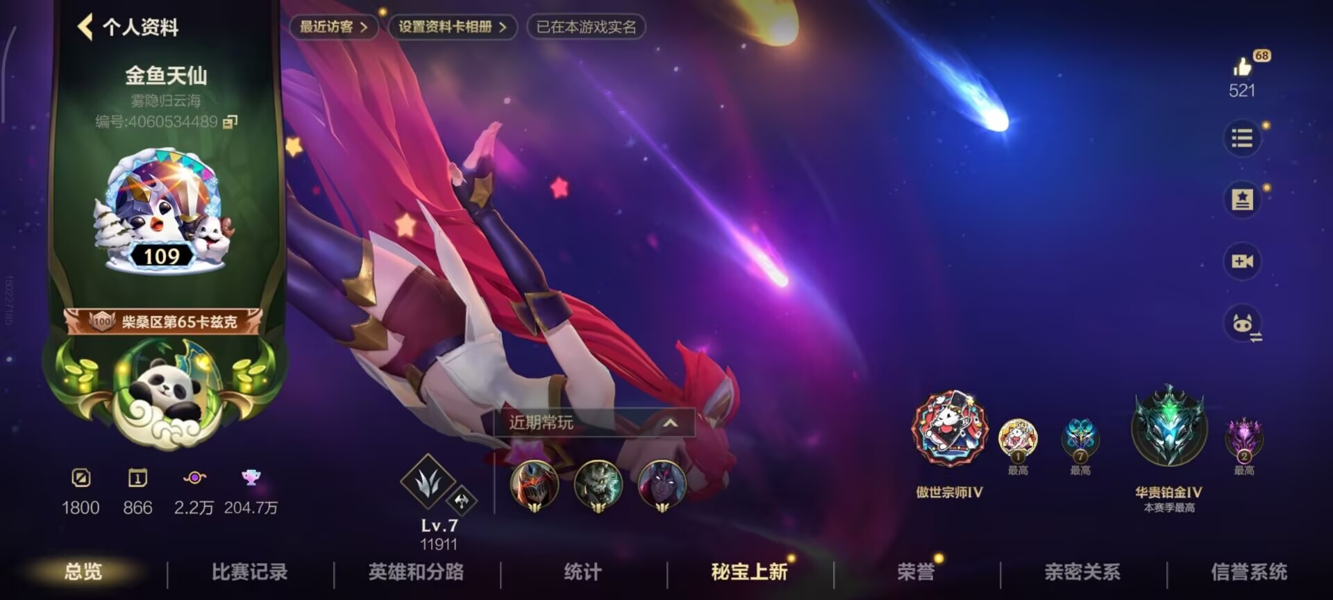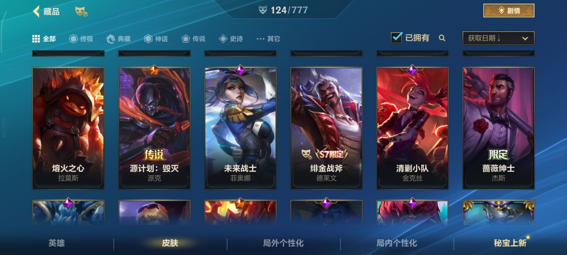 2神话 1限定 16传说 61史诗 124皮肤 可二次 可修改实名 信用分低,需要打3把匹配 【段位】:铂金 【神话皮】:夜星流火 金克丝玄龙绛天 易 【限定皮肤】:张辽文远 【传说皮】:暗星尊源计划:毁灭未来战士女警神拳盲僧神龙尊者 驭风啸龙星域游侠卡牌炼狱魔犬黎明使者锐雯k/d