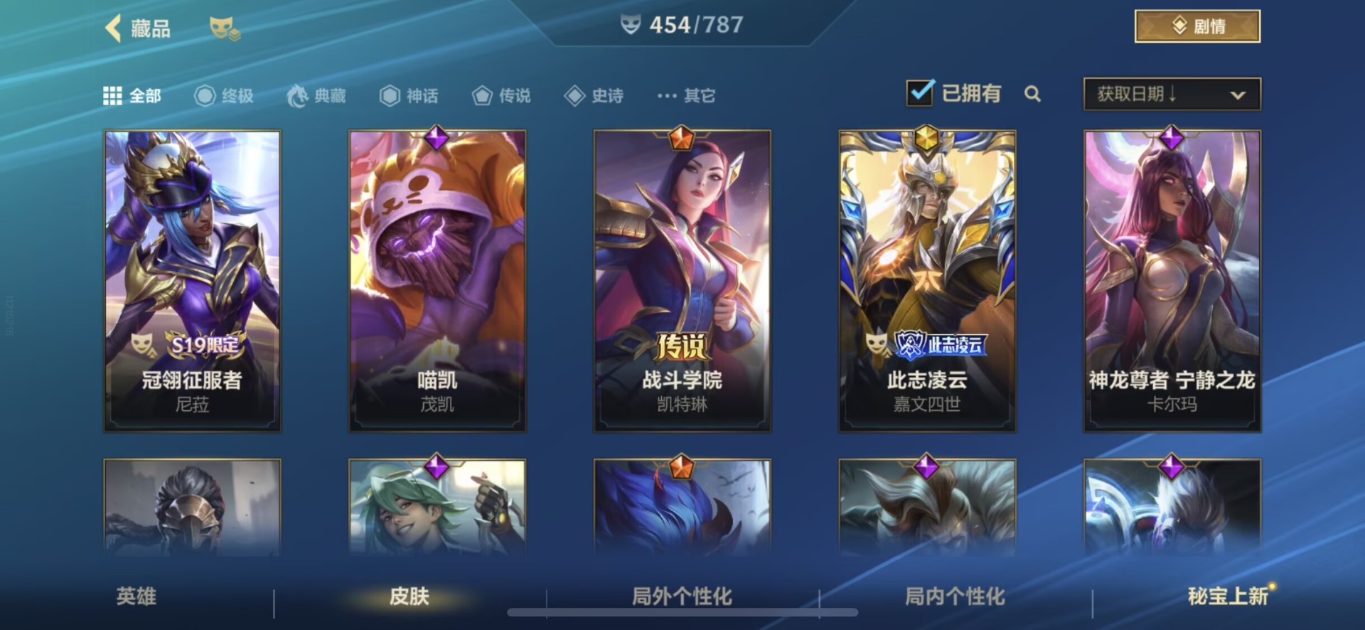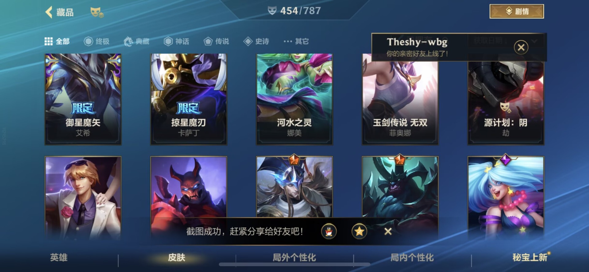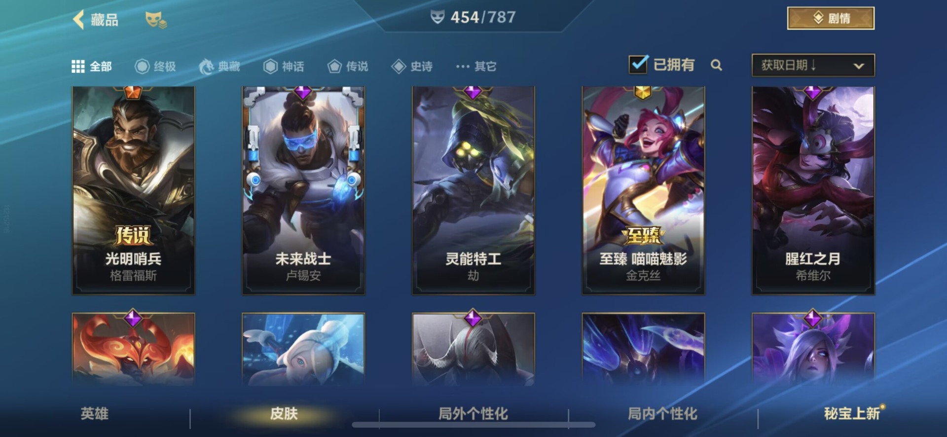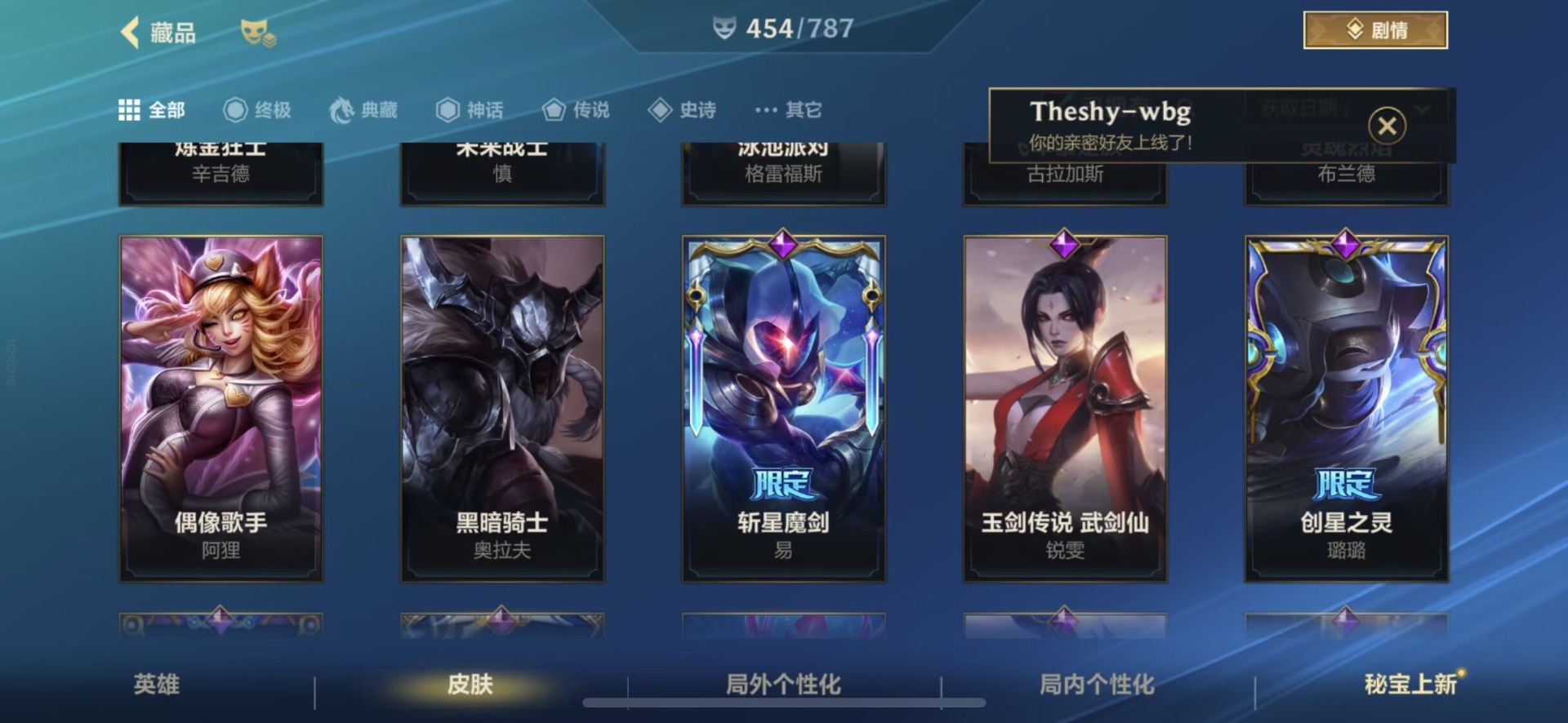 2典藏 9神话 27限定 50传说 244史诗 454皮肤 可二次 可修改实名 【段位】:宗师 【典藏皮】:超武乾坤:孤拳超武乾坤:虹影 【神话皮】:海克斯科技 雷克顿乘龙破渊 李青暮星追影 卡莎此志凌云 嘉文四世至臻喵喵魅影金克丝灰烬骑士派克火焰澎湃火力全开臻藏光影巨翼臻藏西部