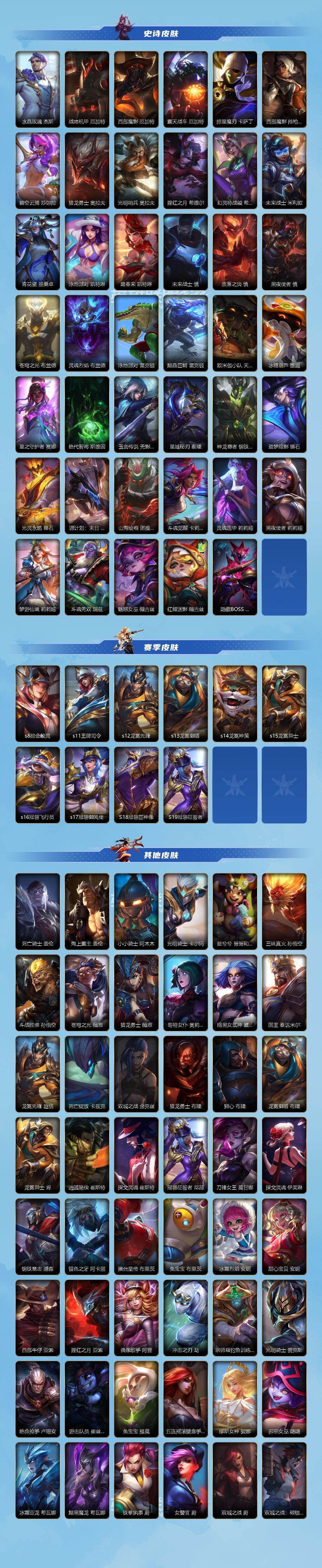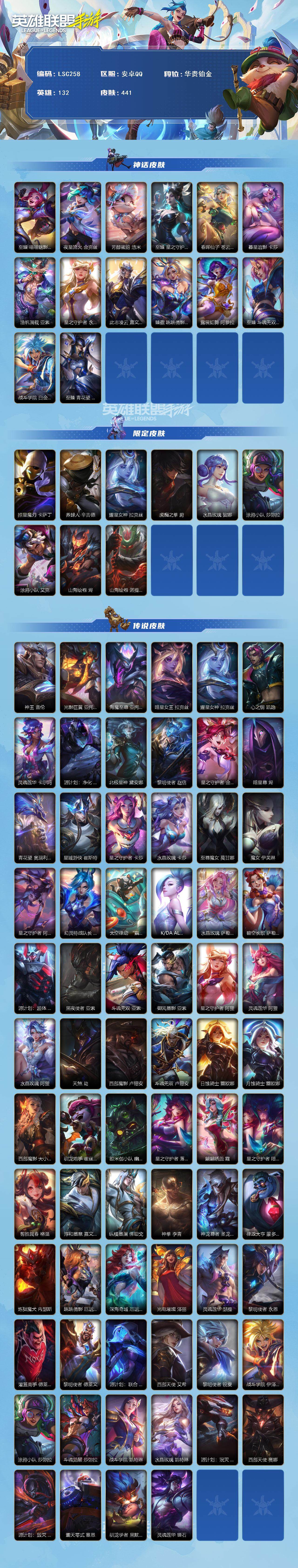 【lsc258】132英雄/441皮肤/17神话/71传说/249史诗/华贵铂金/至臻 喵喵魅影 金克丝/夜星流火 金克丝/芳醇蜜韵 悠米/至臻 星之守护者 辛德拉/春晖仙子 苍云缥缈 卡莎/暮星追影 卡莎/渔帆满载 亚索/星之守护者 永绽盛芒 阿狸/此志凌云 嘉文四世/臻藏 跳跳倩影 厄运小姐/露展虹舞 阿萝拉/至臻 斗魂无双 艾瑞莉娅/战斗学院 白金学长 伊泽瑞尔/至臻 青花瓷 丽桑卓/掠星魔刃 卡萨丁/养蜂人 辛吉德/耀星女神 拉克丝/虎痴之拳 蔚/水晶玫瑰 娑娜/涂鸦小队 莎弥拉/涂鸦小队 艾克/山海绘卷 烬/山海绘卷 诺提勒斯/神王 盖伦/光影巨翼 亚托克斯/海魔至尊 亚托克斯/暗星女王 拉克丝/心之钢 凯隐/灵魂莲华 卡尔玛/源计划:净化 薇恩/北极星神 黛安娜/黎明使者 赵信/星之守护者 金克丝/暗星尊 烬/青花瓷 奥瑞利安·索尔/星域游侠 崔斯特/星之守护者 卡莎/水晶玫瑰 卡莎/至尊魔女 莫甘娜/魔女 伊芙琳/星之守护者 阿卡丽/幻灵特战队长 菲奥娜/太空律动 “猫猫”布里和里茨 布里茨/k/da all out 萨勒芬妮/水晶玫瑰 萨勒芬妮/碧空长歌 萨勒芬妮/源计划:超体 莫德凯撒/黑夜使者 亚索/斗魂无双 亚索/御风墨影 亚索/星之守护者 阿狸/灵魂莲华 阿狸/水晶玫瑰 阿狸/天煞 劫/西部魔影 卢锡安/斗魂无双 卢锡安/日蚀骑士 蕾欧娜/月蚀骑士 蕾欧娜/西部魔影 大小姐 蕾欧娜/驯龙炮手 崔丝塔娜/欧米伽小队 幽灵特工 提莫/星之守护者 落 霞/翩翩绣蕊 霞/星之守护者 陨 洛/剪胜裁春 格温/淳和墨意 嘉文四世/纵横墨澜 佛耶戈/神拳 李青/神龙尊者 圣龙 李青/律政大亨 蒙多医生/炼狱魔犬 内瑟斯/跳跳倩影 厄运小姐/深海奇域 厄运小姐/光电璀璨 泽丽/灵魂莲华 瑟提/黎明使者 永恩/灌篮高手 德莱厄斯/黎明使者 德莱文/源计划:联合 艾希/西部天使 艾希/黎明使者 锐雯/战斗学院 伊泽瑞尔/斗魂觉醒 莎弥拉/战斗学院 凯特琳/水晶玫瑰 凯特琳/源计划:泯灭 雷克顿/西部天使 赛娜/源计划:毁灭 派克/霸天零式 赛恩/驯龙学者 黑默丁格/灵魂莲华 锤石/钢铁军团 盖伦/斗魂无双 盖伦/霸天剑魔 亚托克斯/星之守护者 拉克丝/战斗学院 拉克丝/桃映暖春 拉克丝/惊悚派对 阿木木/殇之机器人 阿木木/劲道美味 阿木木/摄魂猎手 凯隐/黑夜使者 凯隐/霸天战士 雷恩加尔/黎明使者 卡尔玛/神龙尊者 宁静之龙 卡尔玛/丧尸 努努和威朗普/小蜜蜂 努努和威朗普/地狱行者 孙悟空/斗魂无双 孙悟空/幻灵战斗蝠 薇恩/锐利墨痕 薇恩/暗星 奥莉安娜/泳池派对 奥莉安娜/星之守护者 奥莉安娜/腥红之月 黛安娜/无限烈焰 黛安娜/光明哨兵 黛安娜/焕影迎春 佐伊/星之守护者 佐伊/黑夜使者 泰达米尔/端劲墨印 泰达米尔/猎龙勇士 赵信/斗魂无双 赵信/霸天异形 卡兹克/暗星 卡兹克/猎梦吞噬者 卡兹克/清剿小队 金克丝/喵喵魅影金克丝/双城之战:天资 金克丝/电玩战魂 赫卡里姆/战斗校长 悠米/末路管家 布隆/猛虎 布隆/礼物选好了吗? 布隆/源计划:升华 烬/西部牛仔 烬/腥红之月 烬/青花瓷 烬/霸天龙神 奥瑞利安·索尔/灰烬领主 奥瑞利安·索尔/东恒之曜 奥瑞利安·索尔/灵魂莲华 辛德拉/腥红之月 崔斯特/未来战士 崔斯特/怪诞童话 崔斯特/弹幕天使 卡莎/k/da all out 卡莎/斗魂无双 尼菈/玉剑传说 苍鸾 莫甘娜/k/da all out 伊芙琳/福纳康宁 伊芙琳/猎龙勇士 潘森/清剿小队 潘森/未来战士 潘森/西宙之晖 潘森/铁血女忍 阿卡丽/k/da all out 阿卡丽/源计划:暗影 阿卡丽/行云墨舞 阿卡丽/源计划:火 菲奥娜/泳池派对 菲奥娜/玉剑传说 无双 菲奥娜/未来战士 菲奥娜/苹果机器人 布里茨/战场之王 布里茨/星之守护者 萨勒芬妮/悦鼓春生 萨勒芬妮/海之歌 萨勒芬妮/古神 莫德凯撒/福牛守护者 安妮/源计划:风 亚索/灵魂莲华 亚索/碧空垂钓 亚索/k/da all out 阿狸/源计划:阴 劫/灵能特工 劫/玉剑传说 无劫 劫/武神 贾克斯/灵能特工 凯尔/屠龙勇士 凯尔/深海奇域 凯尔/源计划:山 蕾欧娜/战斗学院 蕾欧娜/欧米伽小队 魔鬼伞兵 崔丝塔娜/小恶魔 崔丝塔娜/我,羽饰骑士 崔丝塔娜/娜就去看看 崔丝塔娜/灵魂莲华 崔丝塔娜/灵魂莲华 提莫/小蜜蜂 提莫/星之守护者 娑娜/鸣凤栖梧 娑娜/清雅墨弦 娑娜/驯龙女巫 璐璐/睡衣守护者 璐璐/银河魔装机神 希瓦娜/秘旅探索者 希瓦娜/破败军团 希瓦娜/炼狱魔女 蔚/永恒之森 霞/秀逸墨羽 霞/水晶玫瑰 霞/永恒之森 洛/水晶玫瑰 洛/翼翼飞花 洛/西部魔影 送葬人 图奇/星域裁断使 格温/咖啡甜心 格温/星域审判官 卡蜜尔/裂帛剪春 卡蜜尔/暗星 嘉文四世/电玩魔爵 佛耶戈/水晶玫瑰 佛耶戈/神龙尊者 均衡之龙 沃利贝尔/黑夜使者 李青/地下拳王 李青/柯基 库奇/奈落之炎 凯南/梦境绅探 凯南/冰封王子 蒙多医生/赤影磷火 蒙多医生/魔女 婕拉/战地机甲 内瑟斯/盗梦者 内瑟斯/星之守护者 厄运小姐/电玩女神 厄运小姐/魅惑女巫 厄运小姐/源计划:燃 泽丽/海之歌 泽丽/神龙尊者 炎龙 瑟提/心之钢 瑟提/水晶玫瑰 瑟提/灵魂莲华 永恩/心之钢 永恩/玉剑传说 无极 易/灵魂莲华 易/泳池派对 格雷福斯/战斗教授 格雷福斯/光焰澎湃 格雷福斯/青花瓷 千珏/喵凯 茂凯/魅惑女巫 迦娜/温雅墨曲 迦娜/灵魂收割者 德莱文/破败军团 德莱文/海之歌 艾希/水晶玫瑰 艾希/冰川巨兽 墨菲特/暗星 墨菲特/碧空灵跃 阿萝拉/银河魔装机神 菲兹/虚空海灵 菲兹/绒毛 菲兹/柚子软糖 菲兹/奥术大师 吉格斯/泳池派对 吉格斯/青花瓷 吉格斯/涂鸦小队 
