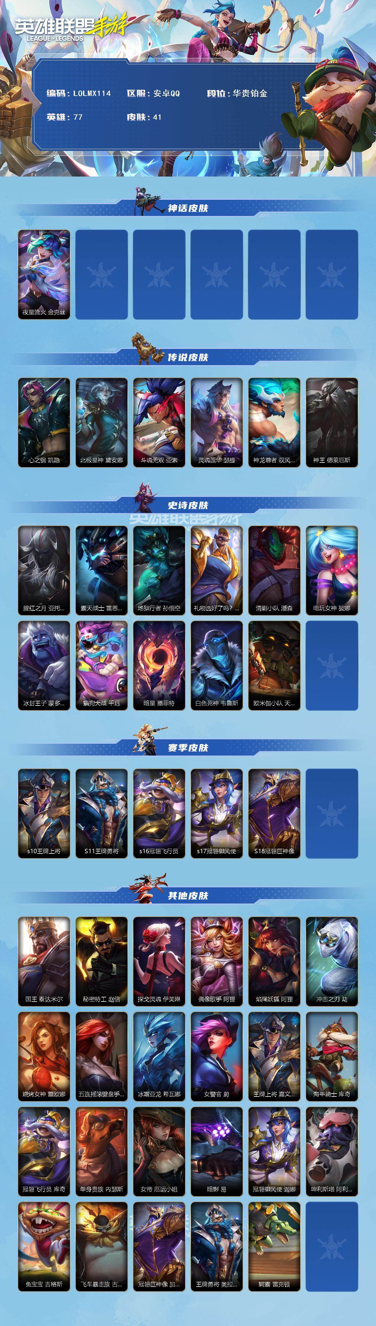 【lolmx114】77英雄/41皮肤/1神话/6传说/11史诗/华贵铂金/夜星流火 金克丝/心之钢 凯隐/北极星神 黛安娜/斗魂无双 亚索/灵魂莲华 瑟提/神龙尊者 驭风啸龙 易/神王 德莱厄斯/腥红之月 亚托克斯/霸天战士 雷恩加尔/地狱行者 孙悟空/礼物选好了吗? 布隆/清剿小队 潘森/电玩女神 娑娜/冰封王子 蒙多医生/猫狗大战 千珏/暗星 墨菲特/白色死神 韦鲁斯/欧米伽小队 天雷爆破手 维迦/s10王牌上将/s11王牌勇将/s16冠翎飞行员/s17冠翎御风使/s18冠翎巨神像/国王 泰达米尔/秘密特工 赵信/探戈灵魂 伊芙琳/偶像歌手 阿狸/焰尾妖狐 阿狸/冲击之刃 劫/烧烤女神 蕾欧娜/五连摇滚键盘手 娑娜/冰霜亚龙 希瓦娜/女警官 蔚/王牌上将 嘉文四世/海牛骑手 库奇/冠翎飞行员 库奇/单身贵族 内瑟斯/女帝 厄运小姐/暗影 易/冠翎御风使 迦娜/哞利斯塔 阿利斯塔/兔宝宝 吉格斯/飞车暴走族 古拉加斯/冠翎巨神像 加里奥/王牌勇将 奥拉夫/鳄霸 雷克顿