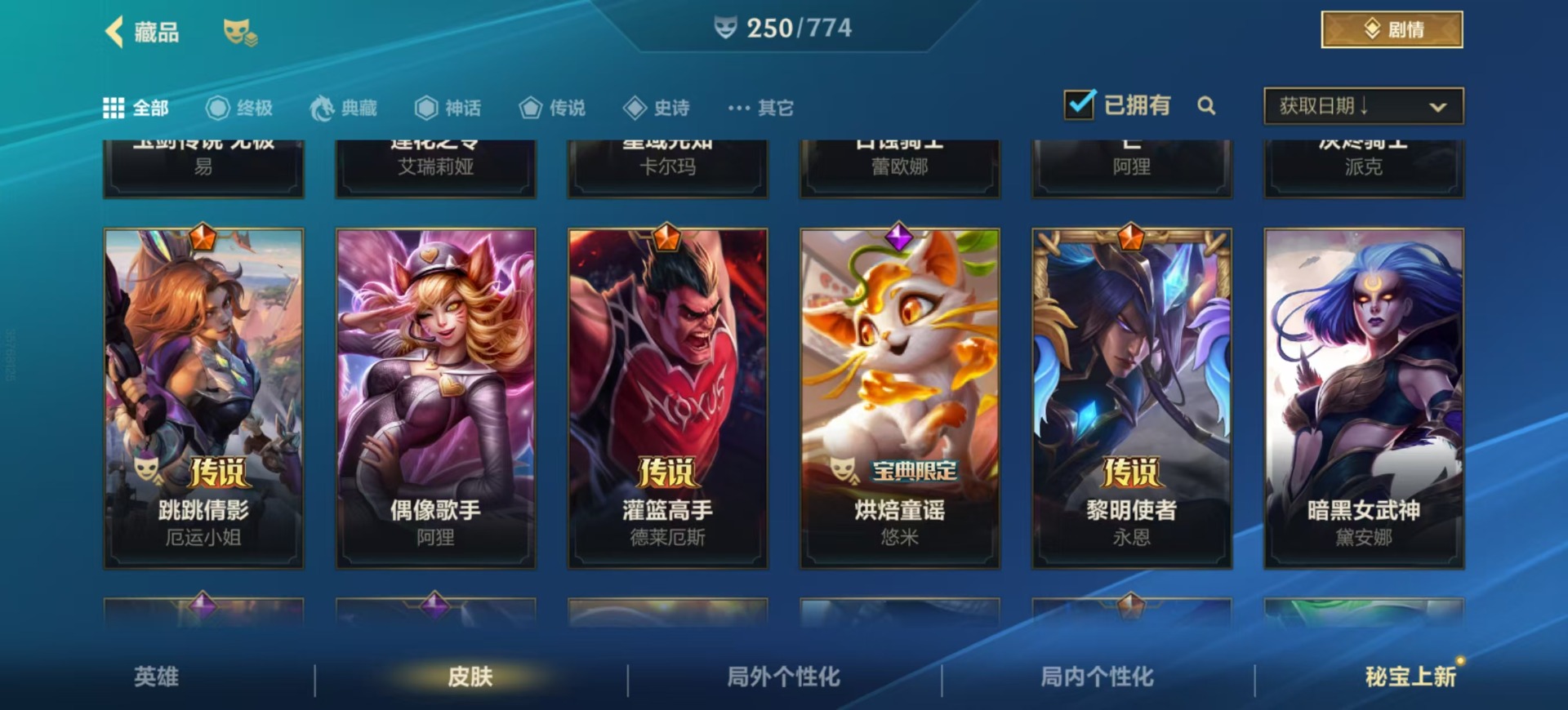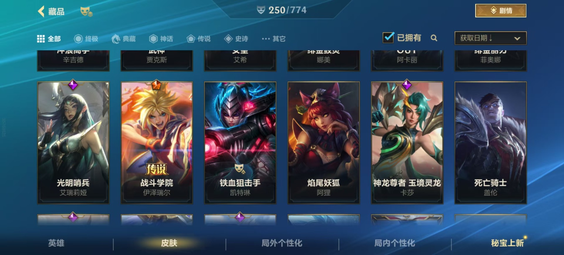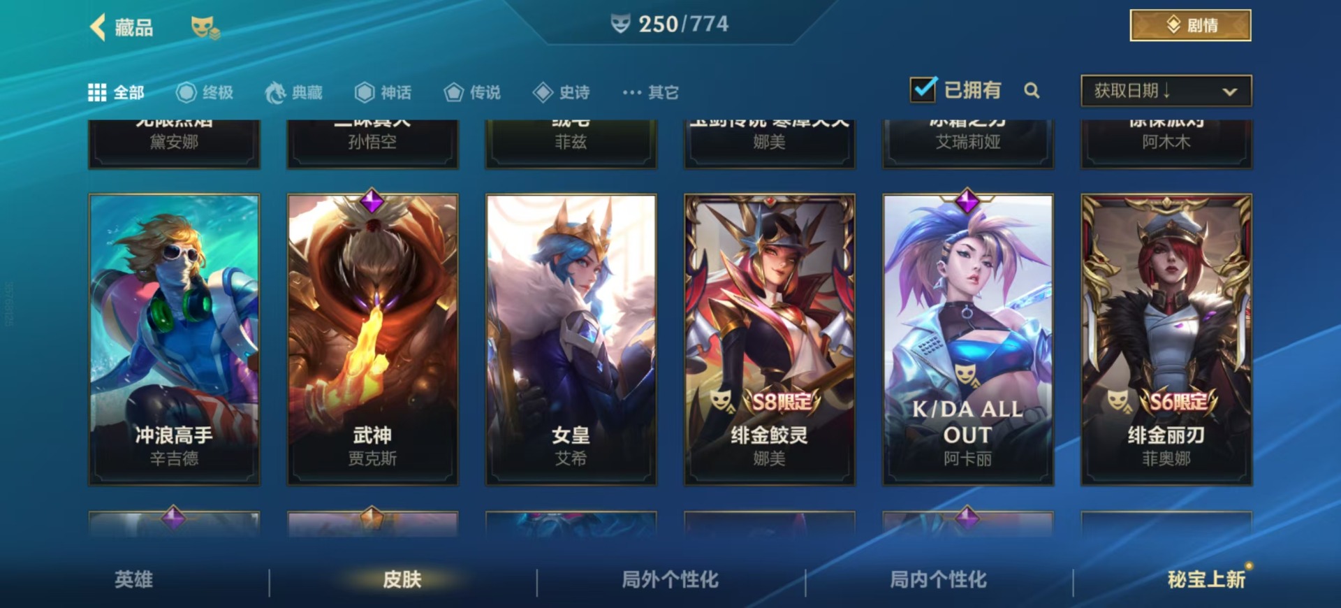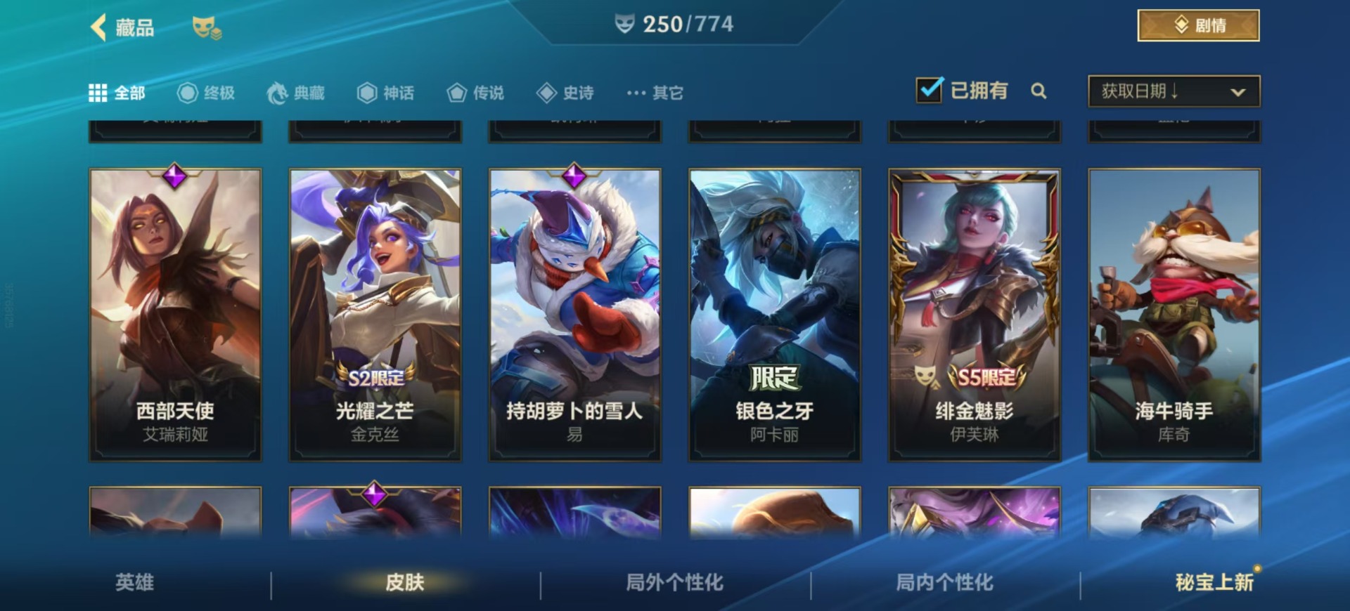5神话 41传说 118史诗 250皮肤 可二次 可修改实名 【段位】:翡翠 【神话皮】:夜星流火 金克丝至臻 斗魂无双 艾瑞莉娅雷霆神兵 沃利贝尔星之守护者阿狸永绽盛芒灰烬骑士派克 【传说皮】:暗星尊斗魂觉醒 莎弥拉星之守护者 阿卡丽光影巨翼亚托克斯春晖神女莫甘娜源计划:毁灭