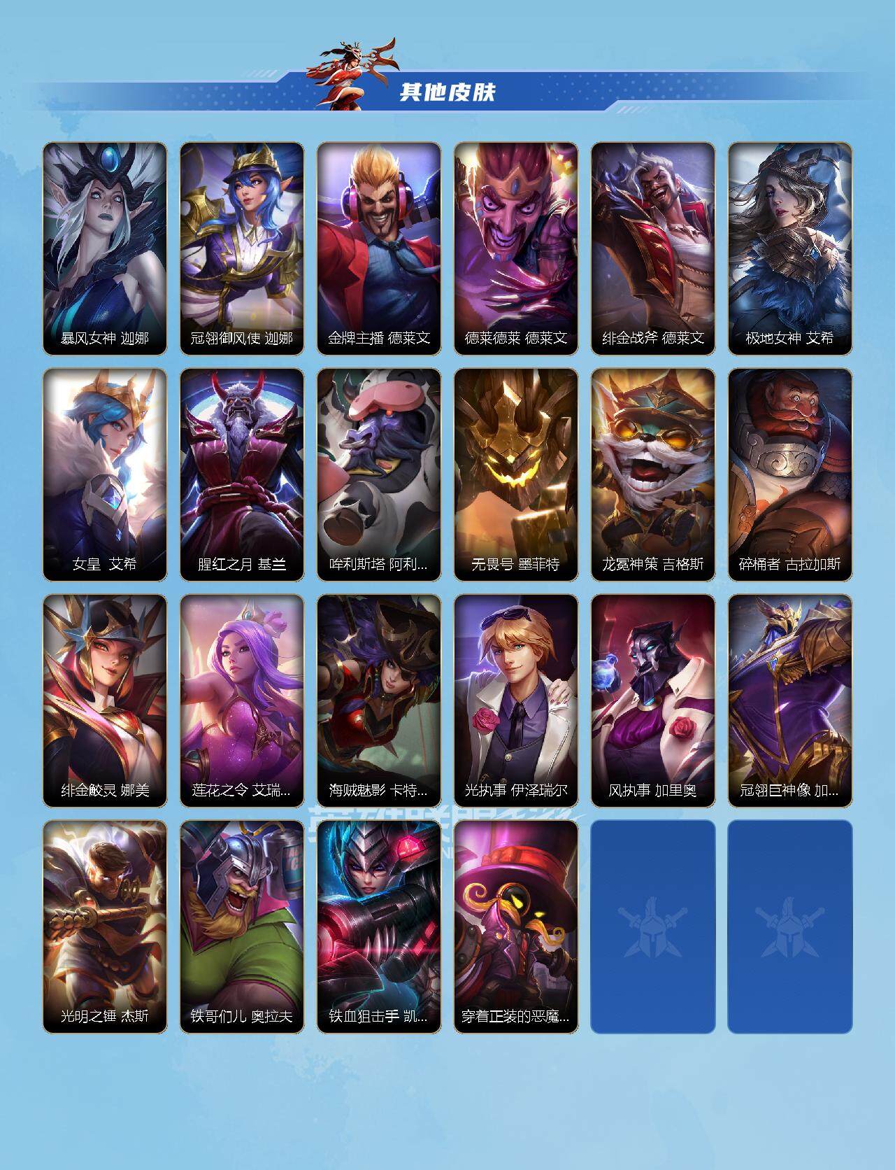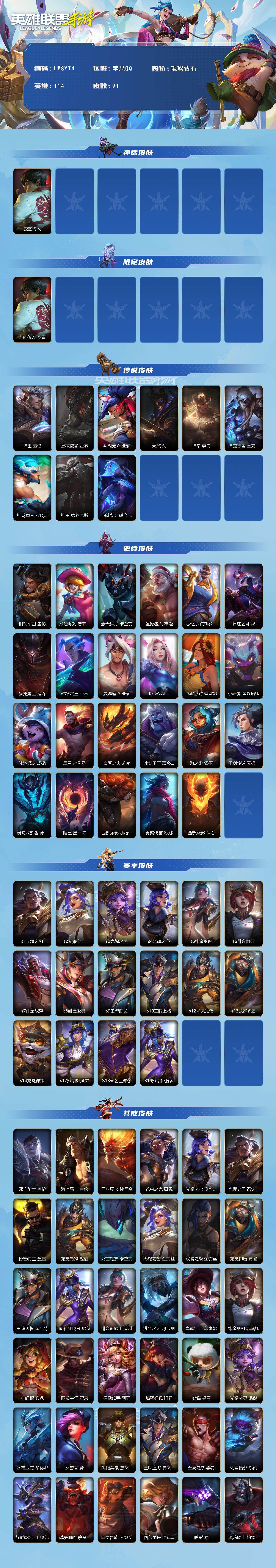 【lmsyt4】114英雄/91皮肤/璀璨钻石/龙的传人 李青/神王 盖伦/黑夜使者 亚索/斗魂无双 亚索/天煞 劫/神拳 李青/神龙尊者 圣龙 李青/神龙尊者 驭风啸龙 易/神王 德莱厄斯/源计划:联合 艾希/钢铁军团 盖伦/泳池派对 奥莉安娜/霸天异形 卡兹克/圣诞老人 布隆/礼物选好了吗? 布隆/腥红之月 烬/猎龙勇士 潘森/战场之王 亚索/灵魂莲华 亚索/k/da all out 阿狸/泳池派对 蕾欧娜/小恶魔 崔丝塔娜/泳池派对 璐璐/晨星之翎 洛/奈落之炎 凯南/冰封王子 蒙多医生/海之歌 泽丽/玉剑传说 无极 易/灵魂收割者 德莱文/暗星 墨菲特/西部魔影 执行人 卡特琳娜/真实伤害 赛娜/西部魔影 锤石/s1光耀之刃/s2光耀之芒/s3光耀之灵/s4光耀之心/s5绯金魅影/s6绯金丽刃/s7绯金战斧/s8绯金鮫灵/s9王牌舰长/s10王牌上将/s12龙冕先锋/s13龙冕御盾/s14龙冕神策/s17冠翎御风使/s18冠翎巨神像/s19冠翎征服者/死亡骑士 盖伦/海上霸主 盖伦/三昧真火 孙悟空/苍穹之光 薇恩/光耀之心 奥莉安娜/光耀之刃 泰达米尔/秘密特工 赵信/龙冕先锋 赵信/死亡绽放 卡兹克/光耀之芒 金克丝/双城之战 金克丝/龙冕御盾 布隆/王牌舰长 崔斯特/冠翎征服者 尼菈/绯金魅影 伊芙琳/银色之牙 阿卡丽/皇家守卫 菲奥娜/绯金丽刃 菲奥娜/小红帽 安妮/西部牛仔 亚索/偶像歌手 阿狸/焰尾妖狐 阿狸/熊猫 提莫/光耀之灵 璐璐/冰霜亚龙 希瓦娜/女警官 蔚/孤胆英豪 嘉文四世/王牌上将 嘉文四世/至高之拳 李青/刺客信条 凯南/超武乾坤:电弧 凯南/战争血统 蒙多医生/单身贵族 内瑟斯/西部牛仔 厄运小姐/暗影 易/黑暗骑士 格雷福斯/暴风女神 迦娜/冠翎御风使 迦娜/金牌主播 德莱文/德莱德莱 德莱文/绯金战斧 德莱文/极地女神 艾希/女皇 艾希/腥红之月 基兰/哞利斯塔 阿利斯塔/无畏号 墨菲特/龙冕神策 吉格斯/碎桶者 古拉加斯/绯金鲛灵 娜美/莲花之令 艾瑞莉娅/海贼魅影 卡特琳娜/光执事 伊泽瑞尔/风执事 加里奥/冠翎巨神像 加里奥/光明之锤 杰斯/铁哥们儿 奥拉夫/铁血狙击手 凯特琳/穿着正装的恶魔 维迦