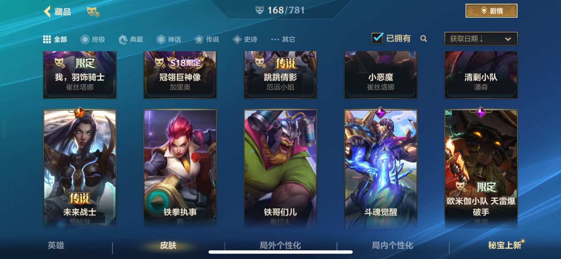 1神话 1限定 27传说 73史诗 168皮肤 可二次 可修改实名 【段位】:翡翠 【神话皮】:夜星流火 金克丝 【限定皮肤】:邪恶圣诞老人小法 【传说皮】:神龙尊者 圣龙 李青黎明使者德莱文灵魂莲华腕豪星之守护者卡莎青花瓷 奥瑞利安·索尔星域武神贾克斯未来战士女警西部魔影卢锡安天