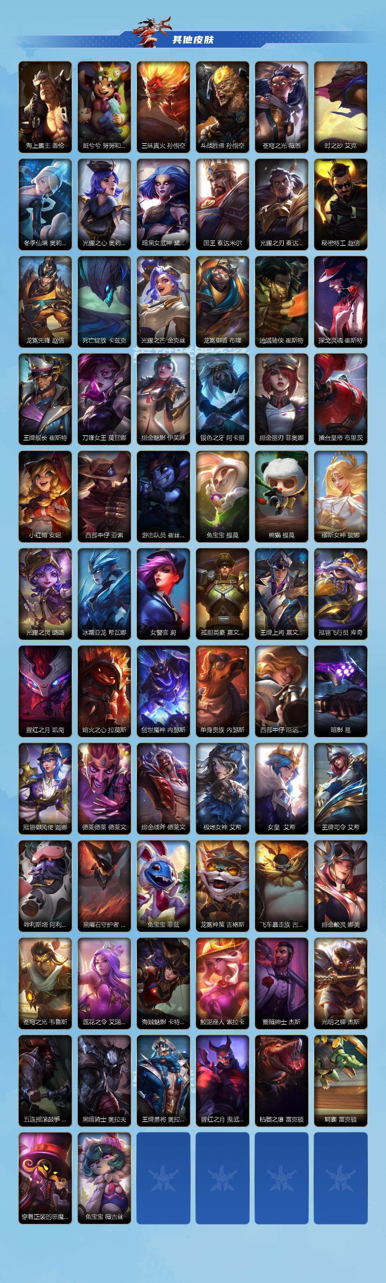 【商品标题】:128英雄-138皮肤 【神话皮肤】:火焰澎湃 火力全开 格雷福斯 【限定皮肤】:冬季仙境 奥莉安娜 【传说皮肤】:神王 盖伦,源计划:净化 薇恩,星域游侠 崔斯特,k/da all out 萨勒芬妮,黑夜使者 亚索,星之守护者 阿狸,天煞 劫,西部魔影 卢锡安,日蚀骑士 蕾欧娜,驯龙炮手 崔丝塔娜,欧米伽小队 幽灵特工 提莫,星之守护者 落 霞,星之守护者 陨 洛,神拳 李青,律政大亨 蒙多医生,炼狱魔犬 内瑟斯,源计划:林 易,神龙尊者 驭风啸龙 易,灌篮高手 德莱厄斯,女主播 迦娜,源计划:联合 艾希,黎明使者 锐雯,地狱之门卫士 加里奥,西部天使 赛娜 【史诗皮肤】:霸天剑魔 亚托克斯,星之守护者 拉克丝,雷喵喵尔 雷恩加尔,丧尸 努努和威朗普,小蜜蜂 努努和威朗普,探梦奇旅 艾克,恶魔之刃 泰达米尔,斗魂无双 赵信,猛虎 布隆,圣龙 奥瑞利安·索尔,东恒之曜 奥瑞利安·索尔,清剿小队 潘森,未来战士 潘森,k/da all out 阿卡丽,源计划:火 菲奥娜,福牛守护者 菲奥娜,战场之王 布里茨,福牛守护者 安妮,源计划:阴 劫,屠龙勇士 凯尔,我,羽饰骑士 崔丝塔娜,源代码 卡蜜尔,福牛守护者 嘉文四世,奈落之炎 凯南,灵魂莲华 永恩,福牛守护者 德莱厄斯,魅惑女巫 迦娜,破败军团 德莱文,霸天巨兽 墨菲特,冰川巨兽 墨菲特,暗星 墨菲特,柚子软糖 菲兹,电玩勇者 锐雯,玉剑传说 舞剑仙 艾瑞莉娅,西部天使 艾瑞莉娅,霸天战鹰 加里奥,猎龙勇士 奥拉夫,奈落之炎 慎,黯晶巨鳄 雷克顿,冰糖葫芦 维迦,西部魔影 锤石,古神 沃里克,宇航员 诺提勒斯 【赛季皮肤】:s1光耀之刃,s2光耀之芒,s3光耀之灵,s4光耀之心,s5绯金魅影,s6绯金丽刃,s7绯金战斧,s8绯金鮫灵,s9王牌舰长,s10王牌上将,s11王牌勇将,s11王牌司令,s12龙冕先锋,s13龙冕御盾,s14龙冕神策,s16冠翎飞行员,s17冠翎御风使 【其他皮肤】:海上霸主 盖伦,脏兮兮 努努和威朗普,三昧真火 孙悟空,斗战胜佛 孙悟空,苍穹之光 薇恩,时之砂 艾克,冬季仙境 奥莉安娜,光耀之心 奥莉安娜,暗黑女武神 黛安娜,国王 泰达米尔,光耀之刃 泰达米尔,秘密特工 赵信,龙冕先锋 赵信,死亡绽放 卡兹克,光耀之芒 金克丝,龙冕御盾 布隆,赌侠 崔斯特,探戈灵魂 崔斯特,王牌舰长 崔斯特,刀锋女王 莫甘娜,绯金魅影 伊芙琳,银色之牙 阿卡丽,绯金丽刃 菲奥娜,擂台皇帝 布里茨,小红帽 安妮,西部牛仔 亚索,游击队员 崔丝塔娜,兔宝宝 提莫,熊猫 提莫,缪斯女神 娑娜,光耀之灵 璐璐,冰霜亚龙 希瓦娜,女警官 蔚,孤胆英豪 嘉文四世,王牌上将 嘉文四世,冠翎飞行员 库奇,腥红之月 凯南,熔火之心 拉莫斯,创世魔神 内瑟斯,单身贵族 内瑟斯,西部牛仔 厄运小姐,暗影 易,冠翎御风使 迦娜,德莱德莱 德莱文,绯金战斧 德莱文,极地女神 艾希,女皇 艾希,王牌司令 艾希,哞利斯塔 阿利斯塔,黑曜石守护者 墨菲特,兔宝宝 菲兹,龙冕神策 吉格斯,飞车暴走族 古拉加斯,绯金鲛灵 娜美,苍穹之光 韦鲁斯,莲花之令 艾瑞莉娅,海贼魅影 卡特琳娜,蕉泥座人 索拉卡,蔷薇绅士 杰斯,光明之锤 杰斯,五连摇滚鼓手 奥拉夫,黑暗骑士 奥拉夫,王牌勇将 奥拉夫,腥红之月 鬼武者 慎,枯萎之壤 雷克顿,鳄霸 雷克顿,穿着正装的恶魔 维迦,兔宝宝 薇古丝