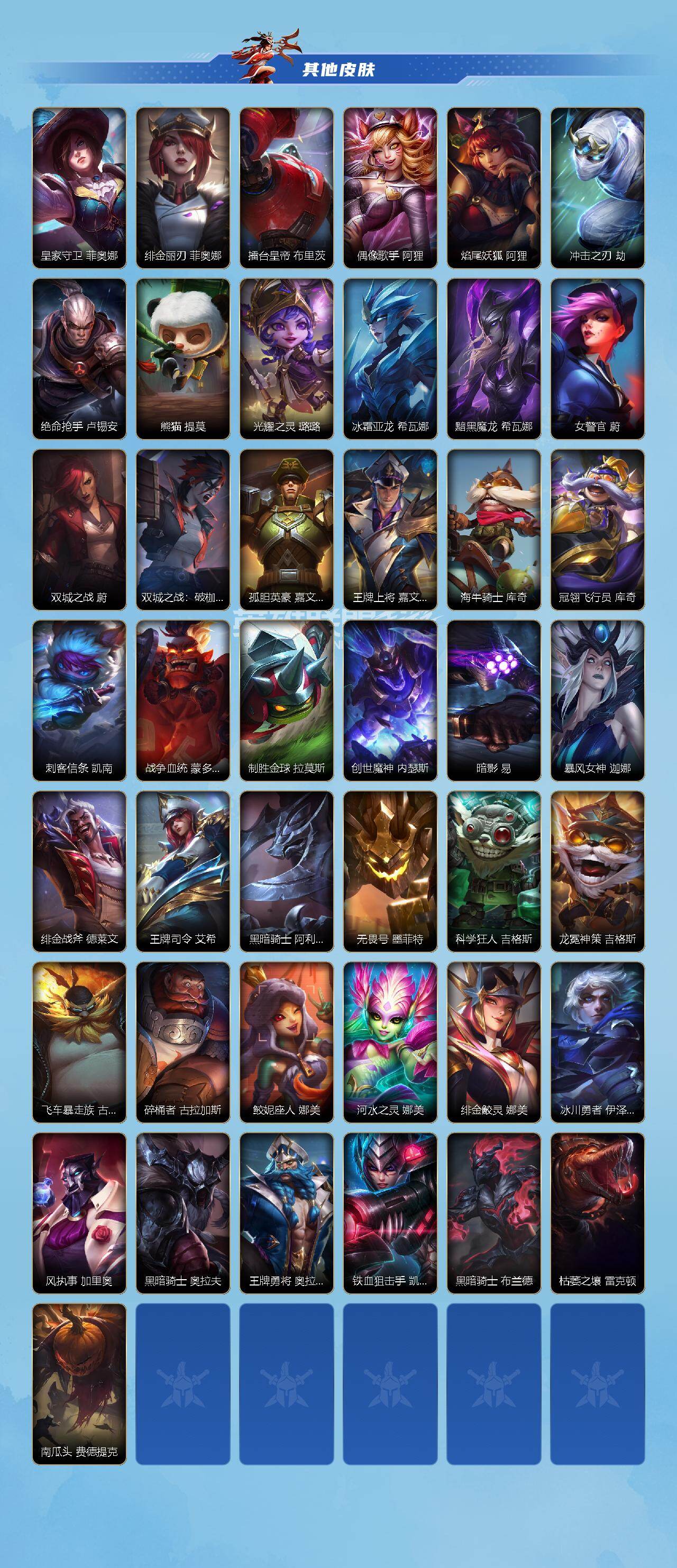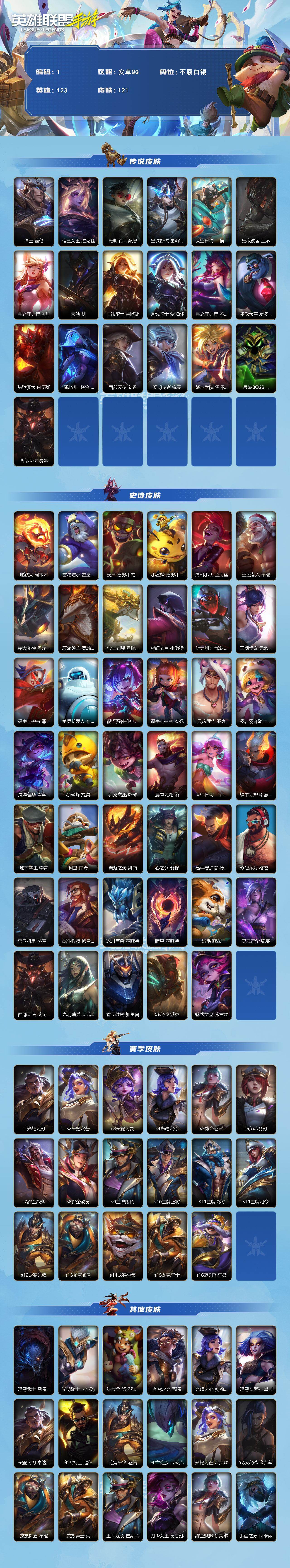 [16327464]【店主推荐捡漏号!可直接换绑】123英雄-121皮肤 【传说皮肤】:神王 盖伦,暗星女王 拉克丝,光明哨兵 薇恩,星域游侠 崔斯特,太空律动 “猫猫”布里和里茨 布里茨,黑夜使者 亚索,星之守护者 阿狸,天煞 劫,日蚀骑士 蕾欧娜,月蚀骑士 蕾欧娜,星之守护者 落 霞,律政大亨 蒙多医生,炼狱魔犬 内瑟斯,源计划:联合 艾希,西部天使 艾希,黎明使者 锐雯,战斗学院 伊泽瑞尔,最终boss 维迦,西部天使 赛娜 【史诗皮肤】:地狱火 阿木木,雷喵喵尔 雷恩加尔,丧尸 努努和威朗普,小蜜蜂 努努和威朗普,清剿小队 金克丝,圣诞老人 布隆,霸天龙神 奥瑞利安·索尔,灰烬领主 奥瑞利安·索尔,东恒之曜 奥瑞利安·索尔,腥红之月 崔斯特,源计划:暗影 阿卡丽,玉剑传说 无双 菲奥娜,福牛守护者 菲奥娜,苹果机器人 布里茨,银河魔装机神 安妮,福牛守护者 安妮,灵魂莲华 亚索,我,羽饰骑士 崔丝塔娜,灵魂莲华 崔丝塔娜,小蜜蜂 提莫,驯龙女巫 璐璐,晨星之翎 洛,太空律动 “百万调音” 格温,福牛守护者 嘉文四世,地下拳王 李青,柯基 库奇,奈落之炎 凯南,心之钢 瑟提,福牛守护者 德莱厄斯,泳池派对 格雷福斯,禁卫机甲 格雷福斯,战斗教授 格雷福斯,冰川巨兽 墨菲特,暗星 墨菲特,绒毛 菲兹,灵魂莲华 锐雯,西部天使 艾瑞莉娅,光明哨兵 艾瑞莉娅,霸天战鹰 加里奥,怨之砂 派克,魅惑女巫 薇古丝 【赛季皮肤】:s1光耀之刃,s2光耀之芒,s3光耀之灵,s4光耀之心,s5绯金魅影,s6绯金丽刃,s7绯金战斧,s8绯金鮫灵,s9王牌舰长,s10王牌上将,s11王牌勇将,s11王牌司令,s12龙冕先锋,s13龙冕御盾,s14龙冕神策,s15龙冕异士,s16冠翎飞行员 【其他皮肤】:暗黑武士 雷恩加尔,光明骑士 卡尔玛,脏兮兮 努努和威朗普,苍穹之光 薇恩,光耀之心 奥莉安娜,暗黑女武神 黛安娜,光耀之刃 泰达米尔,秘密特工 赵信,龙冕先锋 赵信,死亡绽放 卡兹克,光耀之芒 金克丝,双城之战 金克丝,龙冕御盾 布隆,龙冕异士 烬,王牌舰长 崔斯特,刀锋女王 莫甘娜,绯金魅影 伊芙琳,银色之牙 阿卡丽,皇家守卫 菲奥娜,绯金丽刃 菲奥娜,擂台皇帝 布里茨,偶像歌手 阿狸,焰尾妖狐 阿狸,冲击之刃 劫,绝命呛手 卢锡安,熊猫 提莫,光耀之灵 璐璐,冰霜亚龙 希瓦娜,黯黑魔龙 希瓦娜,