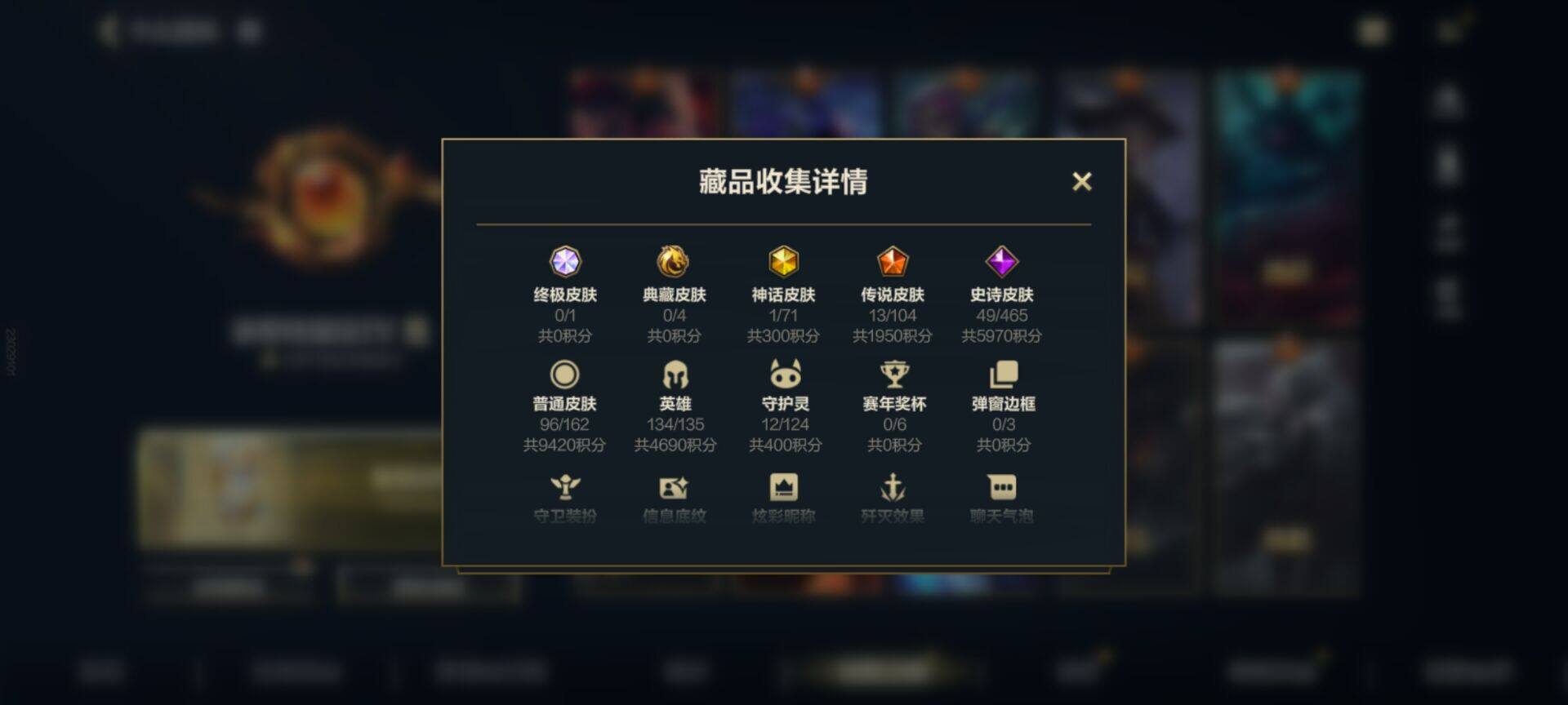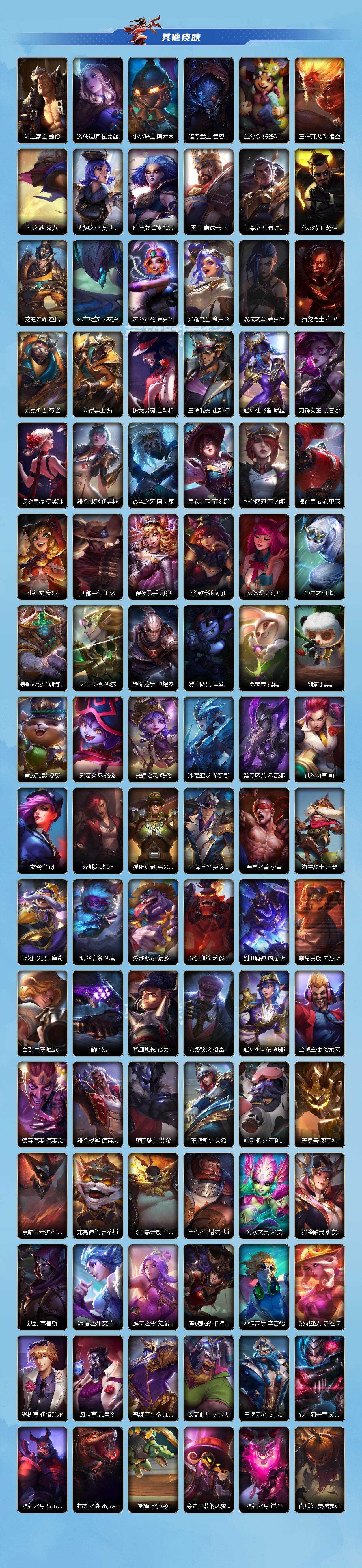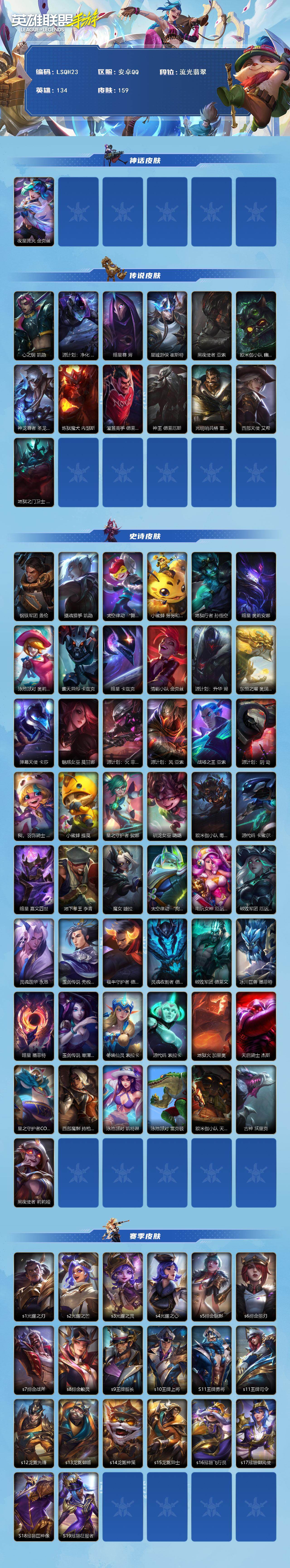 【lsqh23】134英雄/159皮肤/1神话/13传说/49史诗/流光翡翠/夜星流火 金克丝/心之钢 凯隐/源计划:净化 薇恩/暗星尊 烬/星域游侠 崔斯特/黑夜使者 亚索/欧米伽小队 幽灵特工 提莫/神龙尊者 圣龙 李青/炼狱魔犬 内瑟斯/灌篮高手 德莱厄斯/神王 德莱厄斯/光明哨兵 格雷福斯/西部天使 艾希/地狱之门卫士 加里奥/钢铁军团 盖伦/摄魂猎手 凯隐/太空律动 “舞林双子” 努努和威朗普/小蜜蜂 努努和威朗普/地狱行者 孙悟空/暗星 奥莉安娜/泳池派对 奥莉安娜/霸天异形 卡兹克/暗星 卡兹克/清剿小队 金克丝/源计划:升华 烬/东恒之曜 奥瑞利安·索尔/弹幕天使 卡莎/魅惑女巫 莫甘娜/源计划:火 菲奥娜/源计划:风 亚索/战场之王 亚索/源计划:阴 劫/我,羽饰骑士 崔丝塔娜/小蜜蜂 提莫/星之守护者 娑娜/驯龙女巫 璐璐/欧米伽小队 毒针狙击手 图奇/源代码 卡蜜尔/暗星 嘉文四世/地下拳王 李青/魔女 婕拉/太空律动 “狗头” 内瑟斯/电玩女神 厄运小姐/破败军团 厄运小姐/灵魂莲华 永恩/玉剑传说 无极 易/福牛守护者 德莱厄斯/灵魂收割者 德莱文/破败军团 德莱文/冰川巨兽 墨菲特/暗星 墨菲特/玉剑传说 寒潭夭夭 娜美/冬境仙灵 索拉卡/源代码 索拉卡/地狱火 加里奥/天启骑士 杰斯/星之守护者cos 厄加特/西部魔影 持呛女巫 莎弥拉/泳池派对 凯特琳/泳池派对 雷克顿/欧米伽小队 天雷爆破手 维迦/古神 沃里克/黑夜使者 莉莉娅/s1光耀之刃/s2光耀之芒/s3光耀之灵/s4光耀之心/s5绯金魅影/s6绯金丽刃/s7绯金战斧/s8绯金鮫灵/s9王牌舰长/s10王牌上将/s11王牌勇将/s11王牌司令/s12龙冕先锋/s13龙冕御盾/s14龙冕神策/s15龙冕异士/s16冠翎飞行员/s17冠翎御风使/s18冠翎巨神像/s19冠翎征服者/海上霸主 盖伦/游侠法师 拉克丝/小小骑士 阿木木/暗黑武士 雷恩加尔/脏兮兮 努努和威朗普/三昧真火 孙悟空/时之砂 艾克/光耀之心 奥莉安娜/暗黑女武神 黛安娜/国王 泰达米尔/光耀之刃 泰达米尔/秘密特工 赵信/龙冕先锋 赵信/死亡绽放 卡兹克/末路狂花 金克丝/光耀之芒 金克丝/双城之战 金克丝/猎龙勇士 布隆/龙冕御盾 布隆/龙冕异士 烬/探戈灵魂 崔斯特/王牌舰长 崔斯特/冠翎征服者 尼菈/刀锋女王 莫甘娜/探戈灵魂 伊芙琳/绯金魅影 伊芙琳/银色之牙 阿卡丽/皇家守卫 菲奥娜/绯金丽刃 菲奥娜/擂台皇帝 布里茨/小红帽 安妮/西部牛仔 亚索/偶像歌手 阿狸/焰尾妖狐 阿狸/风纪委员 阿狸/冲击之刃 劫/宗师级钓鱼训练师 贾克斯/末世天使 凯尔/绝命呛手 卢锡安/游击队员 崔丝塔娜/兔宝宝 提莫/熊猫 提莫/声威黠影 提莫/邪恶女巫 璐璐/光耀之灵 璐璐/冰霜亚龙 希瓦娜/黯黑魔龙 希瓦娜/铁拳执事 蔚/女警官 蔚/双城之战 蔚/孤胆英豪 嘉文四世/王牌上将 嘉文四世/至高之拳 李青/海牛骑手 库奇/冠翎飞行员 库奇/刺客信条 凯南/泳池派对 蒙多医生/战争血统 蒙多医生/创世魔神 内瑟斯/单身贵族 内瑟斯/西部牛仔 厄运小姐/暗影 易/热血班长 德莱厄斯/末路教父 格雷福斯/冠翎御风使 迦娜/金牌主播 德莱文/德莱德莱 德莱文/绯金战斧 德莱文/黑暗骑士 艾希/王牌司令 艾希/哞利斯塔 阿利斯塔/无畏号 墨菲特/黑曜石守护者 墨菲特/龙冕神策 吉格斯/飞车暴走族 古拉加斯/碎桶者 古拉加斯/河水之灵 娜美/绯金鲛灵 娜美/迅箭 韦鲁斯/冰霜之刃 艾瑞莉娅/莲花之令 艾瑞莉娅/海贼魅影 卡特琳娜/冲浪高手 辛吉德/蕉泥座人 索拉卡/光执事 伊泽瑞尔/风执事 加里奥/冠翎巨神像 加里奥/铁哥们儿 奥拉夫/王牌勇将 奥拉夫/铁血狙击手 凯特琳/腥红之月 鬼武者 慎/枯萎之壤 雷克顿/鳄霸 雷克顿/穿着正装的恶魔 维迦/腥红之月 锤石/南瓜头 费德提克