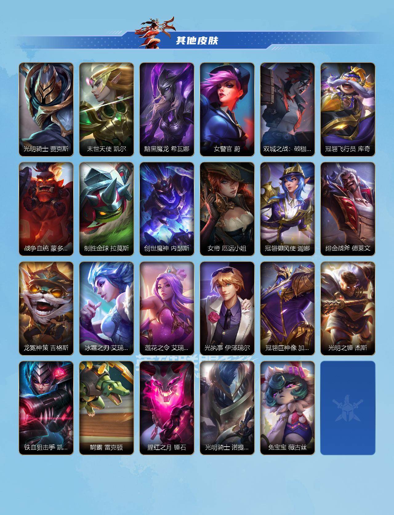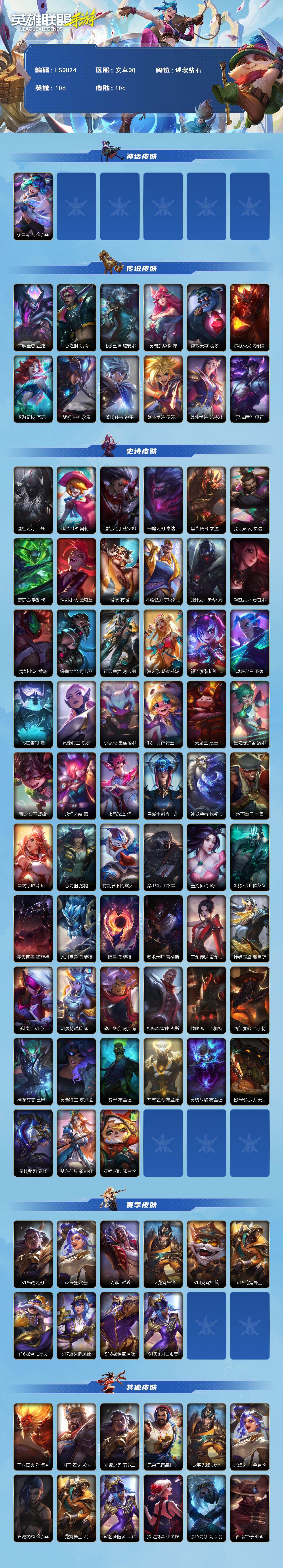 【lsqh24】106英雄/106皮肤/璀璨钻石/夜星流火 金克丝/海魔至尊 亚托克斯/心之钢 凯隐/北极星神 黛安娜/灵魂莲华 阿狸/律政大亨 蒙多医生/炼狱魔犬 内瑟斯/深海奇域 厄运小姐/黎明使者 永恩/黎明使者 锐雯/战斗学院 伊泽瑞尔/战斗学院 凯特琳/灵魂莲华 锤石/腥红之月 亚托克斯/泳池派对 奥莉安娜/腥红之月 黛安娜/恶魔之刃 泰达米尔/黑夜使者 泰达米尔/沧浪破云 泰达米尔/猎梦吞噬者 卡兹克/清剿小队 金克丝/猛虎 布隆/礼物选好了吗? 布隆/源计划:升华 烬/魅惑女巫 莫甘娜/清剿小队 潘森/铁血女忍 阿卡丽/行云墨舞 阿卡丽/海之歌 萨勒芬妮/银河魔装机神 安妮/战场之王 亚索/死亡誓约 劫/灵能特工 凯尔/小恶魔 崔丝塔娜/我,羽饰骑士 崔丝塔娜/大魔王 提莫/星之守护者 娑娜/驯龙女巫 璐璐/永恒之森 霞/水晶玫瑰 洛/星域审判官 卡蜜尔/神龙尊者 均衡之龙 沃利贝尔/地下拳王 李青/星之守护者 厄运小姐/心之钢 瑟提/持胡萝卜的雪人 易/禁卫机甲 格雷福斯/玉剑传说 风仙子 迦娜/破败军团 德莱文/霸天巨兽 墨菲特/冰川巨兽 墨菲特/暗星 墨菲特/奥术大师 吉格斯/玉剑传说 武剑仙 锐雯/峥嵘墨峰 韦鲁斯/源计划:雄心 卡特琳娜/幻灵特战羚 索拉卡/战斗学院 阿克尚/抵抗军雷神 杰斯/战地机甲 厄加特/西部魔影 厄加特/神龙尊者 星界之龙 卡萨丁/灵能特工 莎弥拉/丧尸 布兰德/苍穹之光 布兰德/灵魂烈焰 布兰德/欧米伽小队 天雷爆破手 维迦/星域秘刃 泰隆/梦游仙境 莉莉娅/红帽迷影 薇古丝/s1光耀之刃/s2光耀之芒/s7绯金战斧/s12龙冕先锋/s14龙冕神策/s15龙冕异士/s16冠翎飞行员/s17冠翎御风使/s18冠翎巨神像/s19冠翎征服者/三昧真火 孙悟空/国王 泰达米尔/光耀之刃 泰达米尔/兄弟已百暴! 泰达米尔/龙冕先锋 赵信/光耀之芒 金克丝/双城之战 金克丝/龙冕异士 烬/冠翎征服者 尼菈/探戈灵魂 伊芙琳/银色之牙 阿卡丽/西部牛仔 亚索/光明骑士 贾克斯/末世天使 凯尔/黯黑魔龙 希瓦娜/女警官 蔚/双城之战:破枷 蔚/冠翎飞行员 库奇/战争血统 蒙多医生/制胜金球 拉莫斯/创世魔神 内瑟斯/女帝 厄运小姐/冠翎御风使 迦娜/绯金战斧 德莱文/龙冕神策 吉格斯/冰霜之刃 艾瑞莉娅/莲花之令 艾瑞莉娅/光执事 伊泽瑞尔/冠翎巨神像 加里奥/光明之锤 杰斯/铁血狙击手 凯特琳/鳄霸 雷克顿/腥红之月 锤石/光明骑士 诺提勒斯/兔宝宝 薇古丝