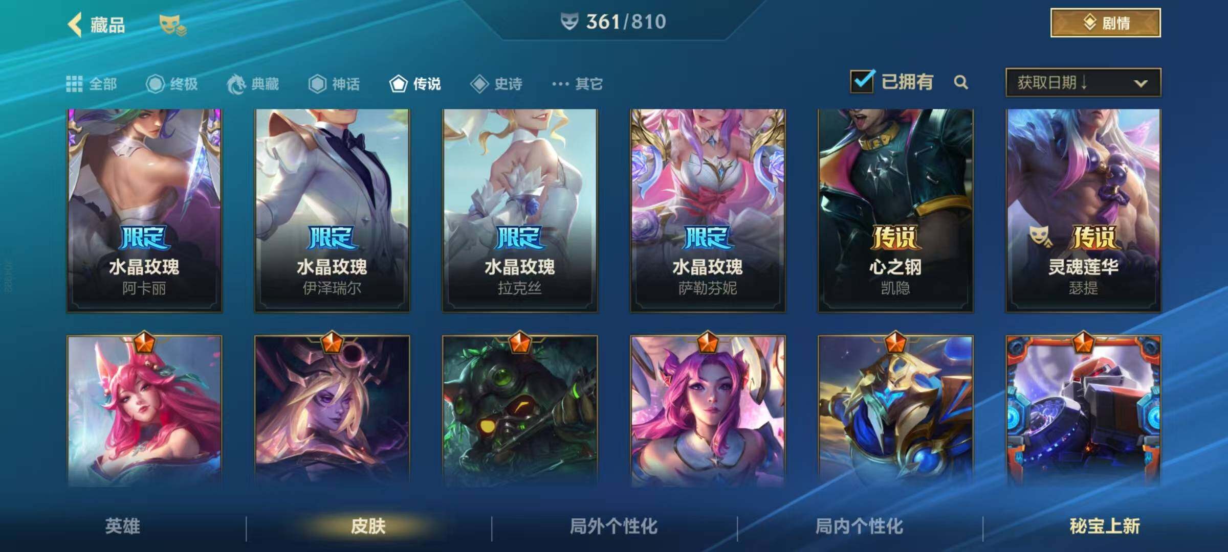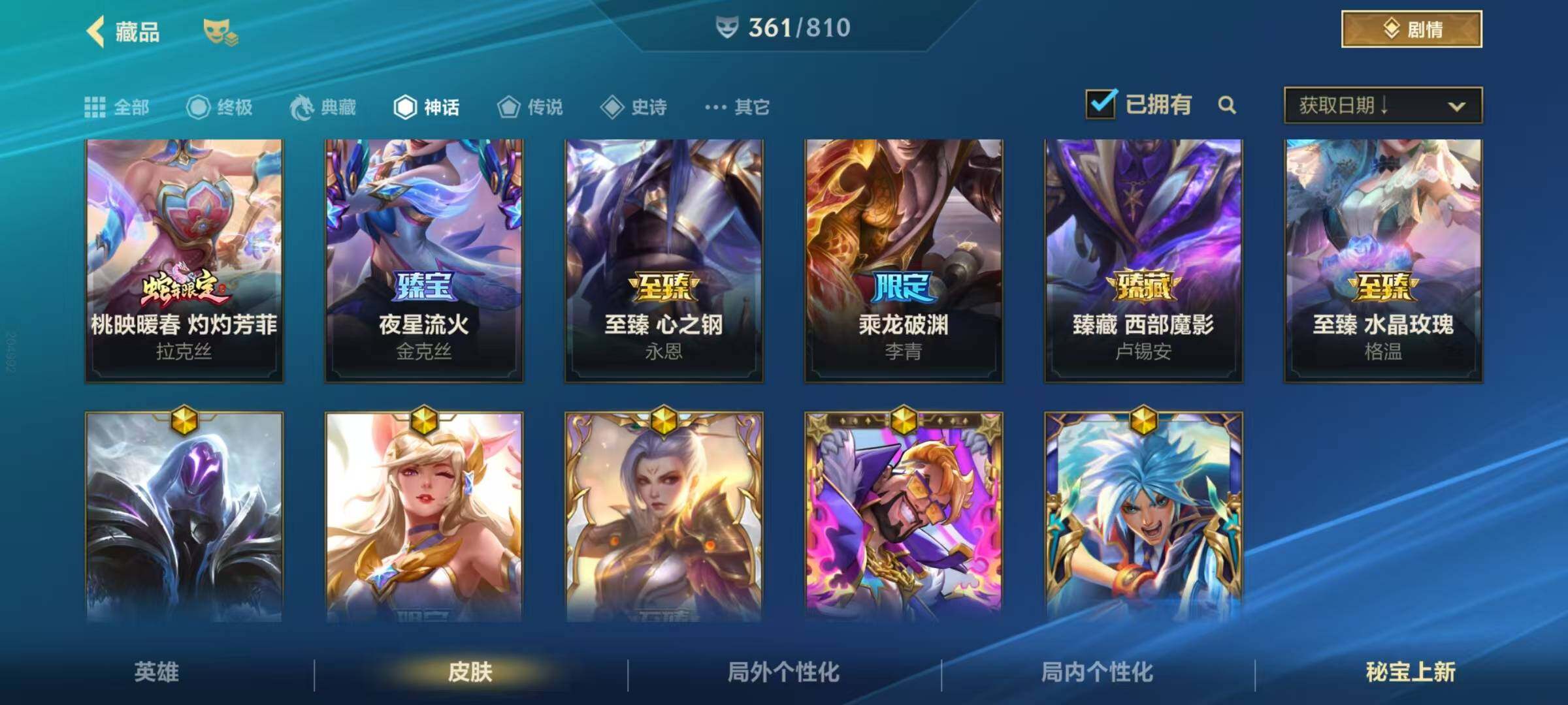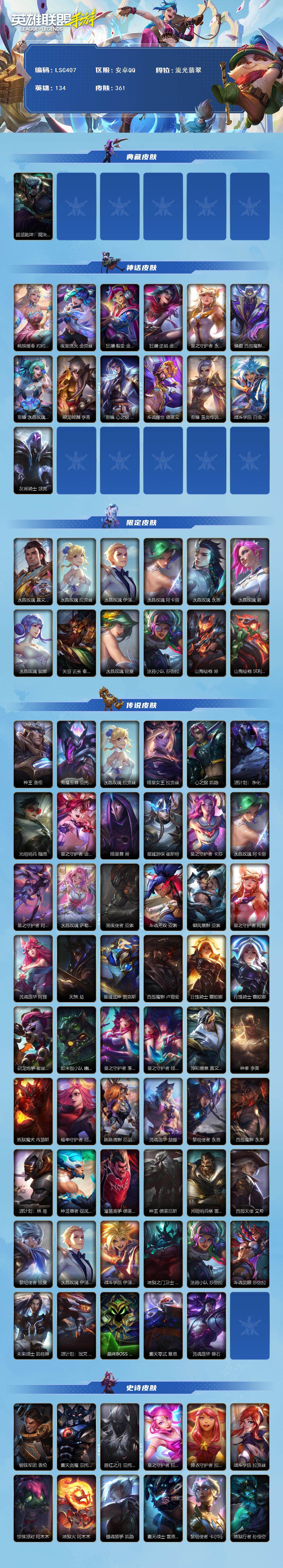 【lsc407】134英雄/361皮肤/1典藏/12神话/53传说/188史诗/流光翡翠/超武乾坤:裁决/桃映暖春灼灼芳菲拉克丝/夜星流火 金克丝/狂潮·裂变 金克丝/狂潮·逆焰 金克丝/星之守护者阿狸永绽盛芒/臻藏西部魔影卢锡安/至臻 水晶玫瑰 格温/乘龙破渊李青/至臻心之钢永恩/斗魂耀世德莱文/至臻 玉剑传说 武剑仙 锐雯/战斗学院白金学长伊泽瑞尔/灰烬骑士派克/水晶玫瑰皇子/水晶玫瑰 拉