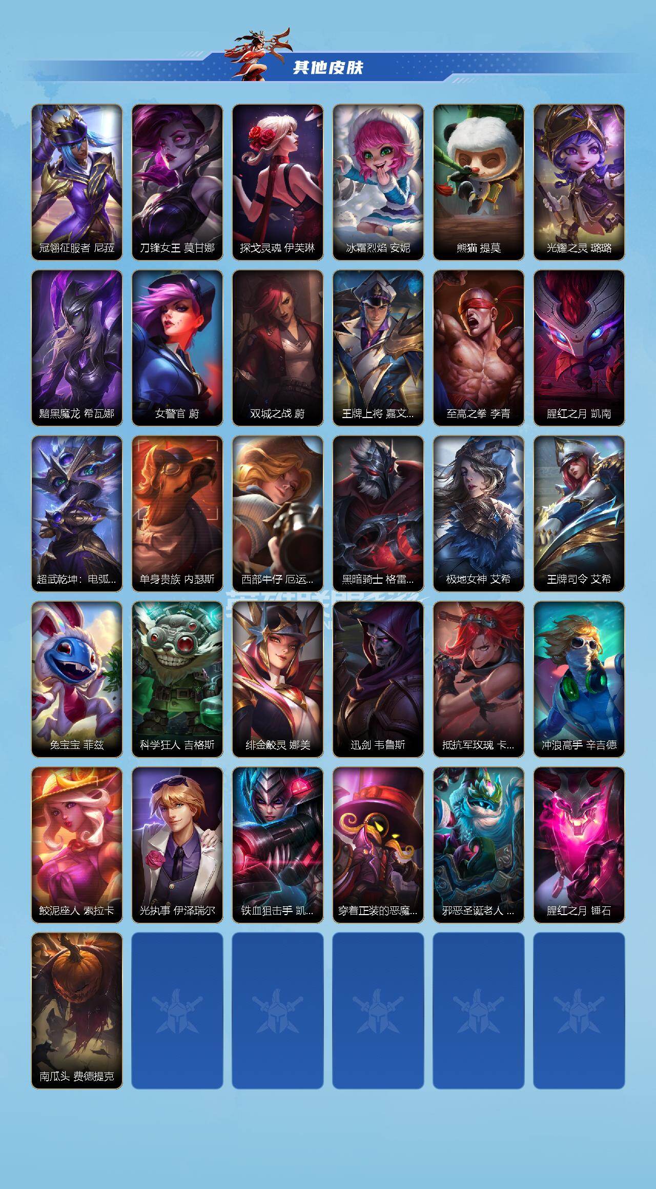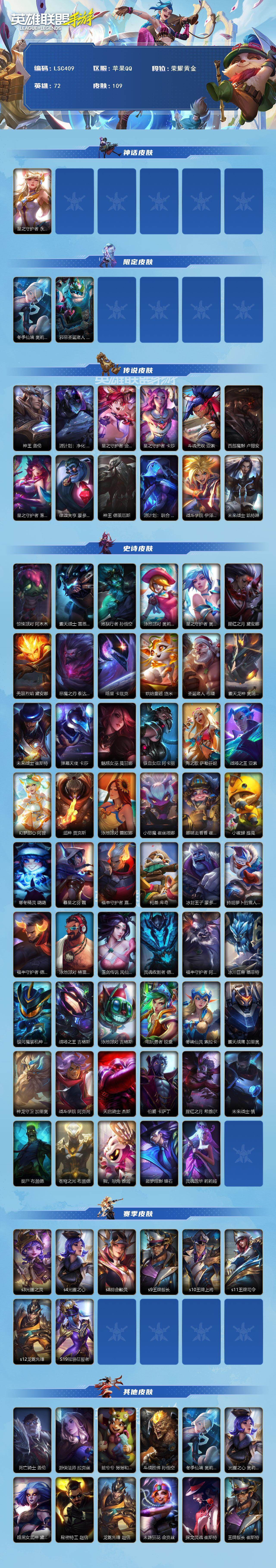 【lsc409】72英雄/109皮肤/1神话/12传说/荣耀黄金/星之守护者 永绽盛芒 阿狸/冬季仙境 奥莉安娜/邪恶圣诞老人 维迦/神王 盖伦/源计划:净化 薇恩/星之守护者 金克丝/星之守护者 卡莎/斗魂无双 亚索/西部魔影 卢锡安/星之守护者 落 霞/律政大亨 蒙多医生/神王 德莱厄斯/源计划:联合 艾希/战斗学院 伊泽瑞尔/未来战士 凯特琳/惊悚派对 阿木木/霸天战士 雷恩加尔/地狱行者 孙悟空/泳池派对 奥莉安娜/星之守护者 奥莉安娜/腥红之月 黛安娜/无限烈焰 黛安娜/恶魔之刃 泰达米尔/暗星 卡兹克/烘焙童谣 悠米/圣诞老人 布隆/霸天龙神 奥瑞利安·索尔/未来战士 崔斯特/弹幕天使 卡莎/魅惑女巫 莫甘娜/铁血女忍 阿卡丽/海之歌 萨勒芬妮/战场之王 亚索/幻梦甜心 阿狸/武神 贾克斯/泳池派对 蕾欧娜/小恶魔 崔丝塔娜/娜就去看看 崔丝塔娜/小蜜蜂 提莫/寒冬精灵 璐璐/暮星之羽 霞/福牛守护者 嘉文四世/柯基 库奇/冰封王子 蒙多医生/持胡萝卜的雪人 易/福牛守护者 德莱厄斯/泳池派对 格雷福斯/玉剑传说 风仙子 迦娜/灵魂收割者 德莱文/福牛守护者 阿利斯塔/冰川巨兽 墨菲特/银河魔装机神 菲兹/战场之王 吉格斯/泳池派对 吉格斯/电玩勇者 锐雯/冬境仙灵 索拉卡/霸天战鹰 加里奥/神龙守卫 加里奥/战斗学院 阿克尚/天启骑士 杰斯/伯爵 卡萨丁/腥红之月 希维尔/未来战士 慎/丧尸 布兰德/苍穹之光 布兰德/我,怒角 维迦/盗梦暗影 锤石/灵魂莲华 莉莉娅/s3光耀之灵/s4光耀之心/s8绯金鮫灵/s9王牌舰长/s10王牌上将/s11王牌司令/s12龙冕先锋/s19冠翎征服者/死亡骑士 盖伦/游侠法师 拉克丝/脏兮兮 努努和威朗普/斗战胜佛 孙悟空/光耀之心 奥莉安娜/暗黑女武神 黛安娜/秘密特工 赵信/龙冕先锋 赵信/末路狂花 金克丝/探戈灵魂 崔斯特/王牌舰长 崔斯特/冠翎征服者 尼菈/刀锋女王 莫甘娜/探戈灵魂 伊芙琳/冰霜烈焰 安妮/熊猫 提莫/光耀之灵 璐璐/黯黑魔龙 希瓦娜/女警官 蔚/双城之战 蔚/王牌上将 嘉文四世/至高之拳 李青/腥红之月 凯南/超武乾坤:电弧 凯南/单身贵族 内瑟斯/西部牛仔 厄运小姐/黑暗骑士 格雷福斯/极地女神 艾希/王牌司令 艾希/兔宝宝 菲兹/科学狂人 吉格斯/绯金鲛灵 娜美/迅箭 韦鲁斯/抵抗军玫瑰 卡特琳娜/冲浪高手 辛吉德/蕉泥座人 索拉卡/光执事 伊泽瑞尔/铁血狙击手 凯特琳/穿着正装的恶魔 维迦/腥红之月 锤石/南瓜头 费德提克