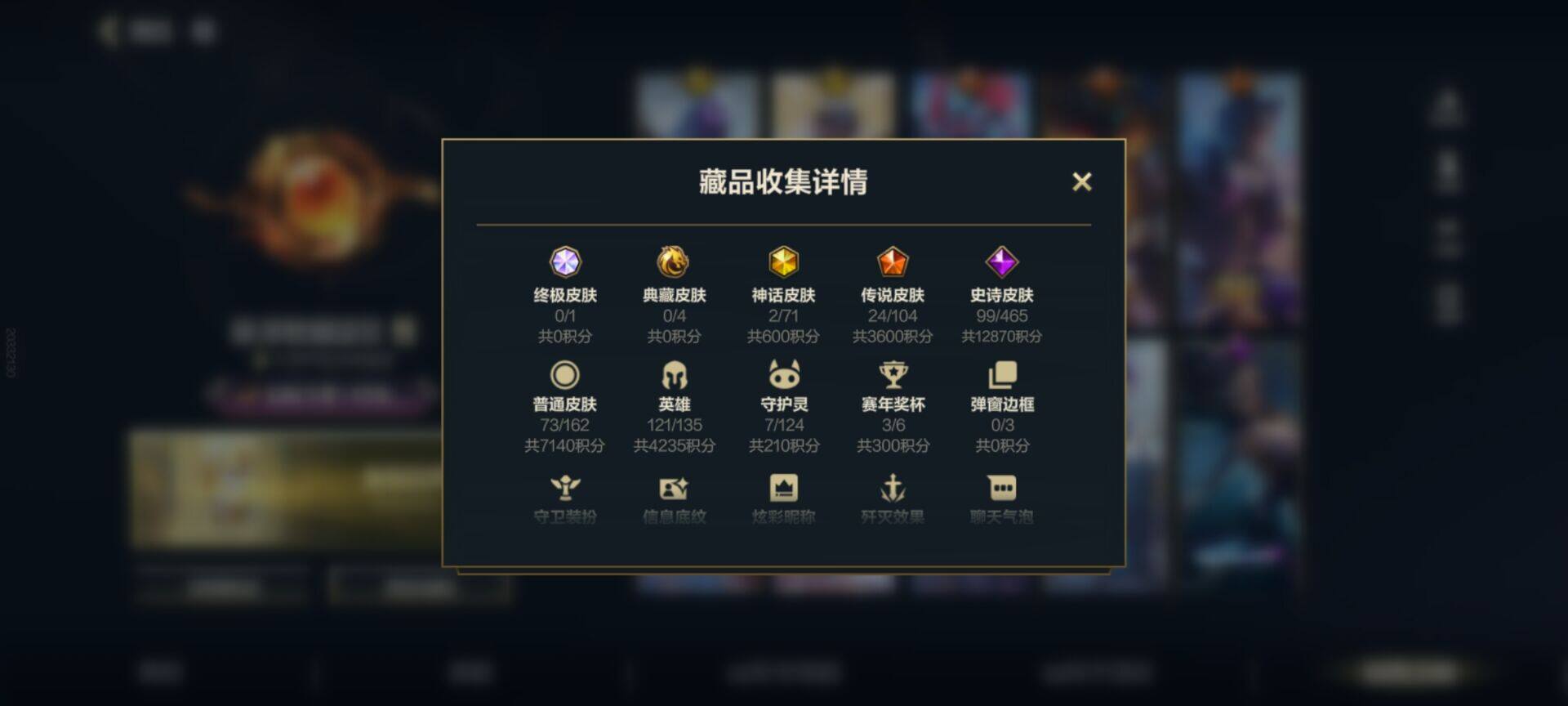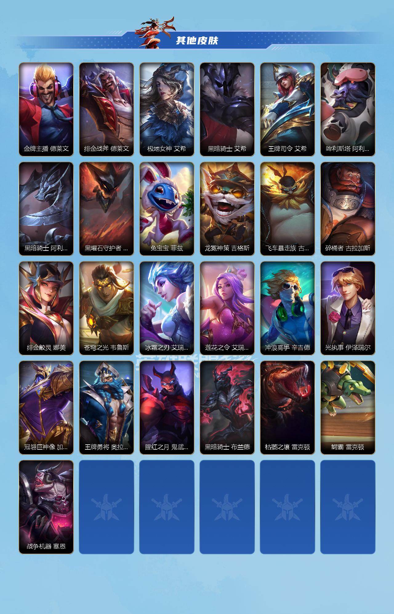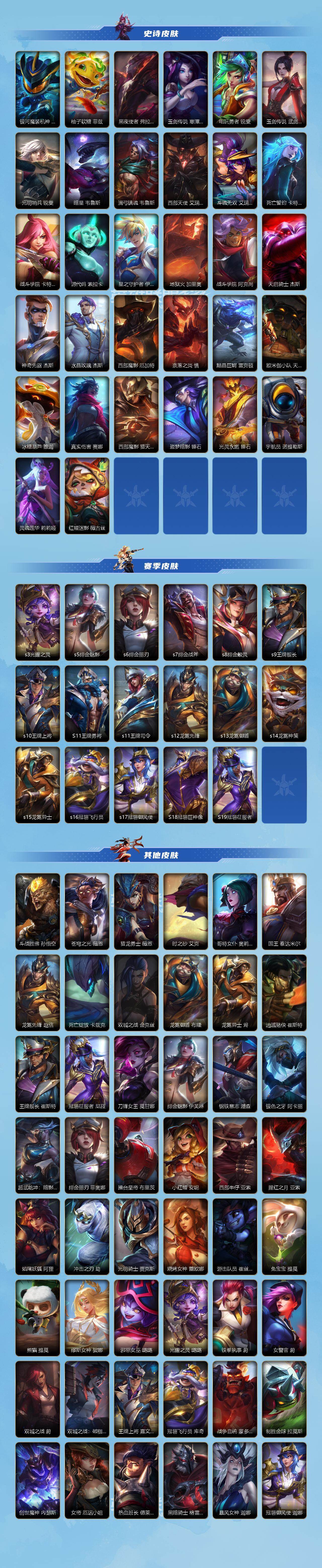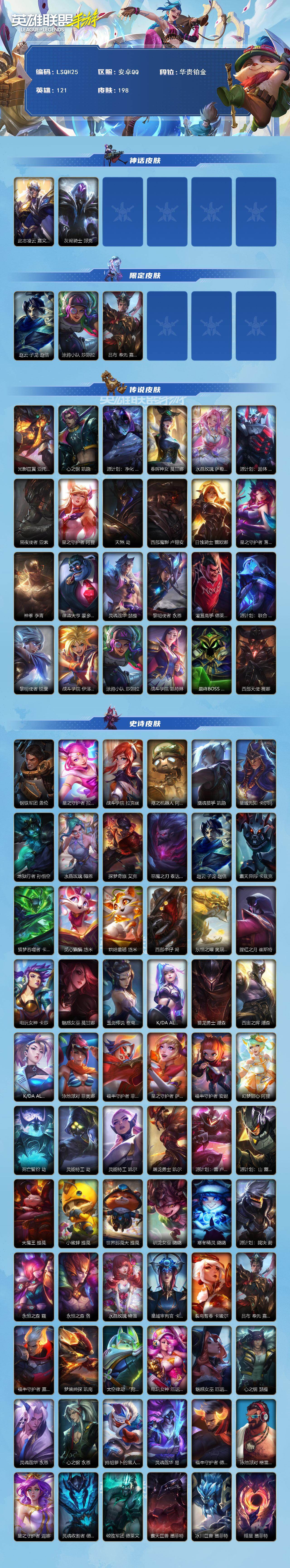 【lsqh25】121英雄/198皮肤/2神话/24传说/99史诗/华贵铂金/此志凌云 嘉文四世/灰烬骑士 派克/赵云 子龙 赵信/涂鸦小队 莎弥拉/吕布 奉先 嘉文四世/光影巨翼 亚托克斯/心之钢 凯隐/源计划:净化 薇恩/春晖神女 莫甘娜/水晶玫瑰 萨勒芬妮/源计划:超体 莫德凯撒/黑夜使者 亚索/星之守护者 阿狸/天煞 劫/西部魔影 卢锡安/日蚀骑士 蕾欧娜/星之守护者 落 霞/神拳 李青/律政大亨 蒙多医生/灵魂莲华 瑟提/黎明使者 永恩/灌篮高手 德莱厄斯/源计划:联合 艾希/黎明使者 锐雯/战斗学院 伊泽瑞尔/战斗学院 凯特琳/最终boss 维迦/西部天使 赛娜/钢铁军团 盖伦/星之守护者 拉克丝/战斗学院 拉克丝/殇之机器人 阿木木/摄魂猎手 凯隐/星域先知 卡尔玛/地狱行者 孙悟空/水晶玫瑰 薇恩/探梦奇旅 艾克/恶魔之刃 泰达米尔/霸天异形 卡兹克/猎梦吞噬者 卡兹克/觅心猫猫 悠米/烘焙童谣 悠米/西部牛仔 烬/东恒之曜 奥瑞利安·索尔/腥红之月 崔斯特/电玩女神 卡莎/魅惑女巫 莫甘娜/玉剑传说 苍鸾 莫甘娜/k/da all out 伊芙琳/猎龙勇士 潘森/西宙之晖 潘森/k/da all out 阿卡丽/泳池派对 菲奥娜/福牛守护者 菲奥娜/星之守护者 萨勒芬妮/福牛守护者 安妮/幻梦甜心 阿狸/死亡誓约 劫/灵能特工 劫/灵能特工 凯尔/屠龙勇士 凯尔/源计划:雷 卢锡安/源计划:山 蕾欧娜/大魔王 提莫/小蜜蜂 提莫/世界那莫大 提莫/驯龙女巫 璐璐/寒冬精灵 璐璐/源计划:裁决 蔚/永恒之森 霞/永恒之森 洛/水晶玫瑰 格温/星域审判官 卡蜜尔/裂帛剪春 卡蜜尔/福牛守护者 嘉文四世/梦境绅探 凯南/太空律动 “狗头” 内瑟斯/电玩女神 厄运小姐/魅惑女巫 厄运小姐/心之钢 瑟提/灵魂莲华 永恩/心之钢 永恩/持胡萝卜的雪人 易/灵魂莲华 易/福牛守护者 德莱厄斯/泳池派对 格雷福斯/星之守护者 迦娜/灵魂收割者 德莱文/破败军团 德莱文/霸天巨兽 墨菲特/冰川巨兽 墨菲特/暗星 墨菲特/银河魔装机神 菲兹/柚子软糖 菲兹/黑夜使者 弗拉基米尔/玉剑传说 寒潭夭夭 娜美/电玩勇者 锐雯/玉剑传说 武剑仙 锐雯/光明哨兵 锐雯/暗星 韦鲁斯/满弓镇魂 韦鲁斯/西部天使 艾瑞莉娅/斗魂无双 艾瑞莉娅/死亡誓约 卡特琳娜/战斗学院 卡特琳娜/源代码 索拉卡/星之守护者 伊泽瑞尔/地狱火 加里奥/战斗学院 阿克尚/天启骑士 杰斯/神奇先驱 杰斯/水晶玫瑰 杰斯/西部魔影 厄加特/奈落之炎 慎/黯晶巨鳄 雷克顿/欧米伽小队 天雷爆破手 维迦/冰糖葫芦 维迦/真实伤害 赛娜/西部魔影 猎天使恶魔 泰隆/盗梦暗影 锤石/光灵永燃 锤石/宇航员 诺提勒斯/灵魂莲华 莉莉娅/红帽迷影 薇古丝/s3光耀之灵/s5绯金魅影/s6绯金丽刃/s7绯金战斧/s8绯金鮫灵/s9王牌舰长/s10王牌上将/s11王牌勇将/s11王牌司令/s12龙冕先锋/s13龙冕御盾/s14龙冕神策/s15龙冕异士/s16冠翎飞行员/s17冠翎御风使/s18冠翎巨神像/s19冠翎征服者/斗战胜佛 孙悟空/苍穹之光 薇恩/猎龙勇士 薇恩/时之砂 艾克/哥特女仆 奥莉安娜/国王 泰达米尔/龙冕先锋 赵信/死亡绽放 卡兹克/双城之战 金克丝/龙冕御盾 布隆/龙冕异士 烬/赌侠 崔斯特/王牌舰长 崔斯特/冠翎征服者 尼菈/刀锋女王 莫甘娜/绯金魅影 伊芙琳/钢铁意志 潘森/银色之牙 阿卡丽/超武乾坤:暗影 阿卡丽/绯金丽刃 菲奥娜/擂台皇帝 布里茨/小红帽 安妮/西部牛仔 亚索/腥红之月 亚索/焰尾妖狐 阿狸/冲击之刃 劫/光明骑士 贾克斯/烧烤女神 蕾欧娜/游击队员 崔丝塔娜/兔宝宝 提莫/熊猫 提莫/缪斯女神 娑娜/邪恶女巫 璐璐/光耀之灵 璐璐/铁拳执事 蔚/女警官 蔚/双城之战 蔚/双城之战:破枷 蔚/王牌上将 嘉文四世/冠翎飞行员 库奇/战争血统 蒙多医生/制胜金球 拉莫斯/创世魔神 内瑟斯/女帝 厄运小姐/热血班长 德莱厄斯/黑暗骑士 格雷福斯/暴风女神 迦娜/冠翎御风使 迦娜/金牌主播 德莱文/绯金战斧 德莱文/极地女神 艾希/黑暗骑士 艾希/王牌司令 艾希/哞利斯塔 阿利斯塔/黑暗骑士 阿利斯塔/黑曜石守护者 墨菲特/兔宝宝 菲兹/龙冕神策 吉格斯/飞车暴走族 古拉加斯/碎桶者 古拉加斯/绯金鲛灵 娜美/苍穹之光 韦鲁斯/冰霜之刃 艾瑞莉娅/莲花之令 艾瑞莉娅/冲浪高手 辛吉德/光执事 伊泽瑞尔/冠翎巨神像 加里奥/王牌勇将 奥拉夫/腥红之月 鬼武者 慎/黑暗骑士 布兰德/枯萎之壤 雷克顿/鳄霸 雷克顿/战争机器 赛恩