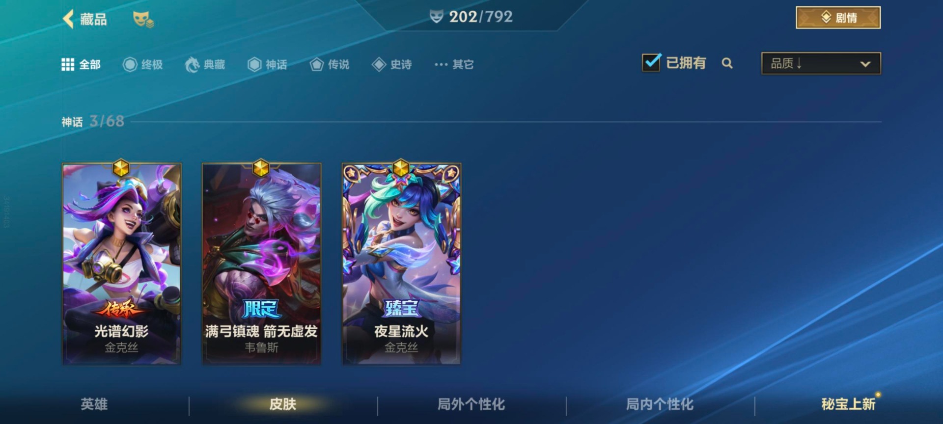 3神话 9限定 32传说 88史诗 202皮肤 可二次 可修改实名 【段位】大师 【神话皮】夜星流火 金克丝满弓镇魂 箭无虚发 韦鲁斯光谱幻影金克丝 【限定皮肤】御星魔矢斩星魔剑星之守护者霞星之守护者洛虎痴之拳张辽文远水晶玫瑰皇子吕布奉先无与伦比剑圣 【传说皮】暗星尊花车开起
