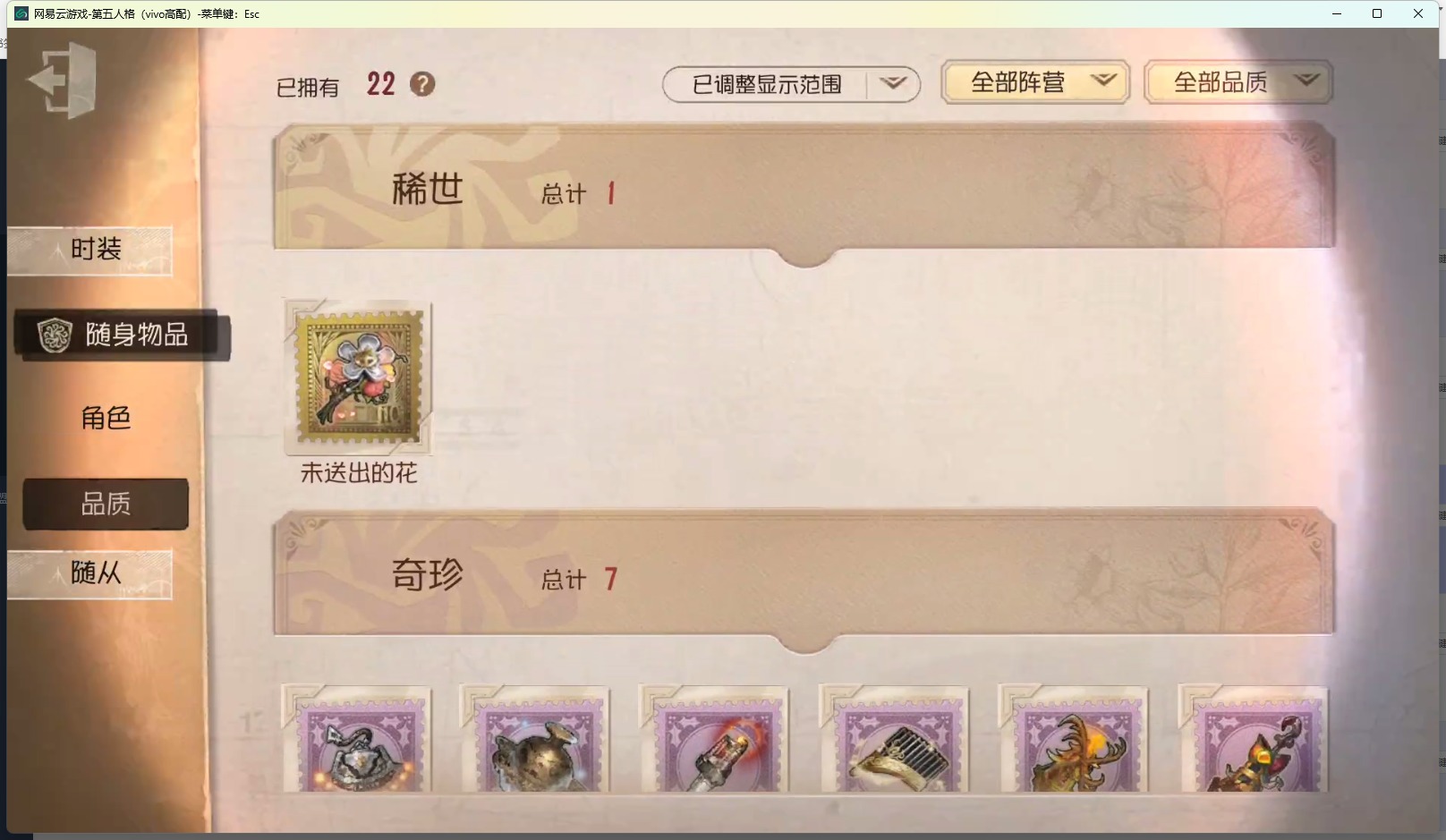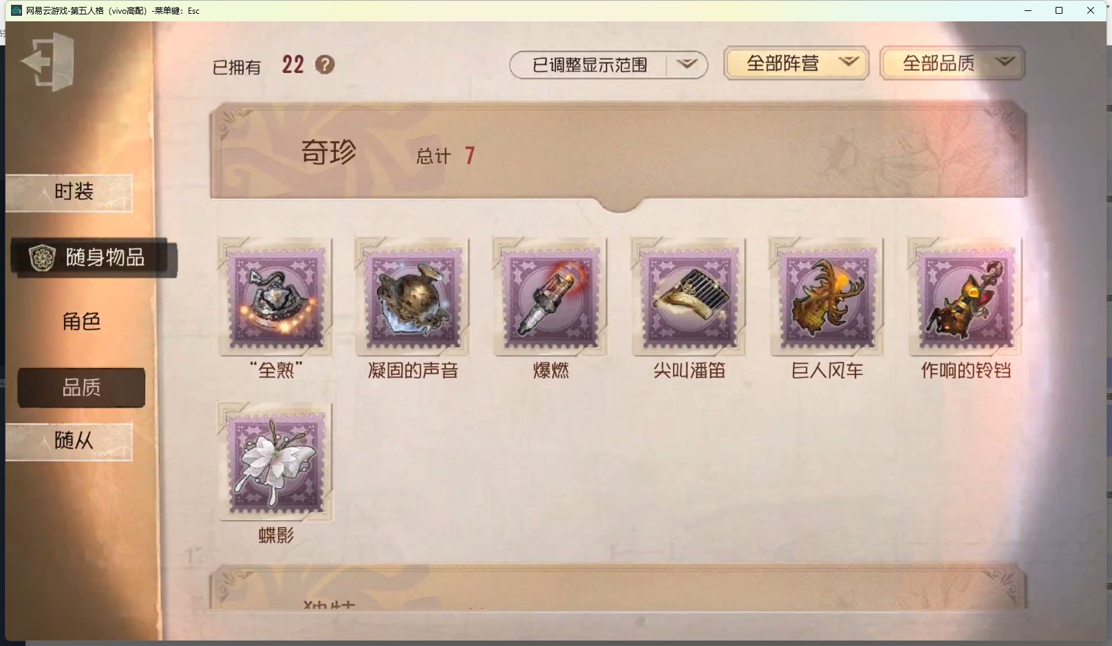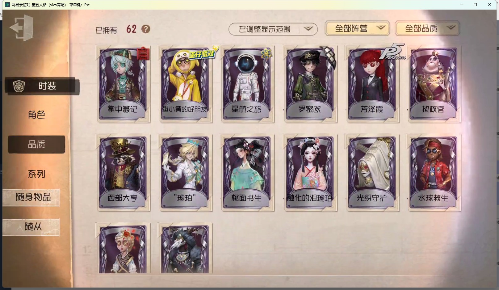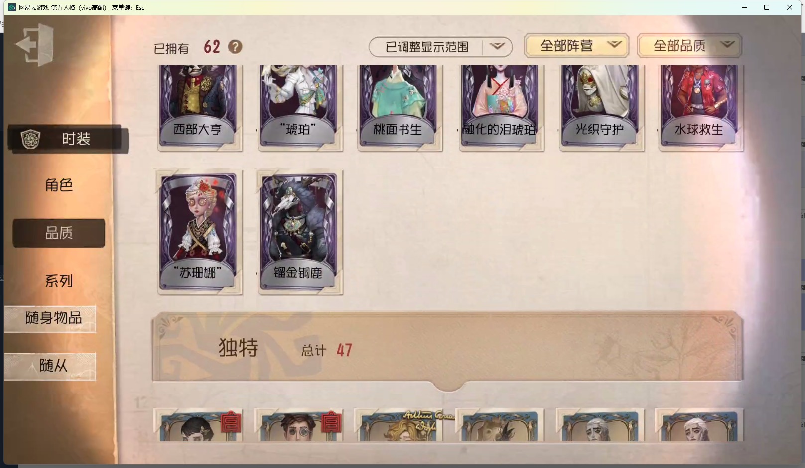 [13012025]vivo 手机账号 62时装 1金皮 14紫皮 4随从 22随身物品 【时装】:鹿头-镏金铜鹿幸运儿-星航之旅红蝶-壹原侑子爱丽丝·德罗斯-片刻闲暇蜘蛛-光织守护“记录员”-执政官画家-掌中篆记红蝶-融化的泪琥珀幸运儿-蛋小黄的好朋友病患-罗密欧宿伞之魂-桃面书生摄影师-“琥珀”“法罗女士”-芳泽霞前锋-水球救生26号守卫-西部大亨空军-“苏珊娜” 【随身物品】:“全熟”奇珍作响的铃铛奇珍凝固的声音奇珍爆燃奇珍尖叫潘笛奇珍巨人风车奇珍蝶影奇珍未送出的花稀世