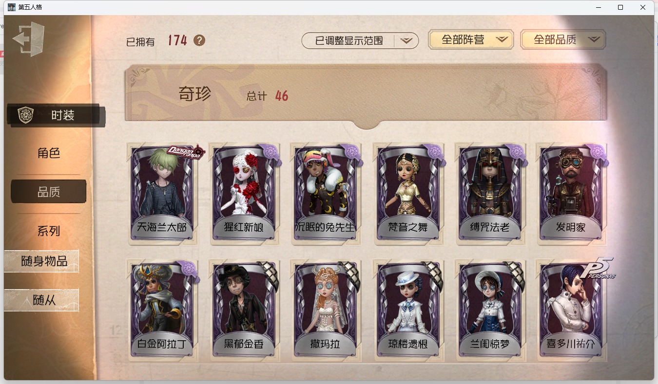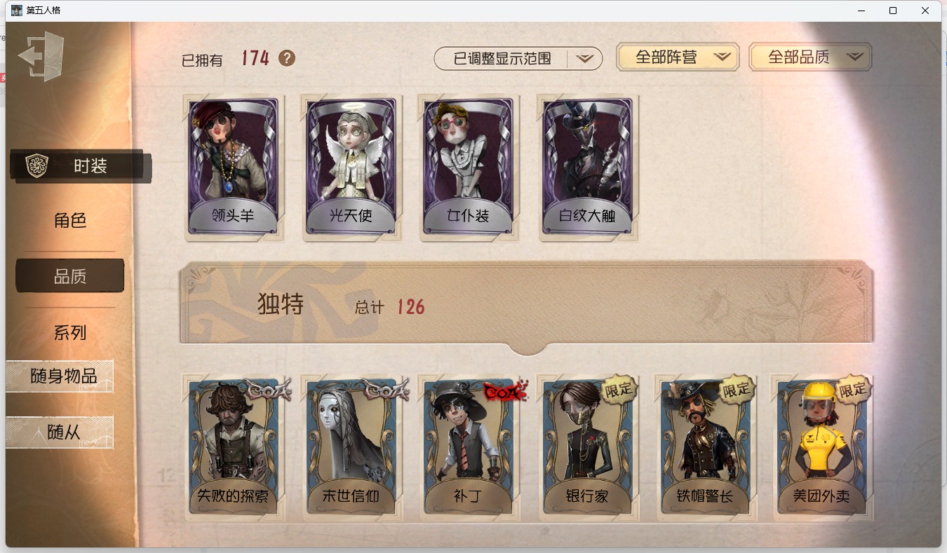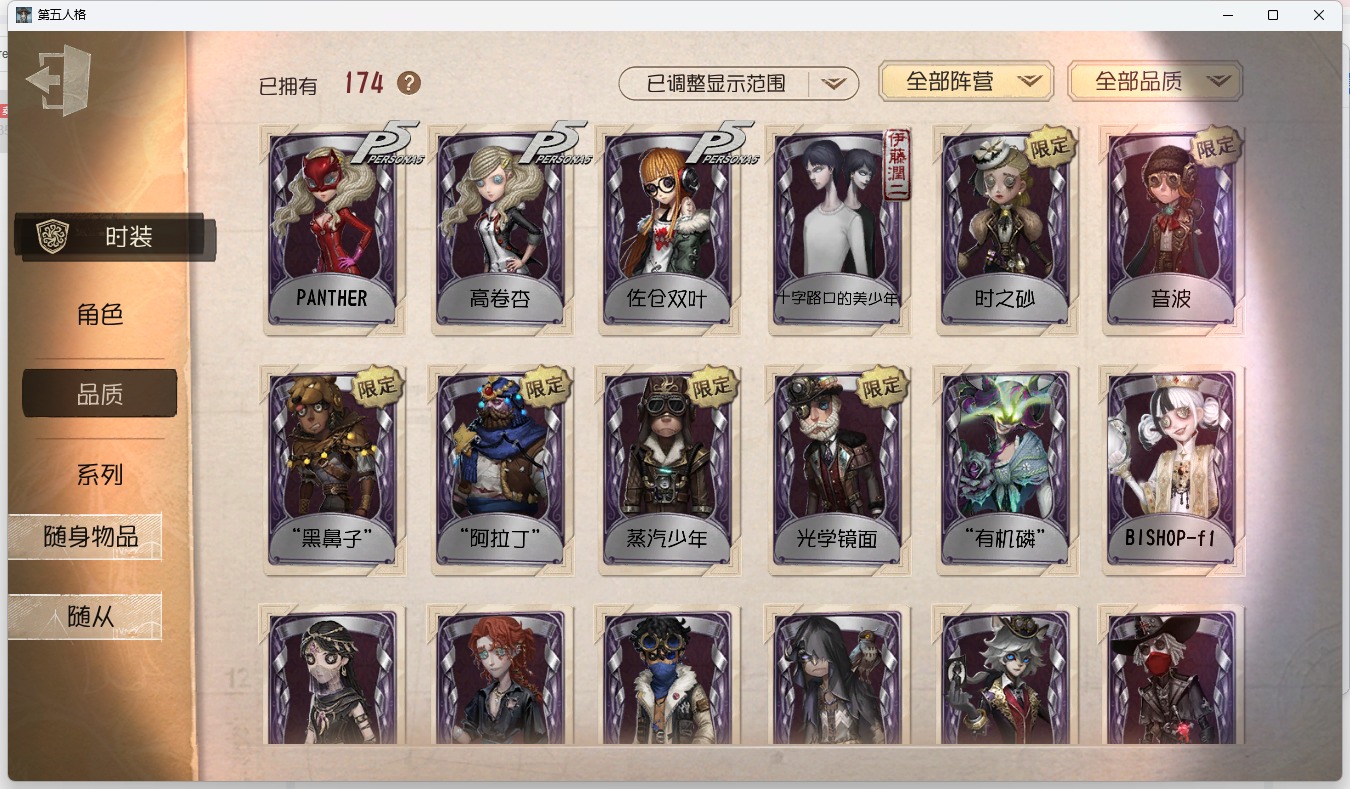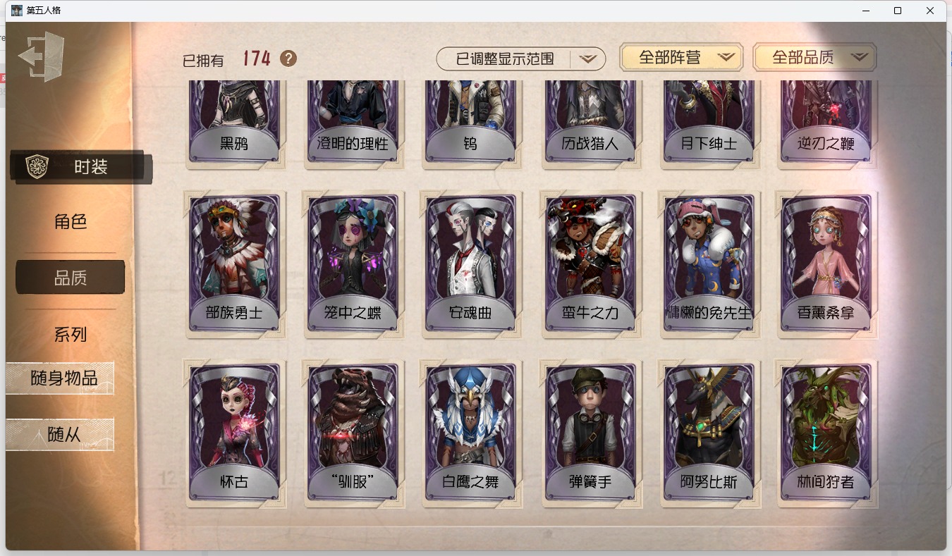 [13641310]安卓官服 手机账号 174时装 2金皮 46紫皮 15随从 91随身物品 【时装】:拉拉队员-bishop-f1佣兵-弹簧手佣兵-白鹰之舞佣兵-蒸汽少年佣兵-缚咒法老“囚徒”-天海兰太郎杂技演员-雨宫莲时空之影-“有机磷”空军-琼楼遗恨空军-怀古祭司-撒玛拉机械师-佐仓双叶鹿头-阿努比斯魔术师-白金阿拉丁魔术师-光学镜面勘探员-黑郁金香厂长-“驯服”“慈善家”-舞狮舞女-梵音之舞舞女-高卷杏舞女-panther舞女-香薰桑拿调香师-笼中之蝶调香师-时之砂调香师-猩红新娘园丁-兰闺惊梦牛仔-部族勇士前锋-慵懒的兔先生前锋-沉眠的兔先生前锋-蛮牛之力前锋-“黑鼻子”冒险家-发明家盲女-音波宿伞之魂-安魂曲宿伞之魂-十字路口的美少年入殓师-喜多川祐介