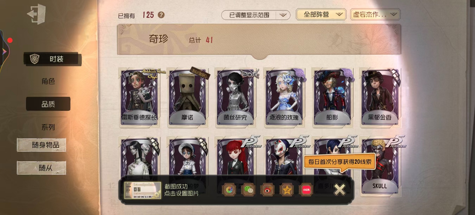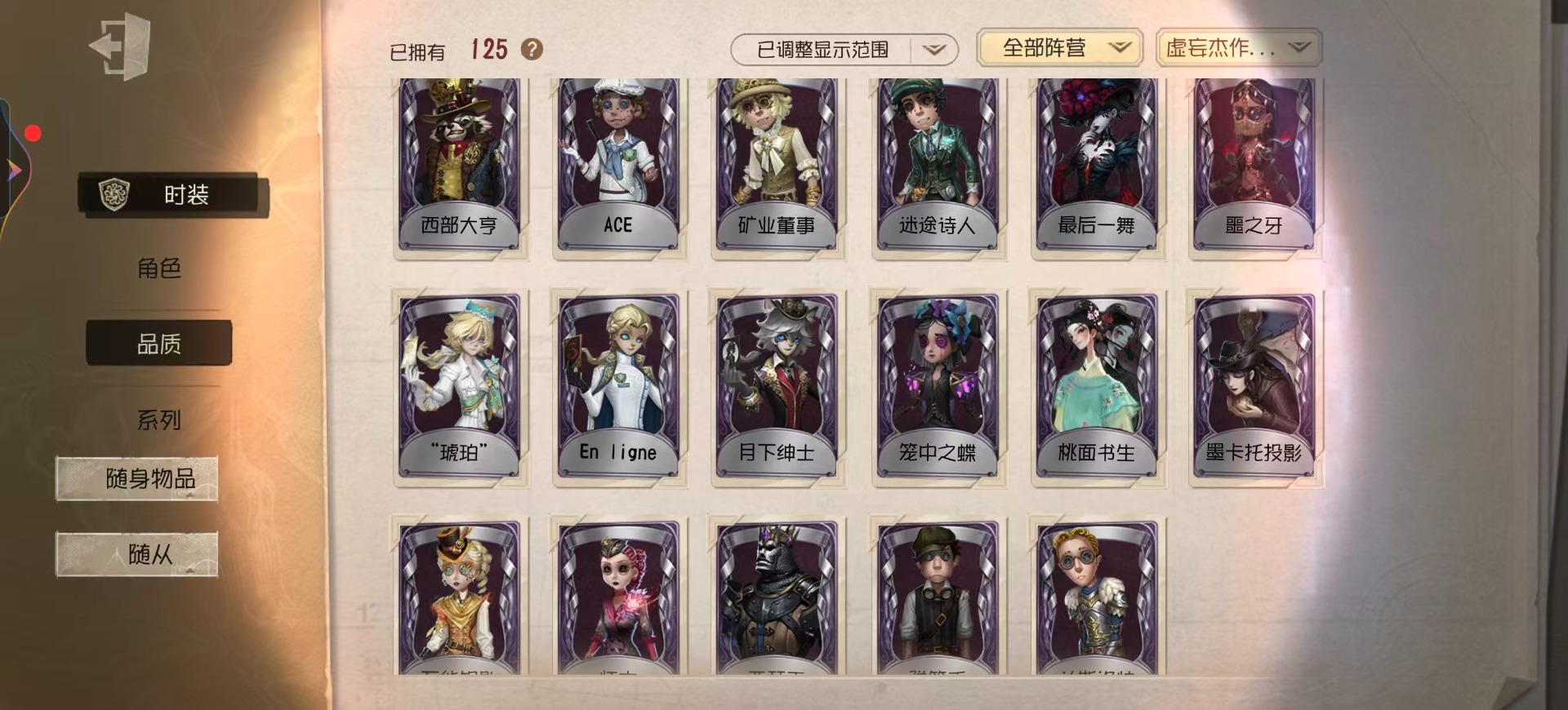[15573506]vivo 手机账号 125时装 2金皮 41紫皮 5随从 55随身物品 【时装】牛仔-船影古董商-菌丝研究爱哭鬼-摩诺蜘蛛-墨卡托投影飞行家-异相睡眠咒术师-噩之牙邮差-“亡灵”杂技演员-ace宿伞之魂-桃面书生摄影师-“琥珀”小提琴家-民谣乐手破轮-沙滩漂移调酒师-逐浪的玫瑰渔女-鬼脸天蛾玩具商-清洁翼大副-雷斯垂德探长木偶师-斐乐蒙的圣坛26号守卫-西部大亨勘探员-日向创勘探员-黑郁金香勘探员-迷途诗人勘探员-矿业董事红夫人-最后一舞舞女-高卷杏调香师-笼中之蝶小提琴家-衔尾蛇前锋-坂本龙司摄影师-月下绅士摄影师-en ligne 【随身物品】燃烧的乐章(稀世)进化稀世回旋镖奇珍登峰凝固的声音奇珍充气海豚奇珍结冰的齿轮(奇珍)折柳稀世凝结的梦境奇珍