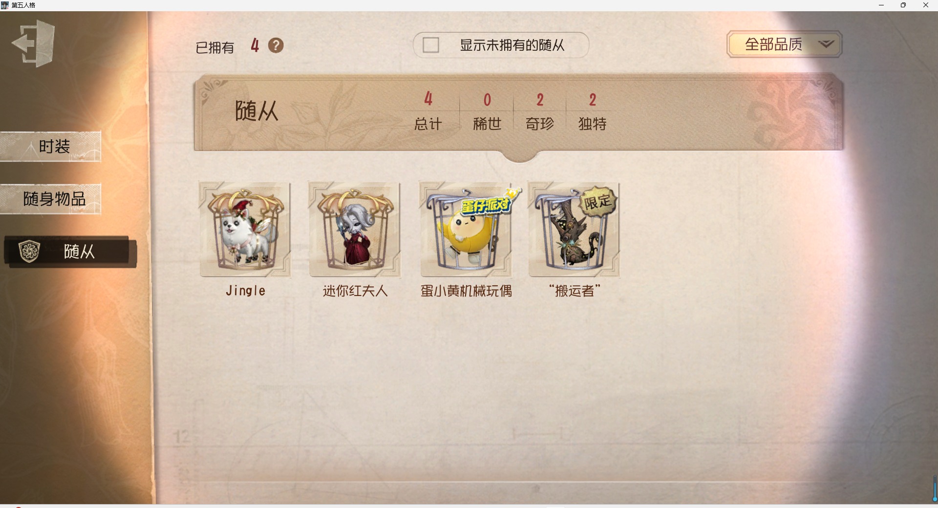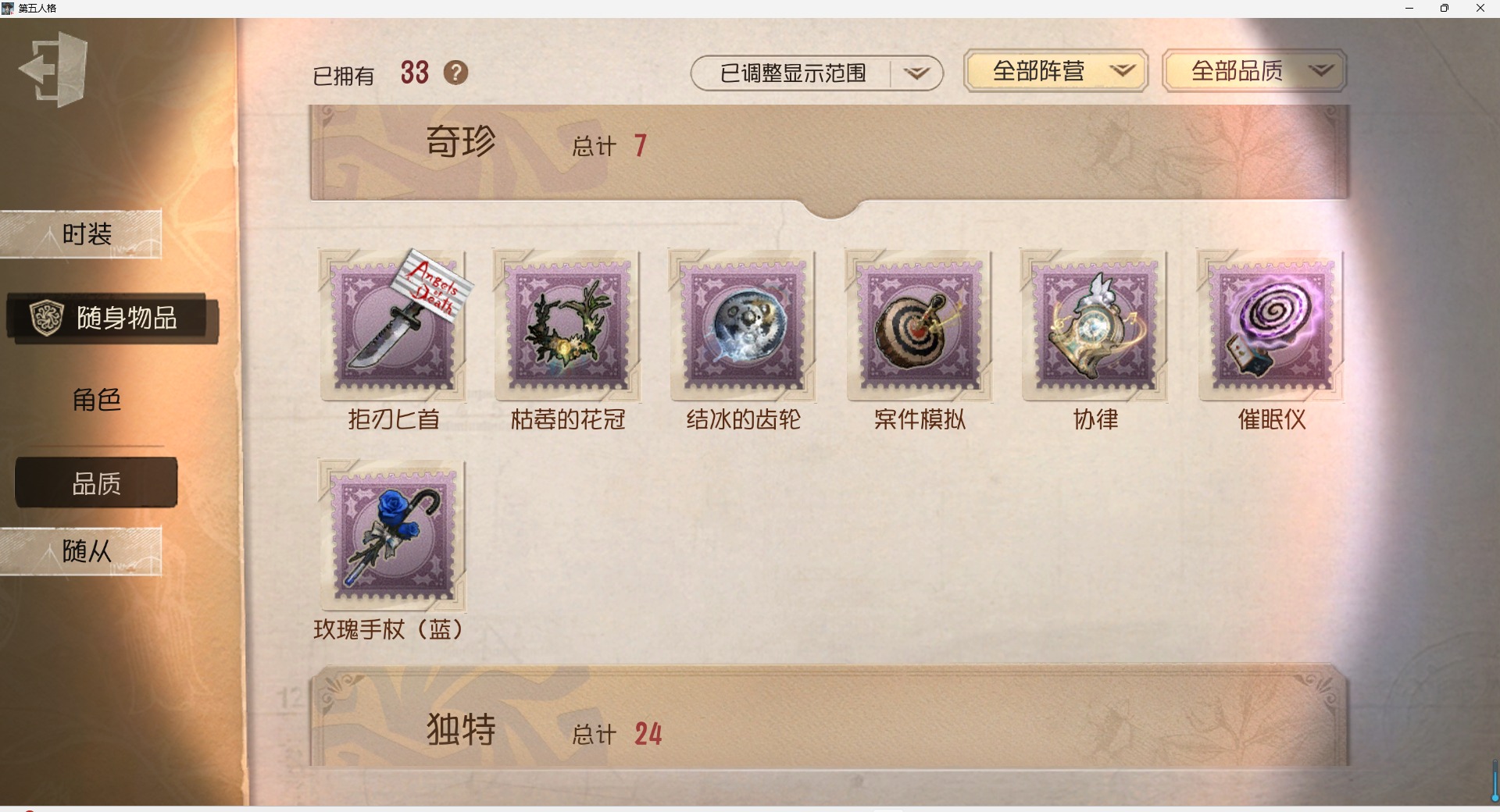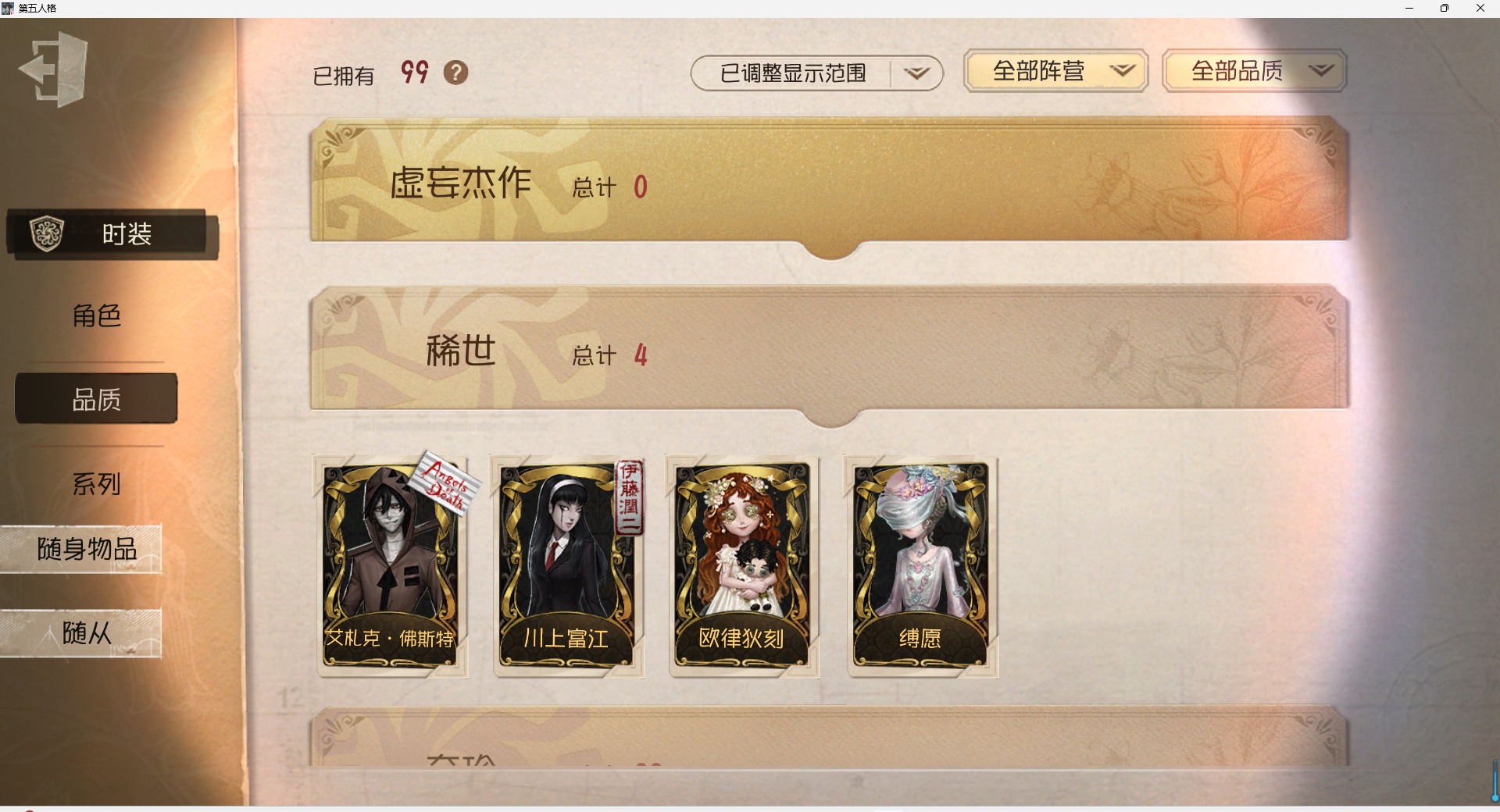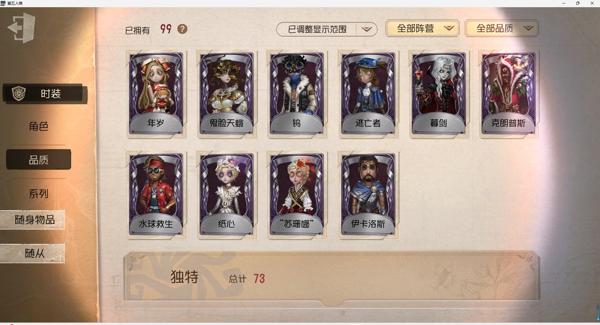[16410193]安卓官服 邮箱账号 99时装 5金皮 22紫皮 4随从 33随身物品 【时装】爱丽丝·德罗斯-片刻闲暇雕刻家-克拉拉黄衣之主-克朗普斯机械师-纸心击球手-钨作曲家-先驱探索飞行家-异相睡眠律师-亚伯拉罕·葛雷教授-丹尼尔·狄更斯空军-凯瑟琳·沃德“噩梦”-圣洁“杰克”-艾札克·佛斯特“小女孩”-欧律狄刻记者-伊布昆虫学者-缚愿前锋-水球救生渔女-鬼脸天蛾幸运儿-蛋小黄的好朋友骑士-艺术品商人空军-“苏珊娜”冒险家-伊卡洛斯画家-逃亡者园丁-兰闺惊梦“小女孩”-年岁梦之女巫-川上富江摄影师-暮剑宿伞之魂-程小时陆光 【随身物品】拒刃匕首(奇珍)枯萎的花冠奇珍结冰的齿轮(奇珍)案件模拟(奇珍)呼唤稀世玫瑰手杖蓝奇珍见证稀世催眠仪奇珍协律奇珍