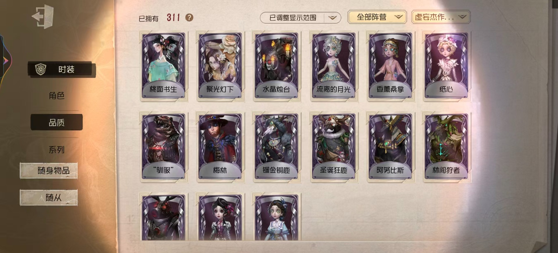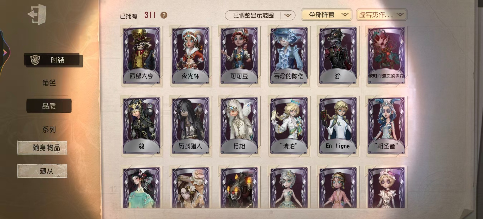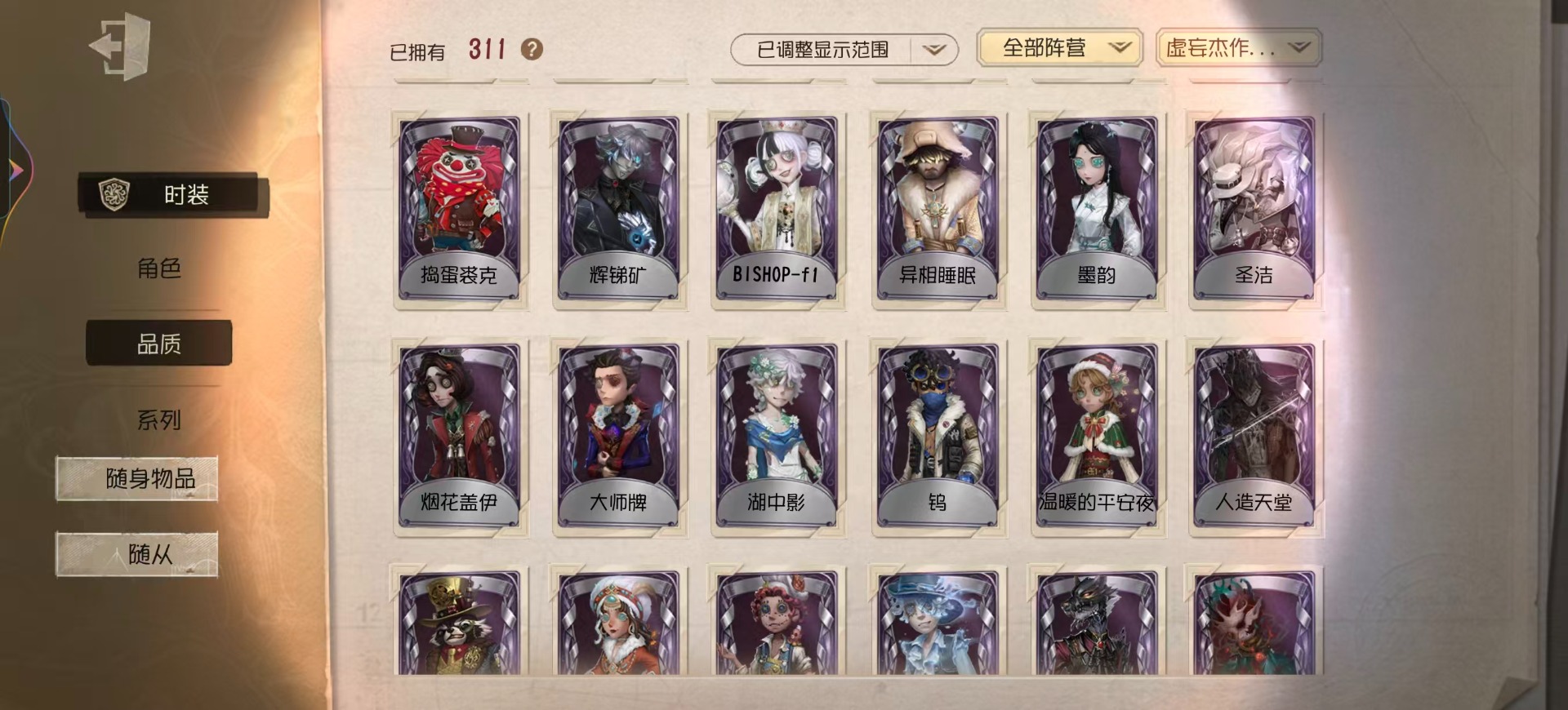 [16452073]vivo 手机账号 311时装 14金皮 75紫皮 15随从 111随身物品 【时装】园丁-源自星辰园丁-“剧场主持”爱丽丝·德罗斯-片刻闲暇勘探员-盖提亚之遗鹿头-闻雷爪画家-温暖的平安夜鹿头-镏金铜鹿拉拉队员-bishop-f1作曲家-先驱探索佣兵-布朗熊小丑-捣蛋裘克蜘蛛-水晶烛台杂技演员-雨宫莲杂技演员-joker杂技演员-可可豆记者-永恒空军-爱神之吻“囚徒”-天海兰太郎小说家-肖驰隐士-薄金 祭司-阿乌拉病患-溯光梦之女巫-裁缝夫人昆虫学者-缚愿记者-巡于归途26号守卫-秘密大厨病患-湖中影宿伞之魂-桃面书生幸运儿-蛋小黄的好朋友古董商-墨韵杂技演员-李天辰邮差-华生医生26号守卫-西部大亨机械师-佐仓双叶鹿头-阿努比斯鹿头-圣诞狂鹿鹿头-林间狩者鹿头-蒸汽朋克哭泣小丑-烟花盖伊厂长-“驯服”“博士”-征服病患-星辰“杰克”-夜来香舞女-香薰桑拿幸运儿-双一先知-月相园丁-奥村春先知-独行者先知-鸩孽蜥-狰梦之女巫-川上富江摄影师-en ligne入殓师-喜多川祐介宿伞之魂-十字路口的美少年 【随身物品】竹龙玉(稀世)灯龙影(稀世)海之低语(奇珍)进化稀世至识之眼稀世转位稀世凝固的声音奇珍沙漠精灵(奇珍)“密约”奇珍缚翼稀世拾贝奇珍结冰的齿轮(奇珍)茶话时间奇珍斗牛布奇珍日与月奇珍生日拉炮奇珍