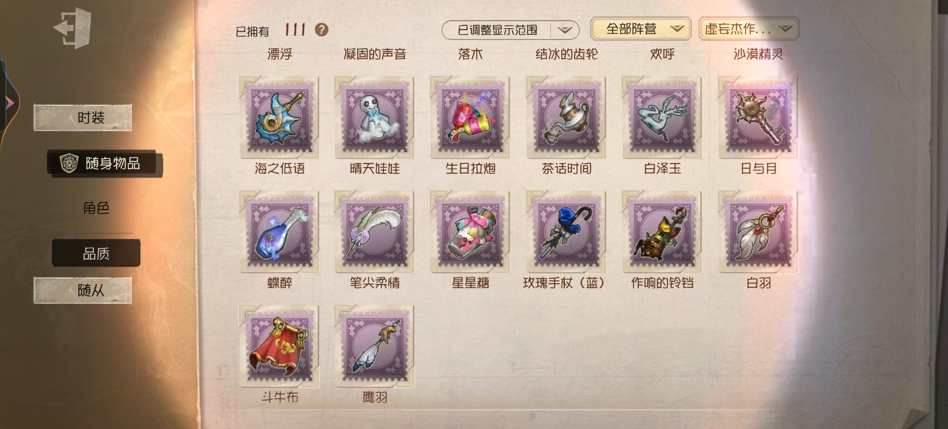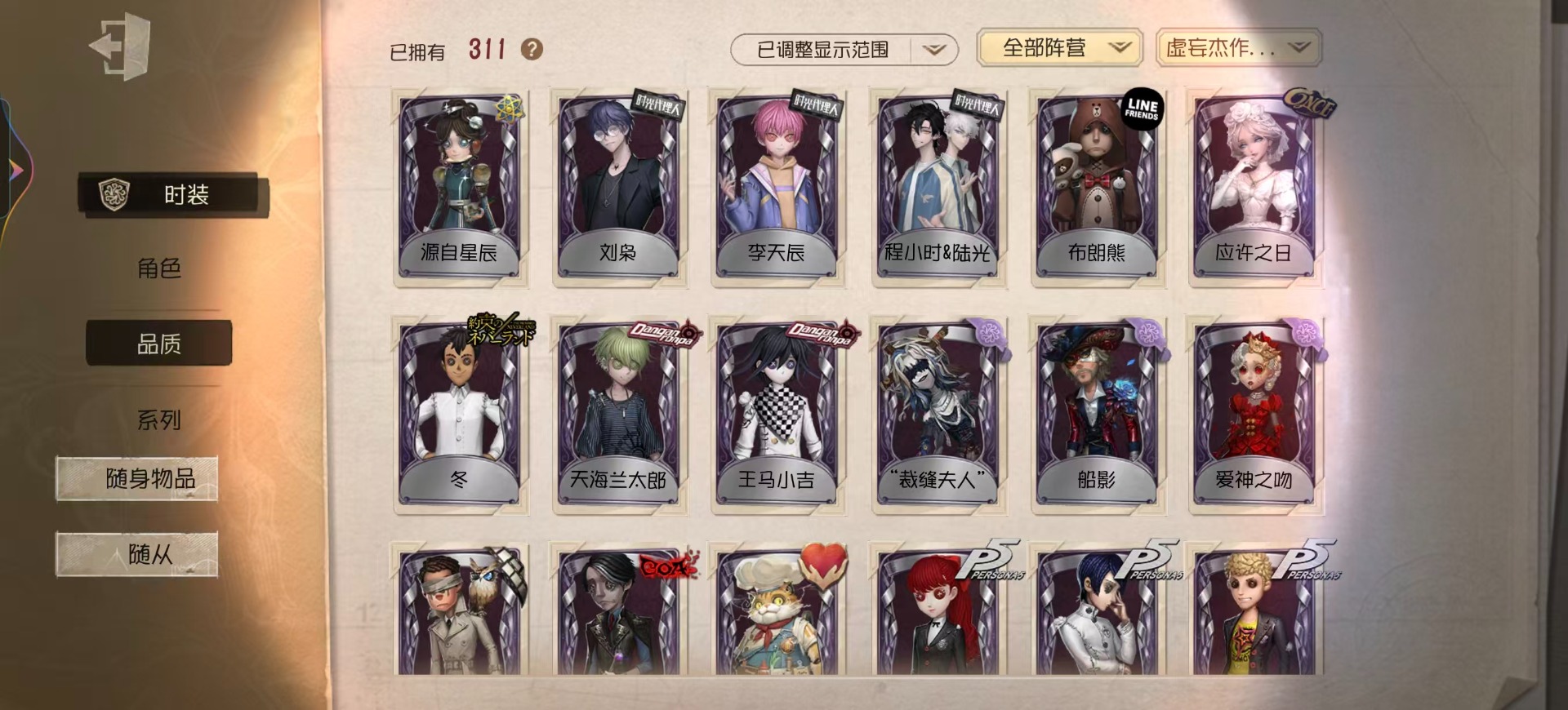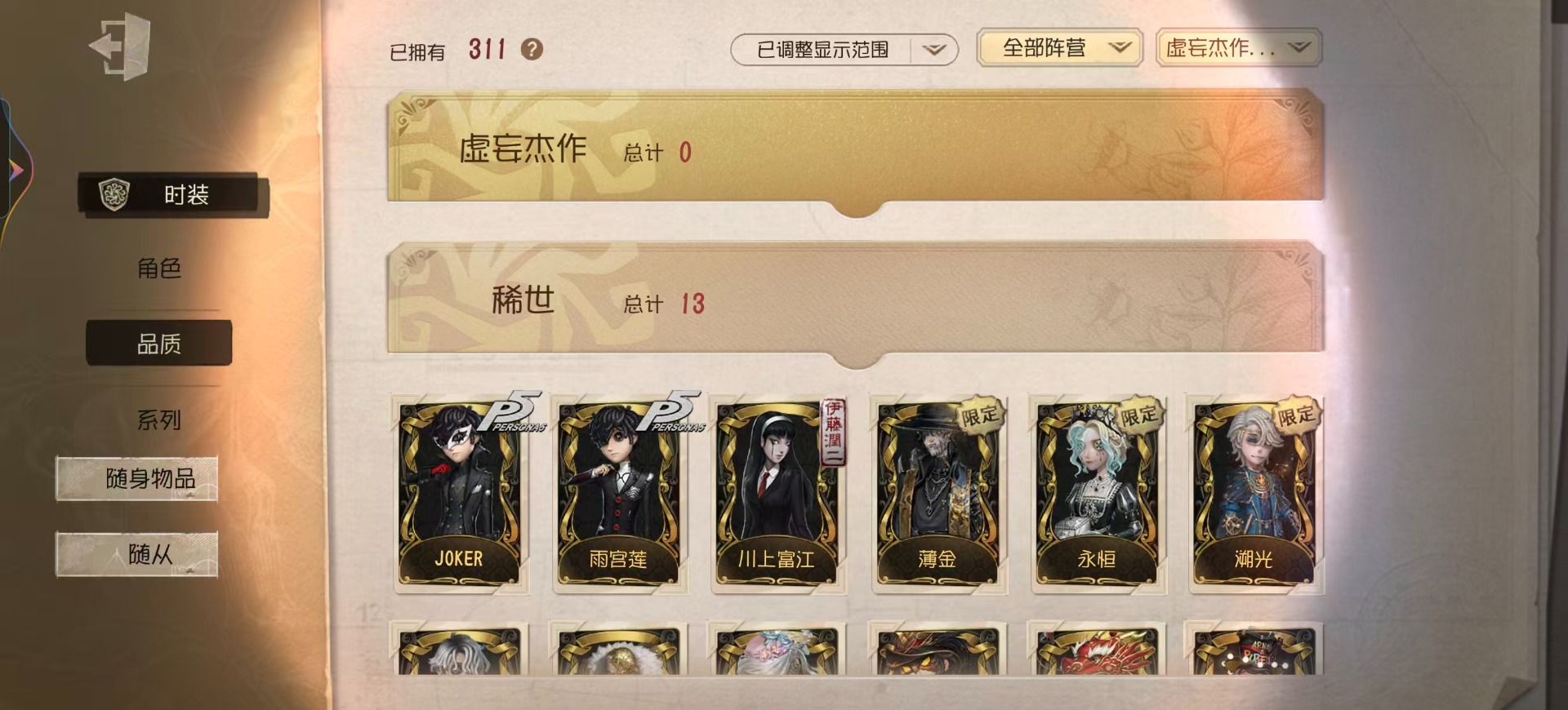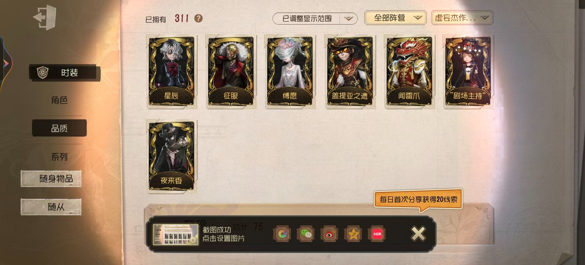 [16452073]vivo 手机账号 311时装 14金皮 75紫皮 15随从 111随身物品 【时装】园丁-源自星辰园丁-“剧场主持”爱丽丝·德罗斯-片刻闲暇勘探员-盖提亚之遗鹿头-闻雷爪画家-温暖的平安夜鹿头-镏金铜鹿拉拉队员-bishop-f1作曲家-先驱探索佣兵-布朗熊小丑-捣蛋裘克蜘蛛-水晶烛台杂技演员-雨宫莲杂技演员-joker杂技演员-可可豆记者-永恒空军-爱神之吻“囚徒”-天海兰太郎小说家-肖驰隐士-薄金 祭司-阿乌拉病患-溯光梦之女巫-裁缝夫人昆虫学者-缚愿记者-巡于归途26号守卫-秘密大厨病患-湖中影宿伞之魂-桃面书生幸运儿-蛋小黄的好朋友古董商-墨韵杂技演员-李天辰邮差-华生医生26号守卫-西部大亨机械师-佐仓双叶鹿头-阿努比斯鹿头-圣诞狂鹿鹿头-林间狩者鹿头-蒸汽朋克哭泣小丑-烟花盖伊厂长-“驯服”“博士”-征服病患-星辰“杰克”-夜来香舞女-香薰桑拿幸运儿-双一先知-月相园丁-奥村春先知-独行者先知-鸩孽蜥-狰梦之女巫-川上富江摄影师-en ligne入殓师-喜多川祐介宿伞之魂-十字路口的美少年 【随身物品】竹龙玉(稀世)灯龙影(稀世)海之低语(奇珍)进化稀世至识之眼稀世转位稀世凝固的声音奇珍沙漠精灵(奇珍)“密约”奇珍缚翼稀世拾贝奇珍结冰的齿轮(奇珍)茶话时间奇珍斗牛布奇珍日与月奇珍生日拉炮奇珍