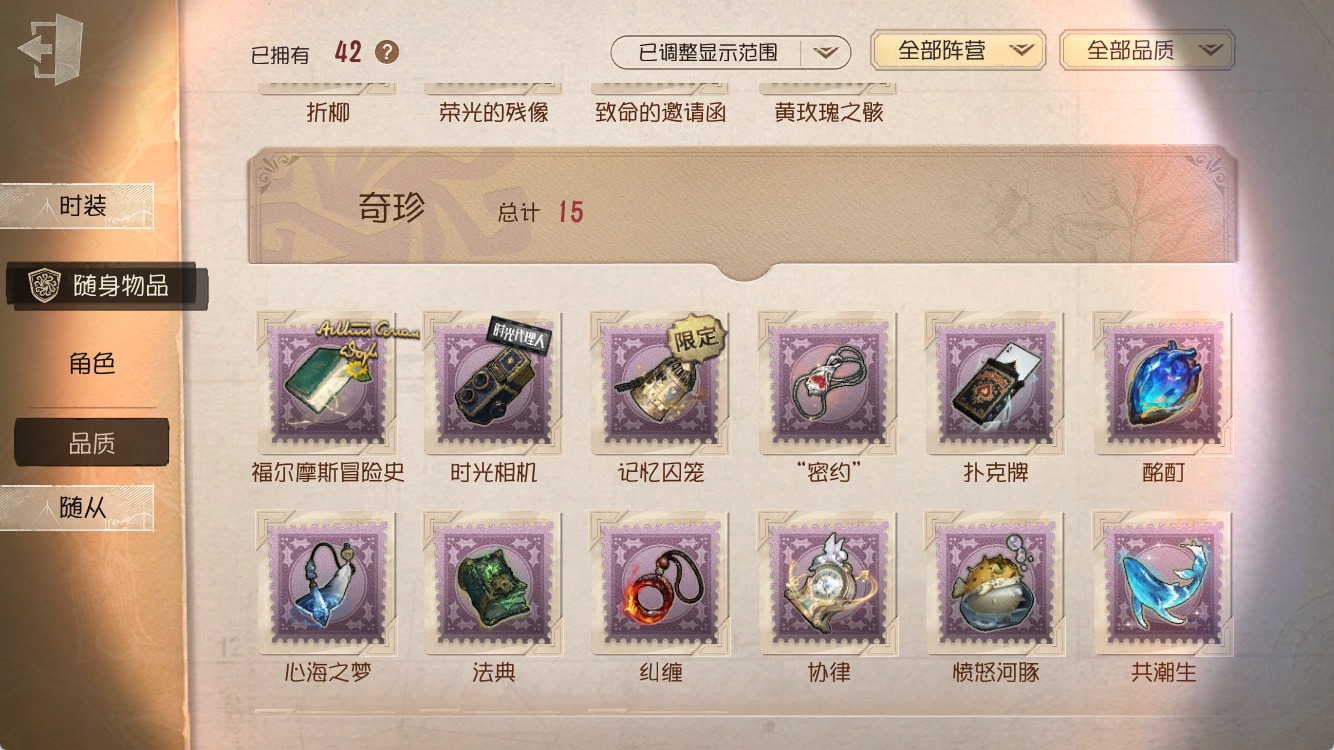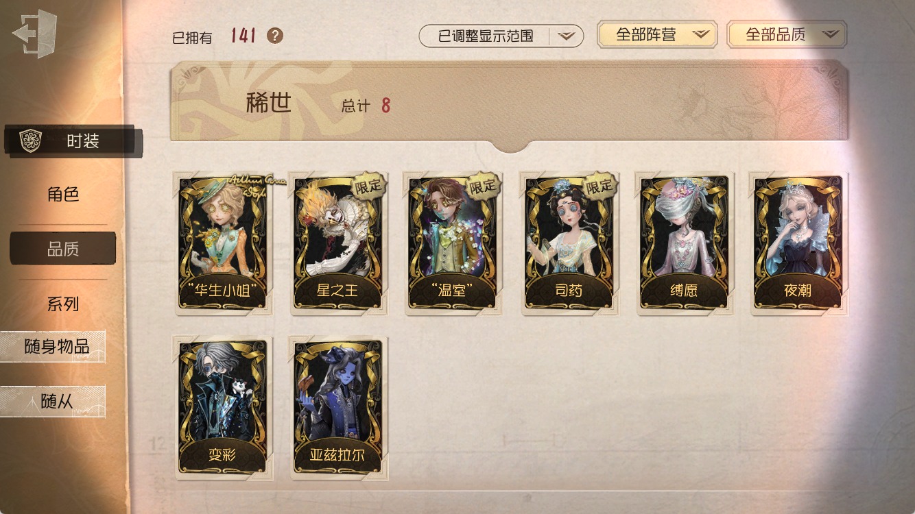 [16452128]安卓官服 手机账号 141时装 9金皮 42紫皮 5随从 42随身物品 【时装】爱丽丝·德罗斯-片刻闲暇佣兵-布朗熊“心理学家”-朱丽叶咒术师-噩之牙佣兵-b.duck潮小说家-肖驰入殓师-变彩教授-吟游诗人歌剧演员-拂晓女士昆虫学者-缚愿26号守卫-秘密大厨爱哭鬼-善恶的本性“法罗女士”-芳泽霞蜘蛛-聚光灯下舞女-流离的月光入殓师-“温室”囚徒-rice时空之影-“有机磷”医生-司药雕刻家-善忘的海马体骑士-艺术品商人记者-华生小姐“囚徒”-oph.luca哭泣小丑-熄灭的太阳“喧嚣”-星之王画家-多色印刷调酒师-校对人小说家-“伊始新篇”记者-梦境中的爱丽丝空军-黑天鹅之羽红夫人-夜潮“小女孩”-年岁“小女孩”-桃乐丝摄影师-亚兹拉尔宿伞之魂-程小时陆光 【随身物品】荣光的残像(稀世)愤怒河豚(奇珍)致命的邀请函稀世扑克牌奇珍记忆囚笼奇珍酩酊奇珍心海之梦奇珍福尔摩斯冒险史奇珍折柳稀世法典(奇珍)黄玫瑰之骸稀世科学的艺术奇珍共潮生奇珍协律奇珍时光相机奇珍