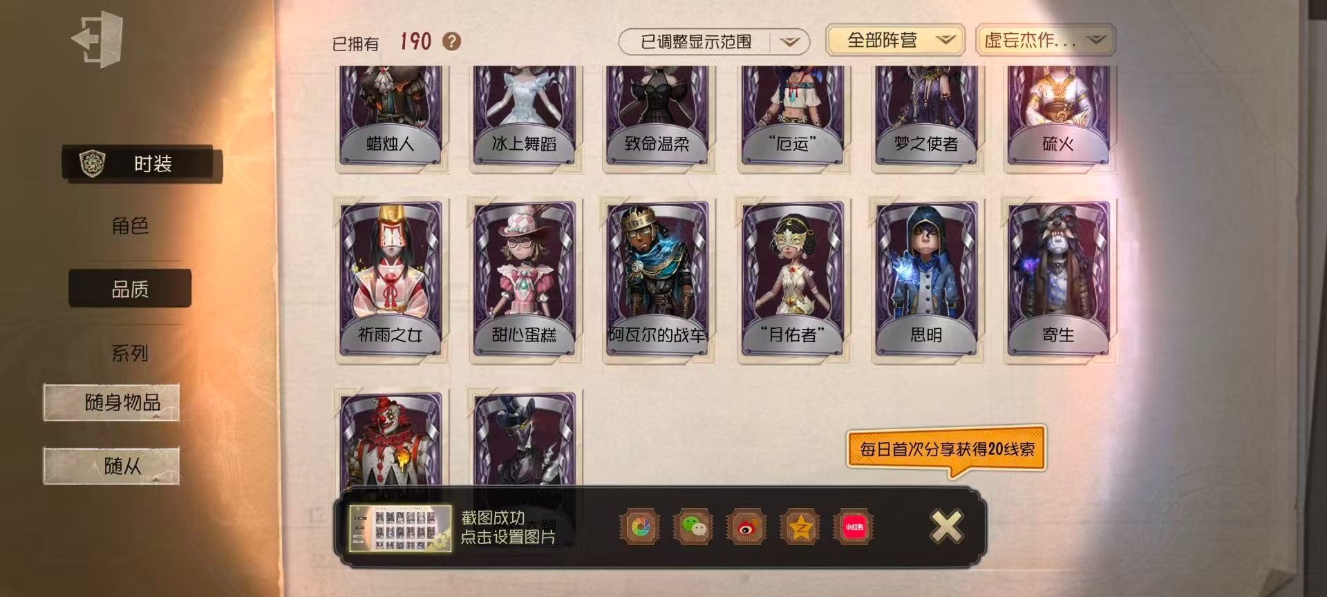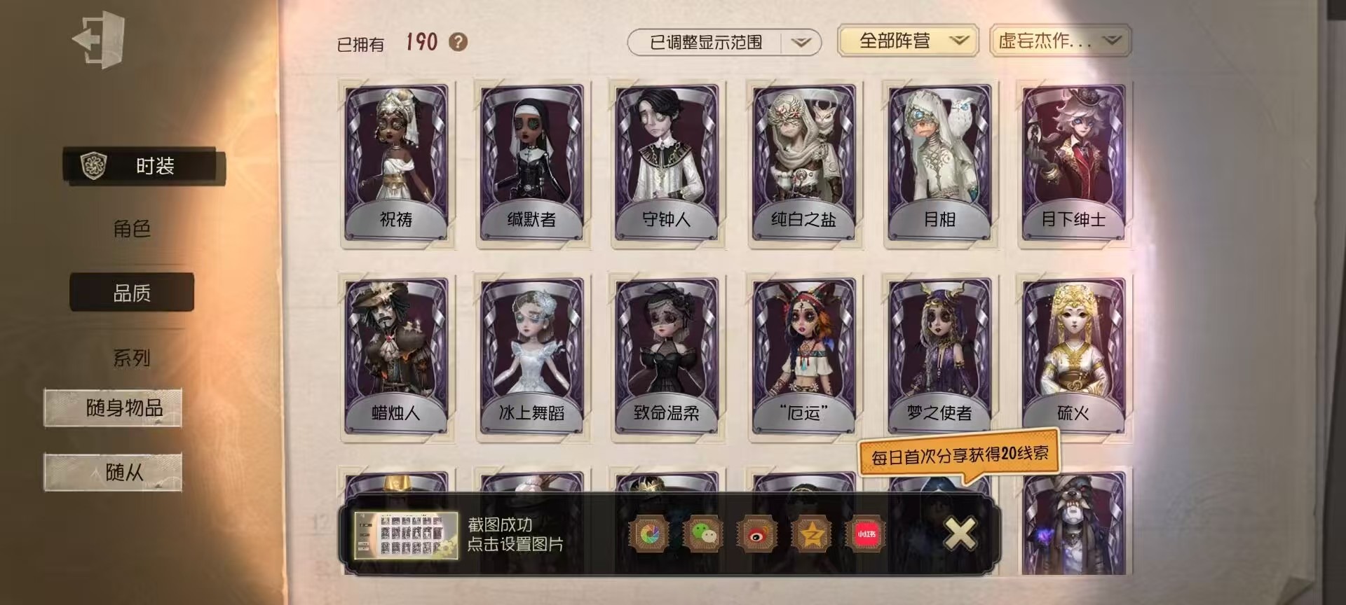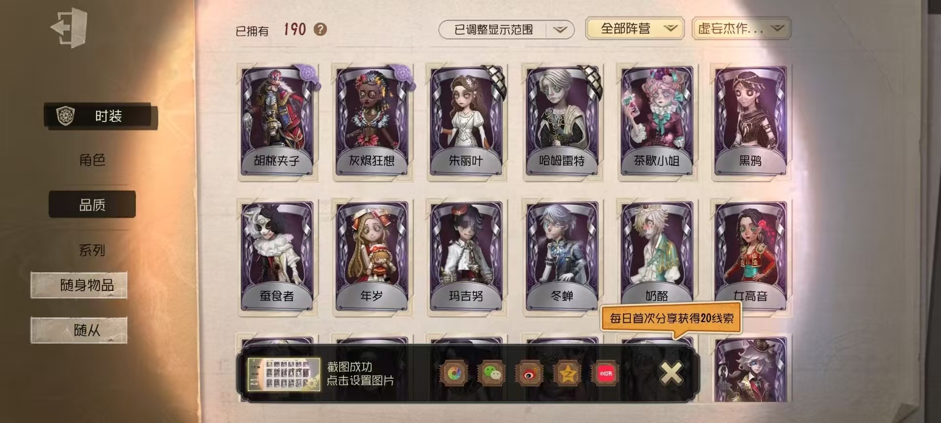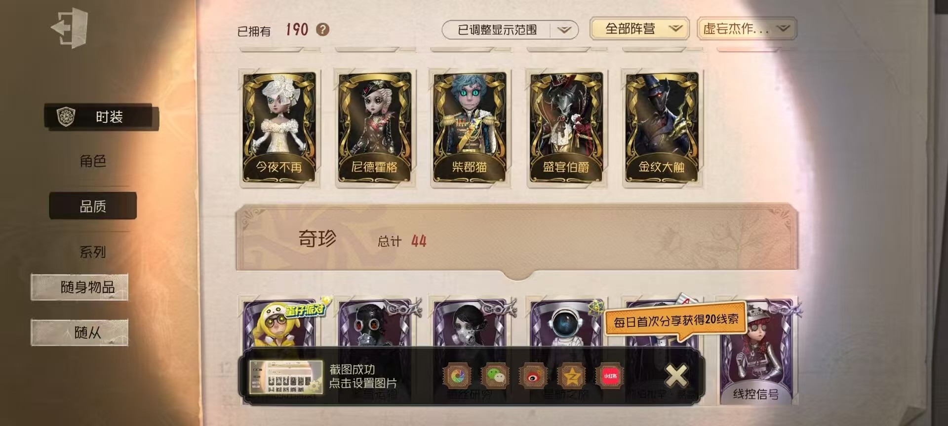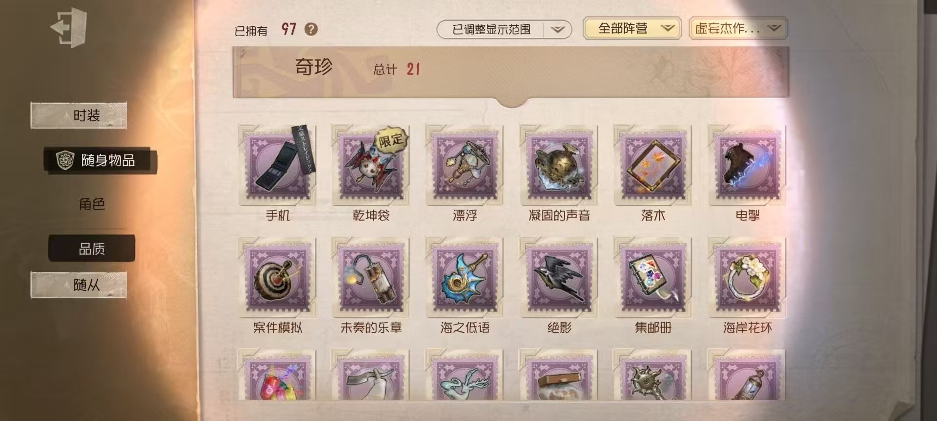 [16452371]oppo-非账号转移 手机账号 190时装 11金皮 44紫皮 12随从 97随身物品 【时装】教授-紧急运输古董商-菌丝研究“心理学家”-朱丽叶咒术师-灰烬狂想幸运儿-星航之旅佣兵-狛枝凪斗佣兵-中岛敦古董商-黑鸦律师-亚伯拉罕·葛雷破轮-胡桃夹子前锋-阿瓦尔的战车作曲家-猎龙者咒术师-椰香假日红蝶-硫火先知-纯白之盐气象学家-茶歇小姐幸运儿-蛋小黄的好朋友击球手-迫降专家空军-尼德霍格空军-樋口一叶祭司-梦之使者祭司-“厄运”哭泣小丑-蚕食者病患-玛吉努“杰克”-金纹大触画家-江户川乱步“杰克”-白纹大触“杰克”-盛宴伯爵红蝶-祈雨之女佣兵-思明舞女-“月佑者”玩具商-线控信号小丑-焗炉调香师-今夜不再调香师-冰上舞蹈调香师-花序调酒师-女高音调香师-致命温柔佣兵-寄生佣兵-柴郡猫“小女孩”-年岁盲女-甜心蛋糕前锋-冬盲女-吉尔达梦之女巫-川上富江牛仔-蜡烛人守墓人-奶酪摄影师-月下绅士宿伞之魂-亘古双星“囚徒”-冬蝉入殓师-哈姆雷特入殓师-守钟人 【随身物品】绝影(奇珍)海岸花环(奇珍)海之低语(奇珍)集邮册(奇珍)落木奇珍凝固的声音奇珍漂浮奇珍电掣(奇珍)案件模拟(奇珍)未奏的乐章(奇珍)机关囚笼奇珍火焰精灵奇珍匣中风云奇珍乾坤袋奇珍日与月奇珍