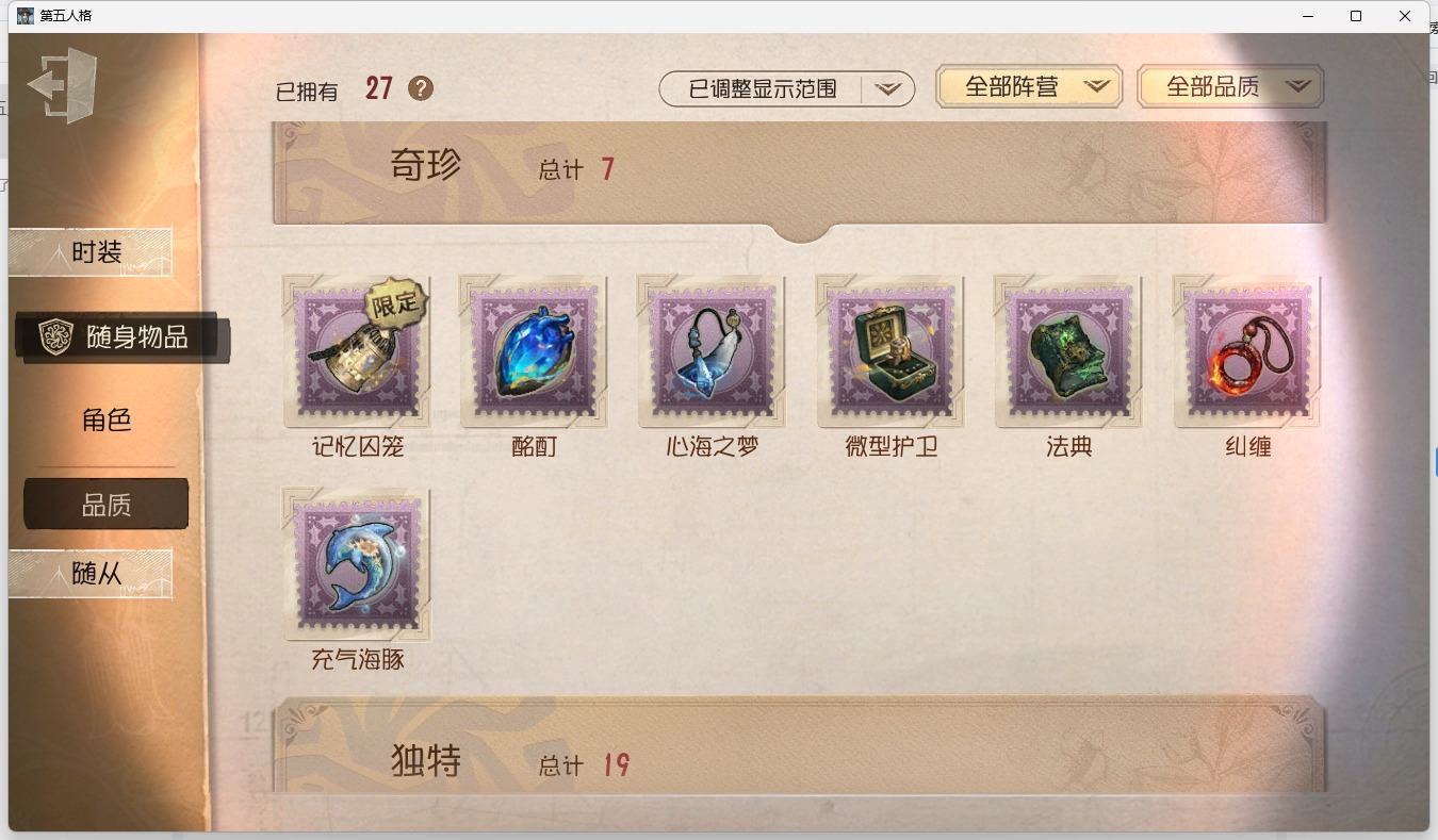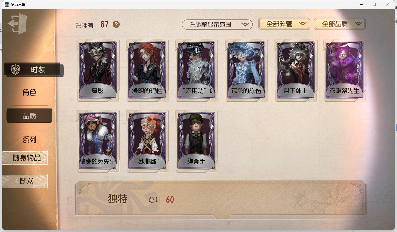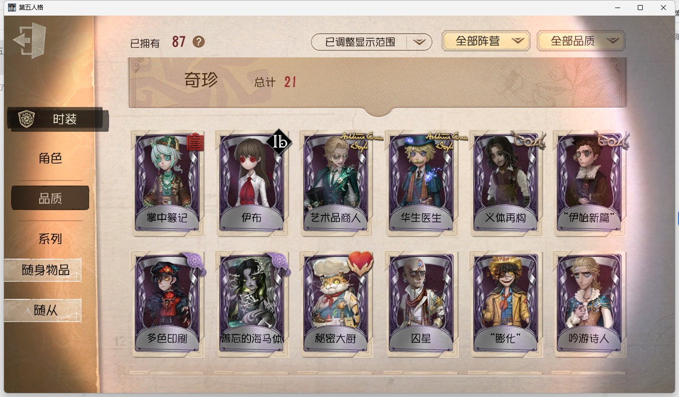 [16587398]安卓官服 邮箱账号 87时装 6金皮 21紫皮 3随从 27随身物品 【时装】爱丽丝·德罗斯-片刻闲暇“心理学家”-恒梦教授-吟游诗人病患-溯光记者-伊布黄衣之主-衣帽架先生击球手-无用功g昆虫学者-缚愿勘探员-妄念的陈伤画家-掌中篆记作曲家-暮影26号守卫-秘密大厨作曲家-澄明的理性勘探员-盛夏飞盘邮差-华生医生雕刻家-善忘的海马体骑士-艺术品商人画家-多色印刷木偶师-义体再构小说家-“伊始新篇”空军-“苏珊娜”佣兵-柴郡猫幸运儿-拉塔托斯克佣兵-弹簧手前锋-慵懒的兔先生摄影师-月下绅士 【随身物品】充气海豚奇珍记忆囚笼奇珍纠缠(奇珍)酩酊奇珍心海之梦奇珍微型护卫奇珍法典(奇珍)逆转之战稀世