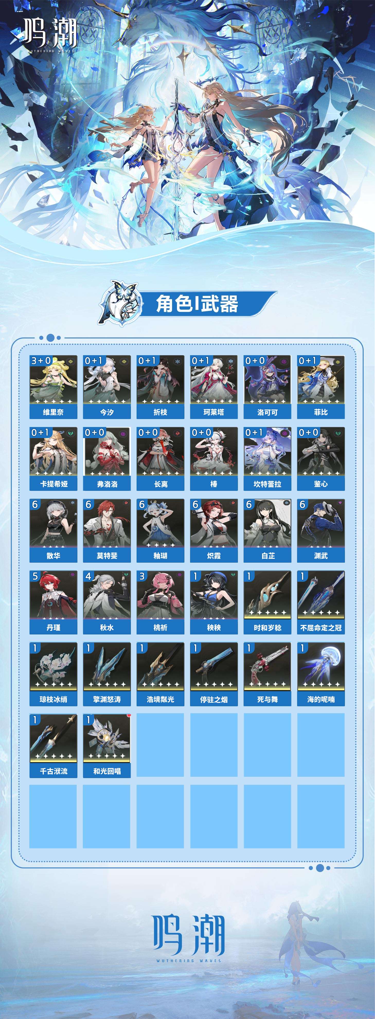 【鸣潮】【lymc4338】冒险等级:78,女主,五星数量:22,绑定情况:手机号__五星角色:维里奈 3命|今汐|长离|坎特蕾拉|菲比|珂莱塔|椿|折枝|洛可可|弗洛洛|卡提希娅|鉴心__五星武器:死与舞|不屈命定之冠|千古洑流|时和岁稔|和光回唱|琼枝冰绡|海的呢喃|擎渊怒涛|停驻之烟|浩境粼光__四星角色:散华 6命|釉瑚 6命|白芷 6命|炽霞 6命|渊武 6命|莫特斐 6命|丹瑾 5命|秋水 4命|桃祈 3命|秧秧 1命