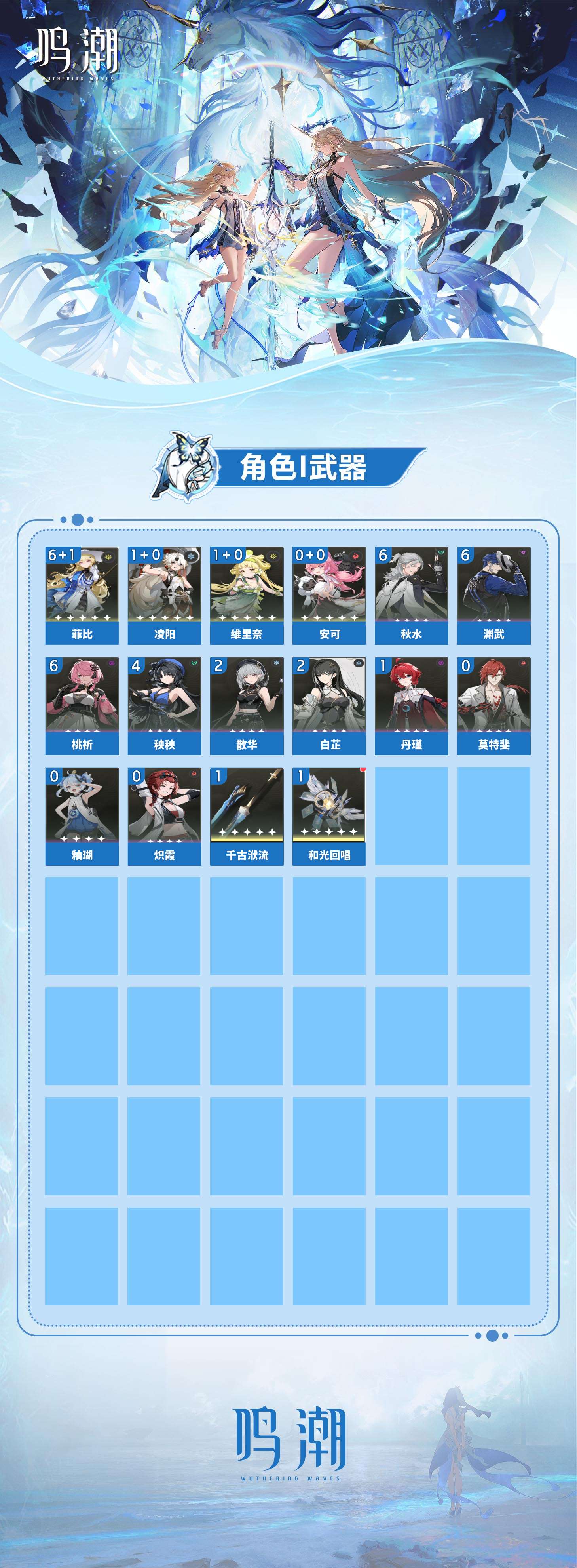 【鸣潮】【lymc6655】冒险等级:50,女主,五星数量:6,绑定情况:手机号__五星角色:菲比 6命|凌阳 1命|维里奈 1命|安可__五星武器:千古洑流|和光回唱__四星角色:渊武 6命|秋水 6命|桃祈 6命|秧秧 4命|白芷 2命|散华 2命|丹瑾 1命|炽霞|莫特斐|釉瑚