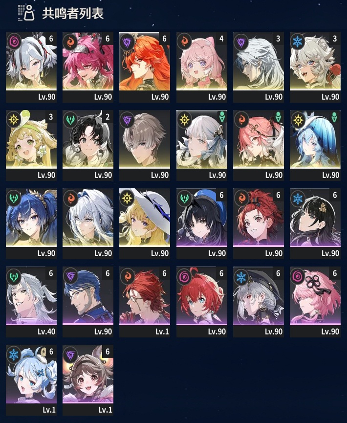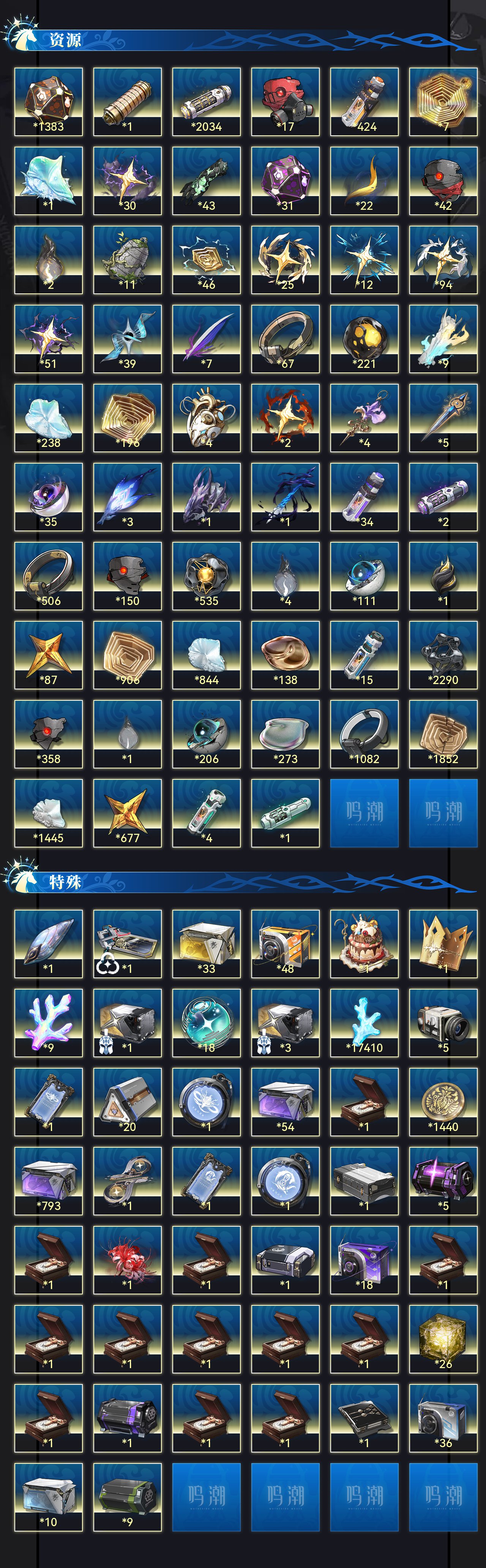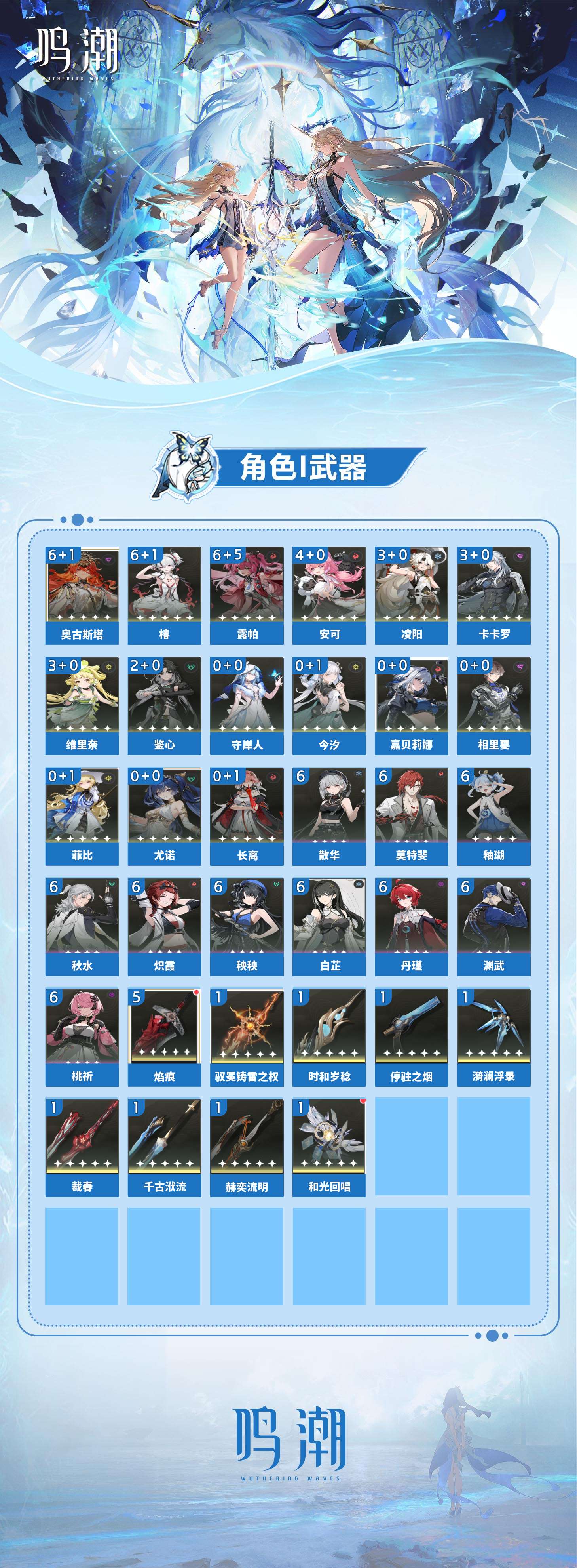 【鸣潮】【lymc6691】冒险等级:80,女主,五星数量:24,绑定情况:手机号__五星角色:椿 6命|露帕 6命|奥古斯塔 6命|安可 4命|卡卡罗 3命|凌阳 3命|维里奈 3命|鉴心 2命|相里要|今汐|长离|守岸人|尤诺|嘉贝莉娜|菲比__五星武器:焰痕 5精|千古洑流|停驻之烟|裁春|时和岁稔|赫奕流明|驭冕铸雷之权|漪澜浮录|和光回唱__四星角色:秧秧 6命|炽霞 6命|白芷 6命|秋水 6命|渊武 6命|莫特斐 6命|丹瑾 6命|散华 6命|桃祈 6命|釉瑚 6命